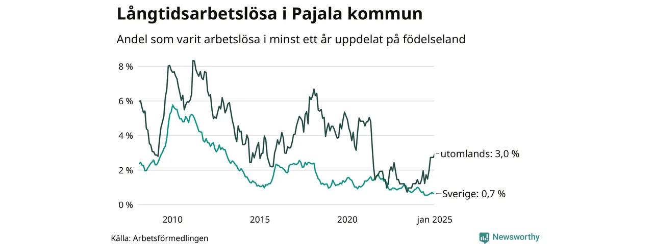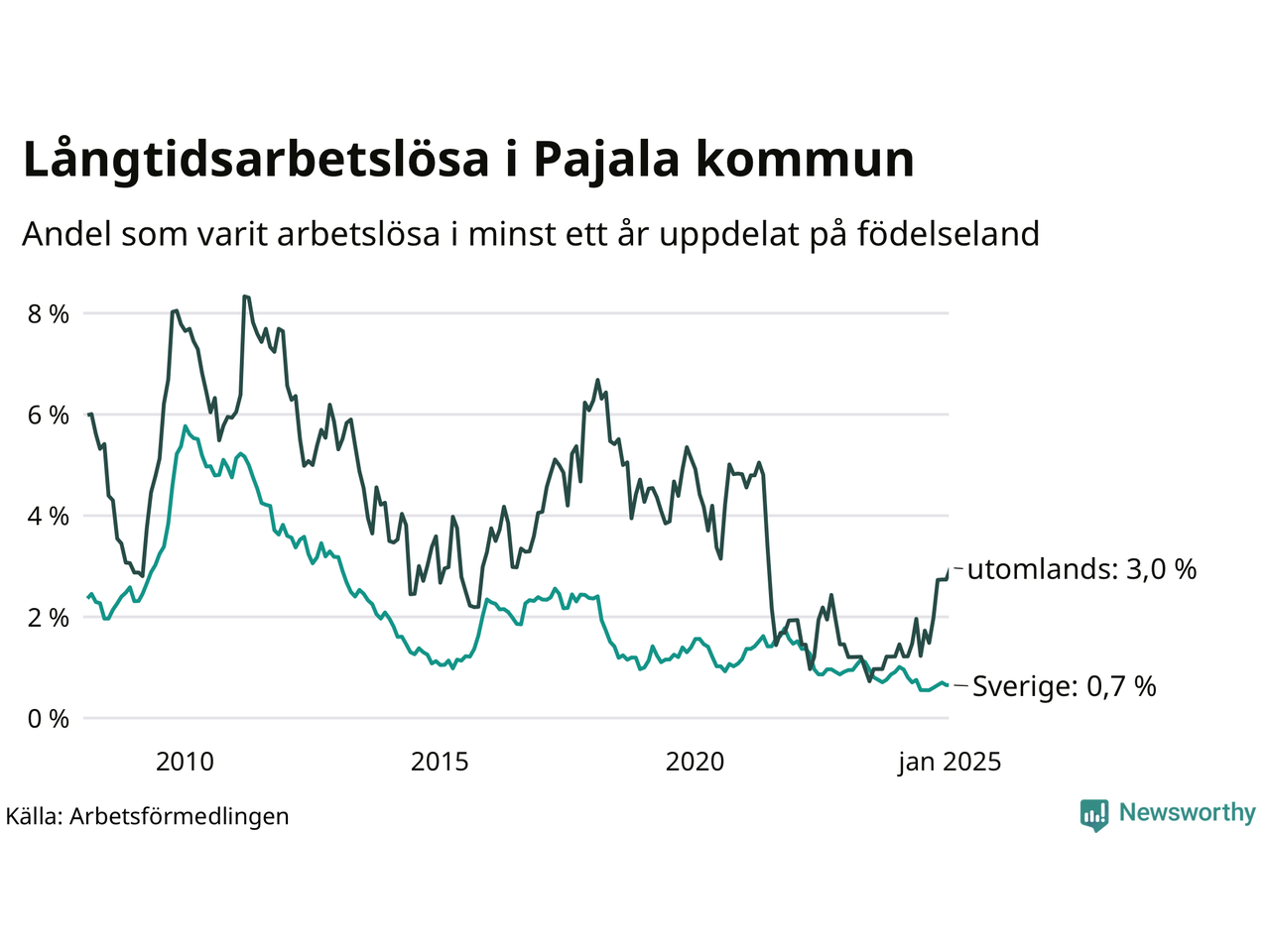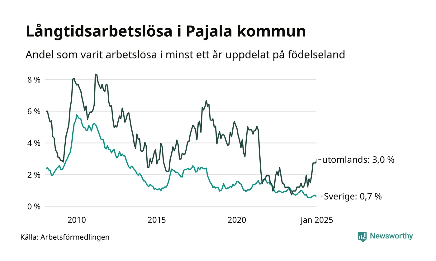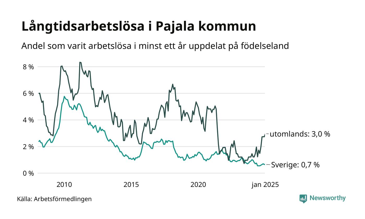 13 av de långtidsarbetslösa i Pajala är födda i Sverige, medan tolv är födda utomlands. Det innebär att långtidsarbetslösheten bland Sverigefödda är 0,7 procent, medan den är fyra gånger så hög – 3,0 procent – bland födda utomlands. Även i riket som helhet är arbetslösheten högre bland utrikesfödda.