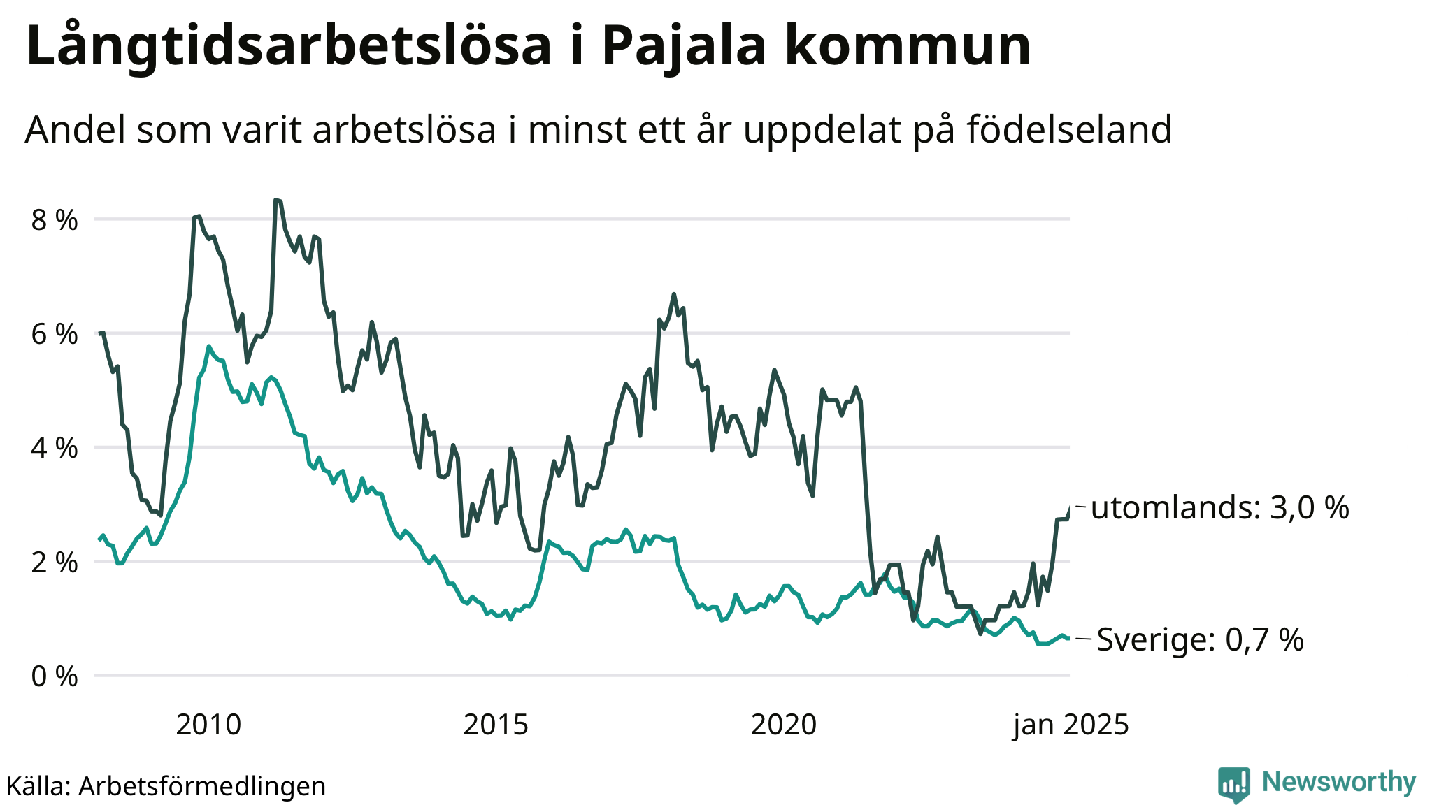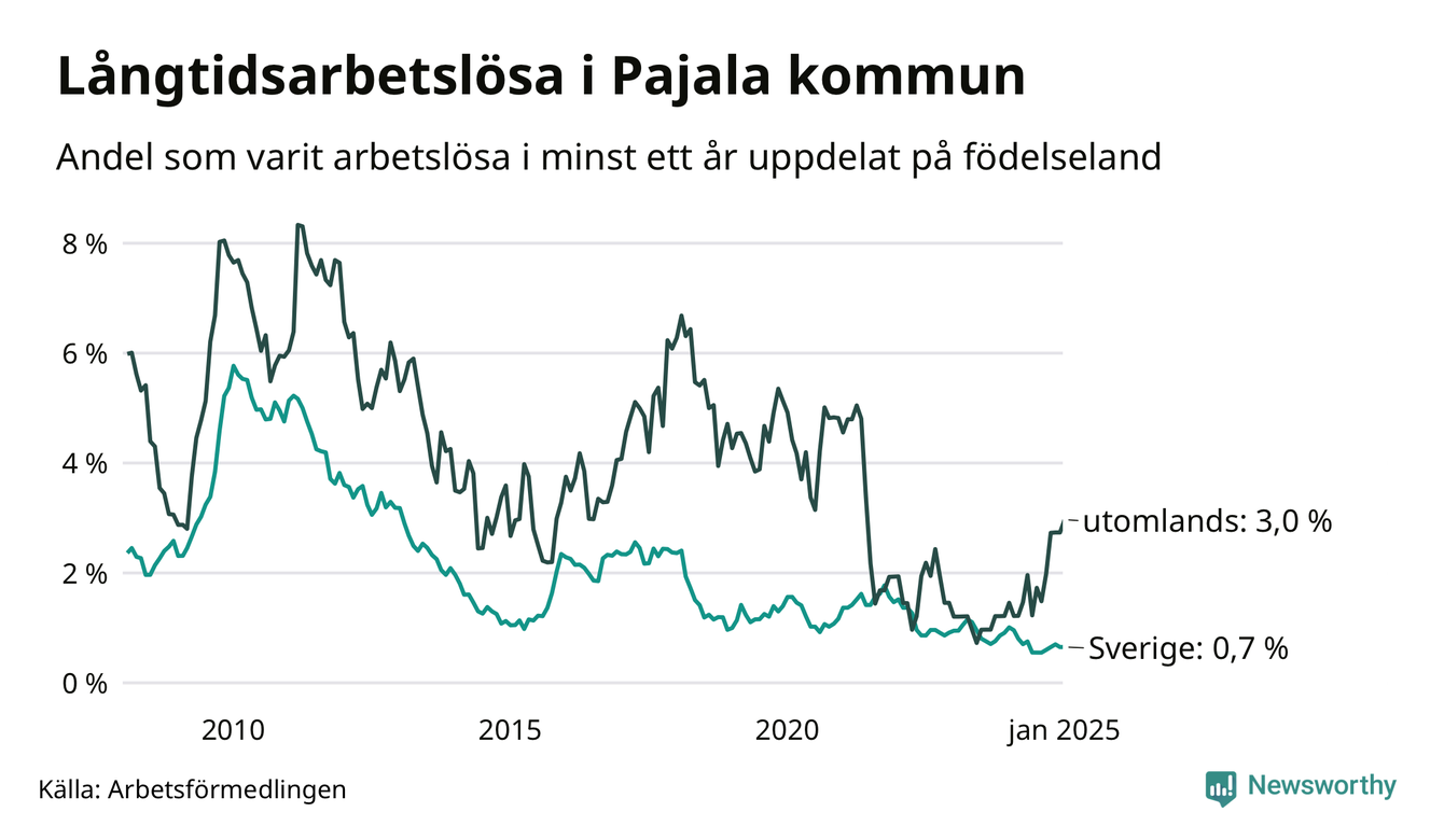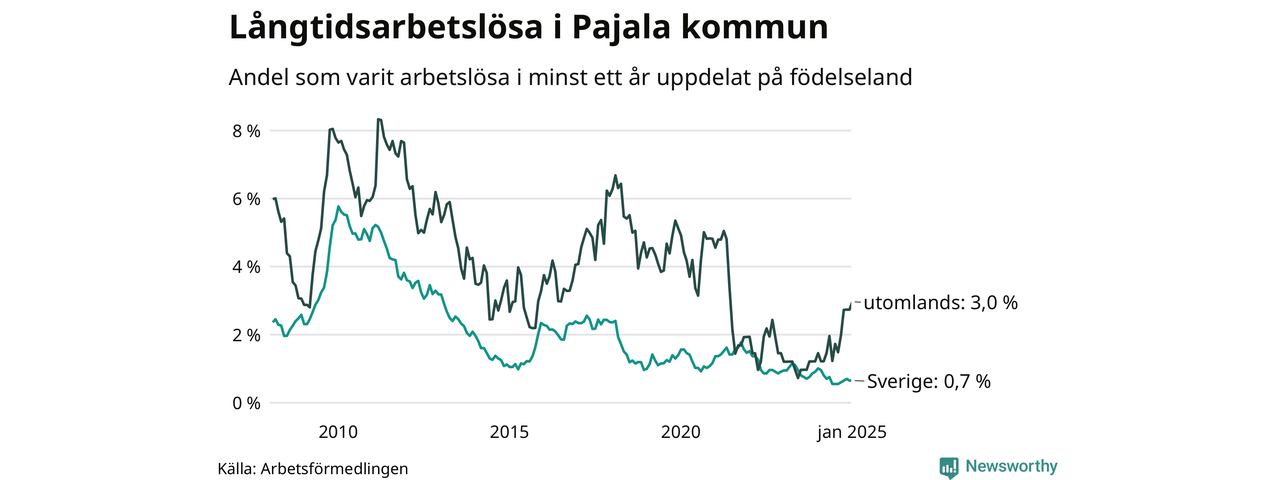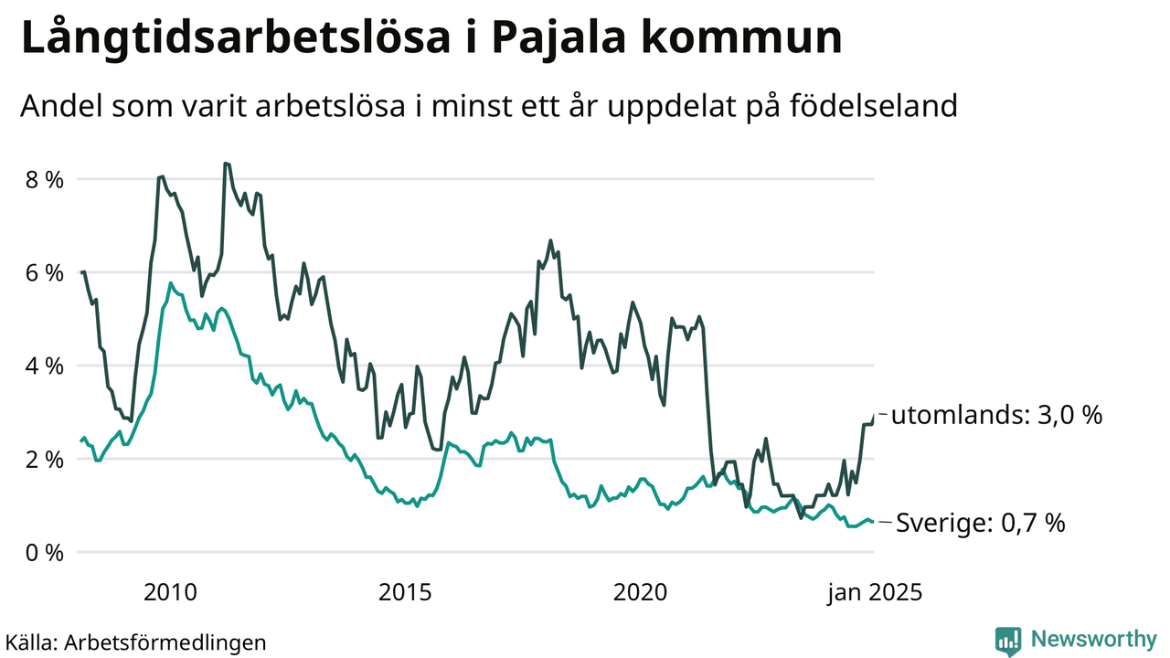 13 av de långtidsarbetslösa i Pajala är födda i Sverige, medan tolv är födda utomlands. Det innebär att långtidsarbetslösheten bland Sverigefödda är 0,7 procent, medan den är fyra gånger så hög – 3,0 procent – bland födda utomlands. Även i riket som helhet är arbetslösheten högre bland utrikesfödda.