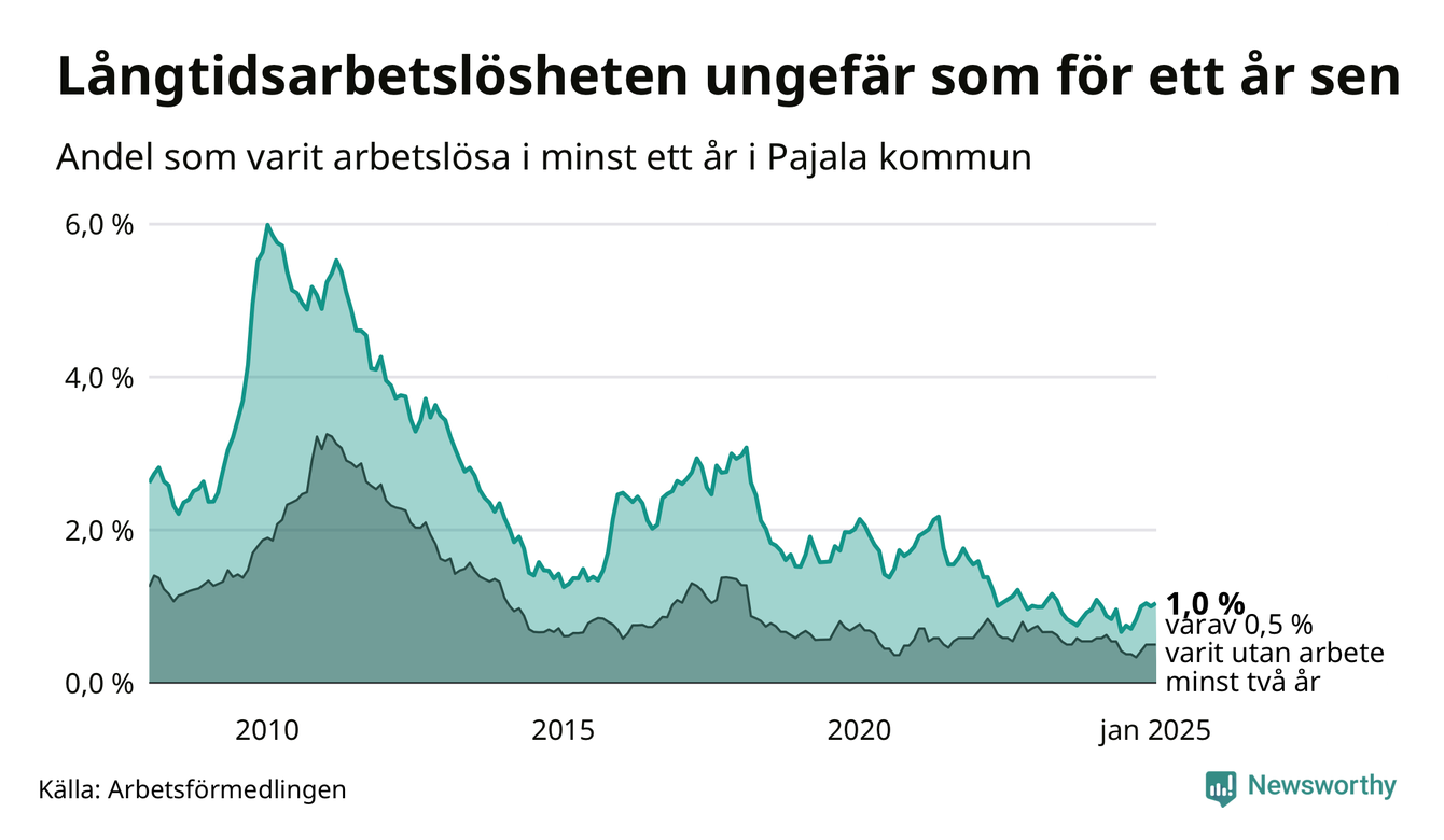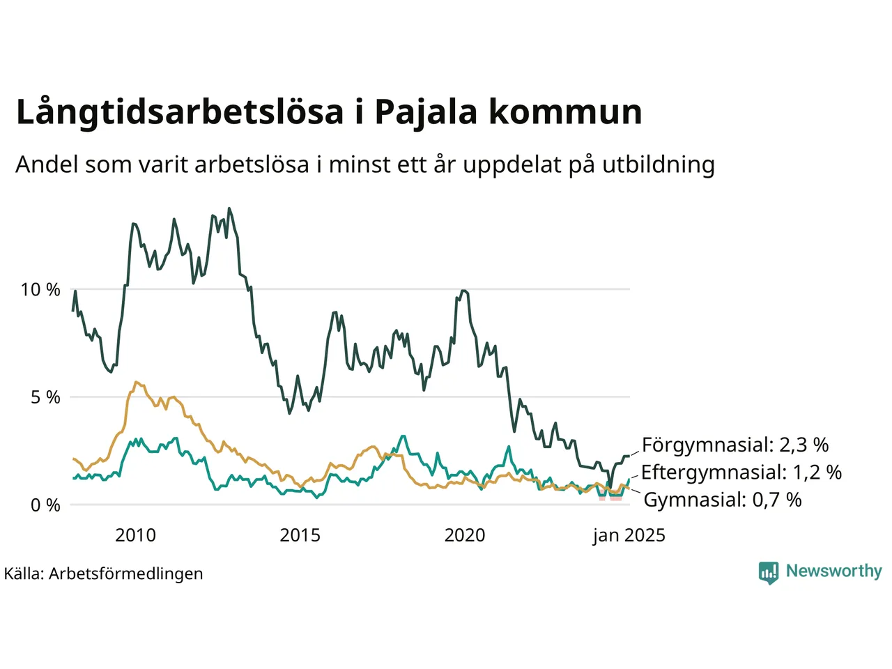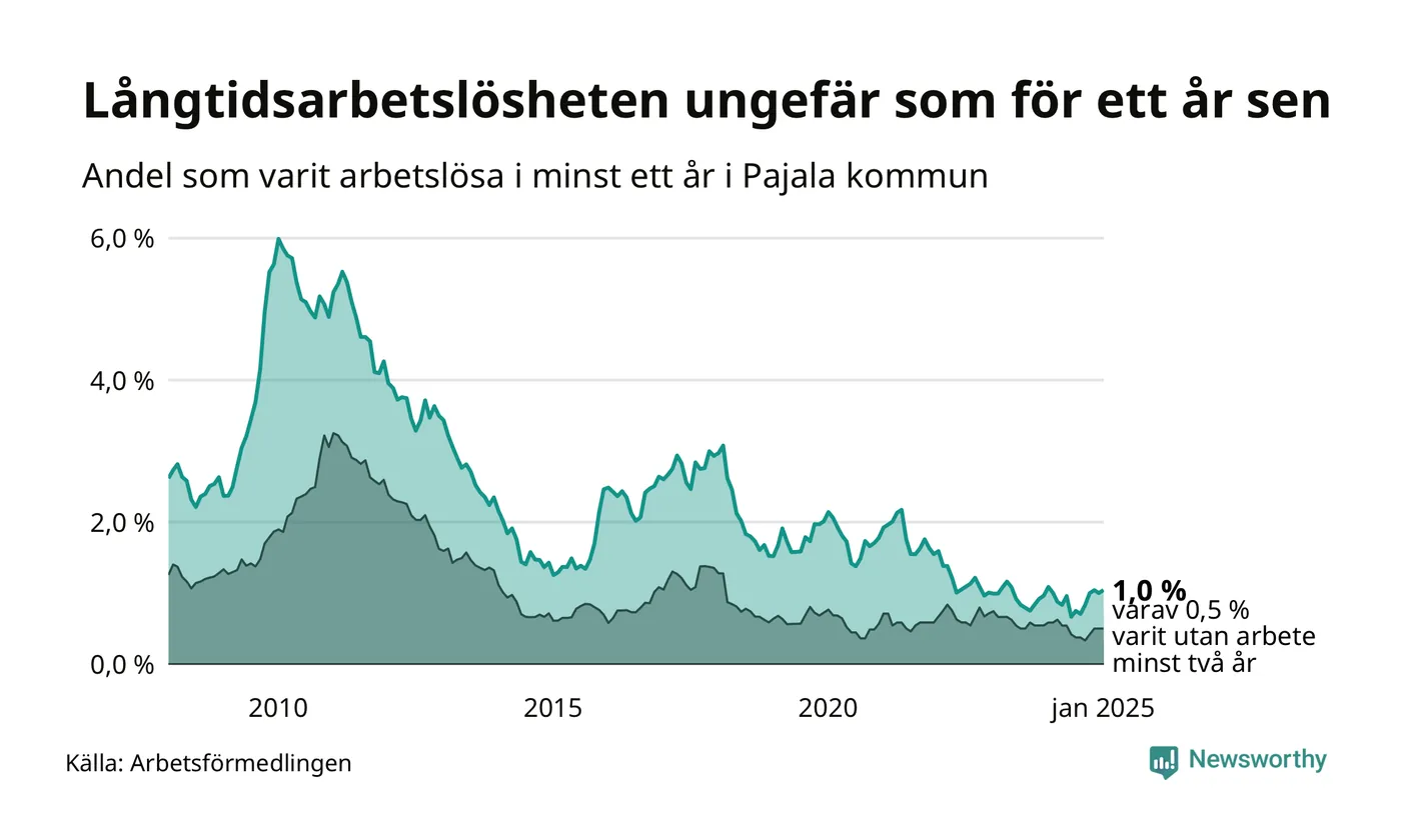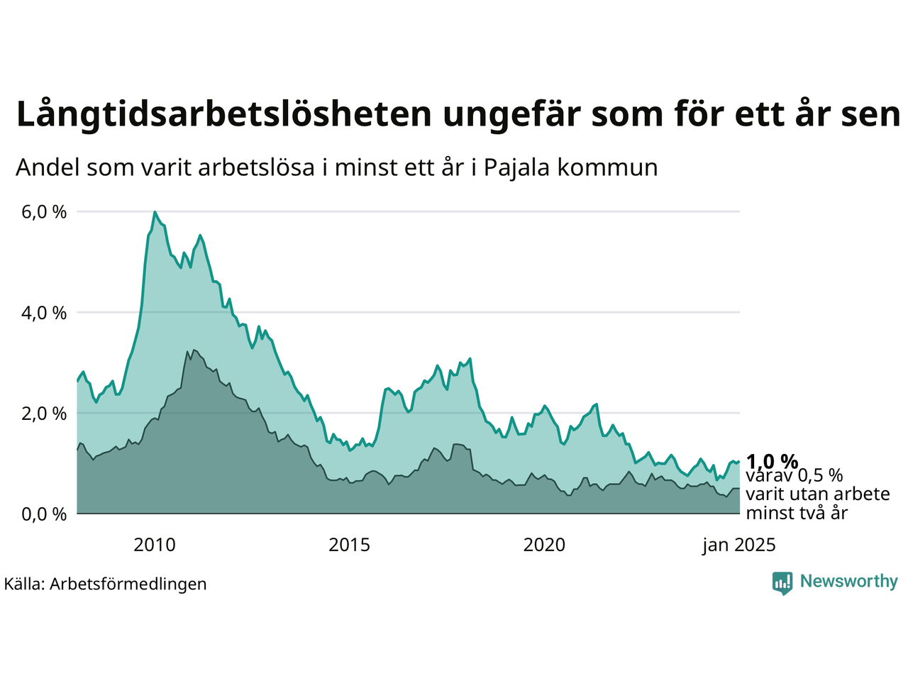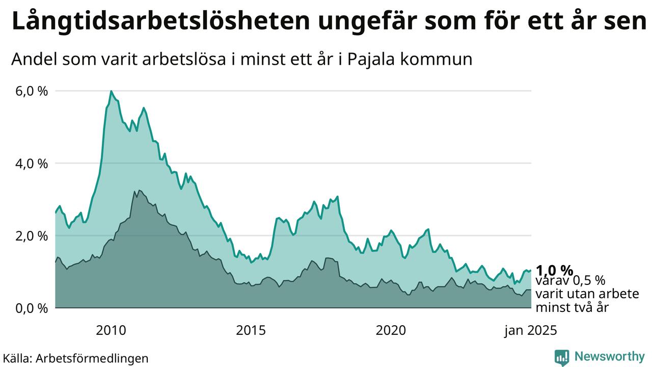 I januari hade 25 Pajalabor varit arbetslösa i minst ett år, vilket är en fler än månaden innan. 25 personer motsvarar 1,0 procent av arbetskraften i kommunen – andelen långtidsarbetslösa är ungefär på samma nivå som för ett år sedan. Pajala tillhör de kommuner som har lägst andel långtidsarbetslösa i hela landet just nu.