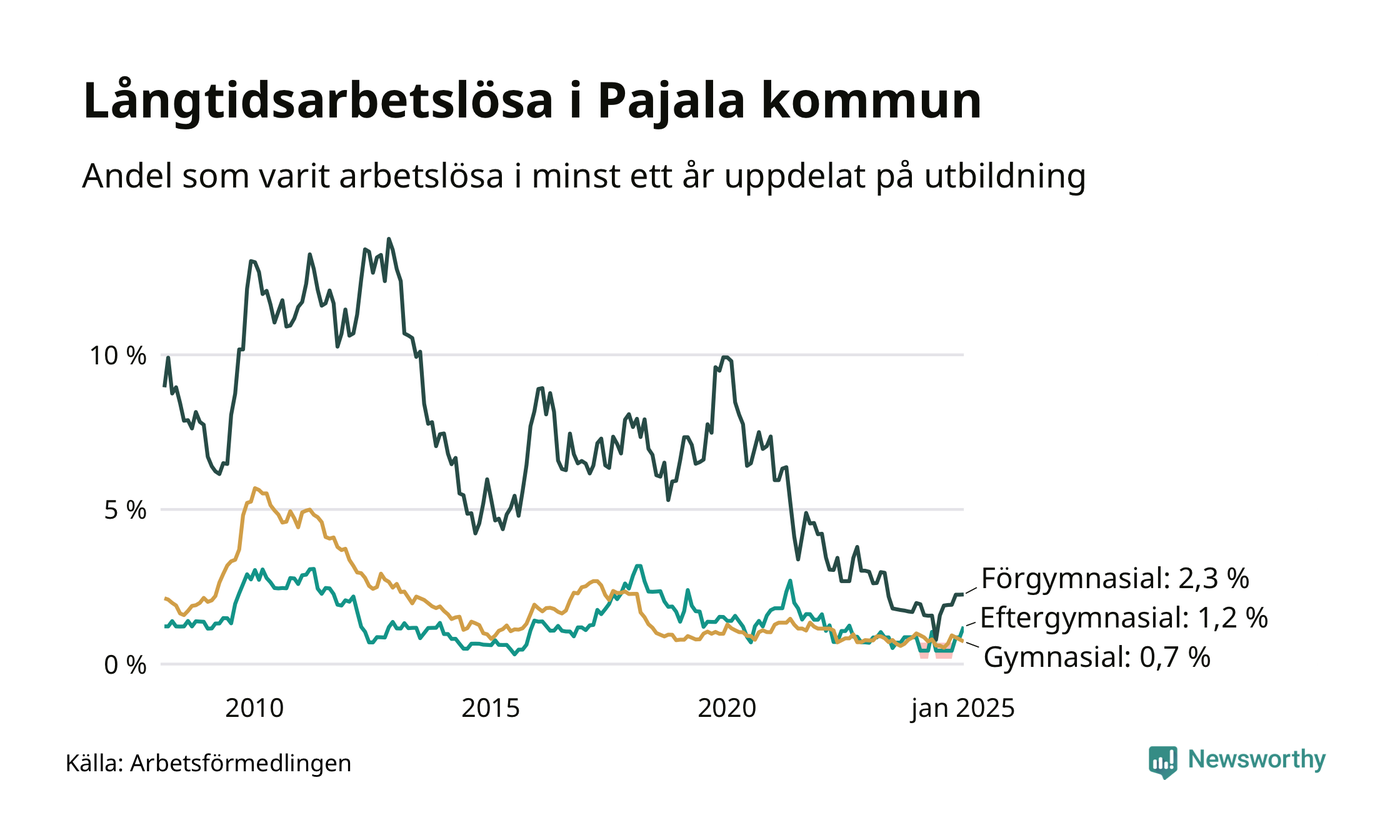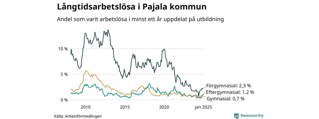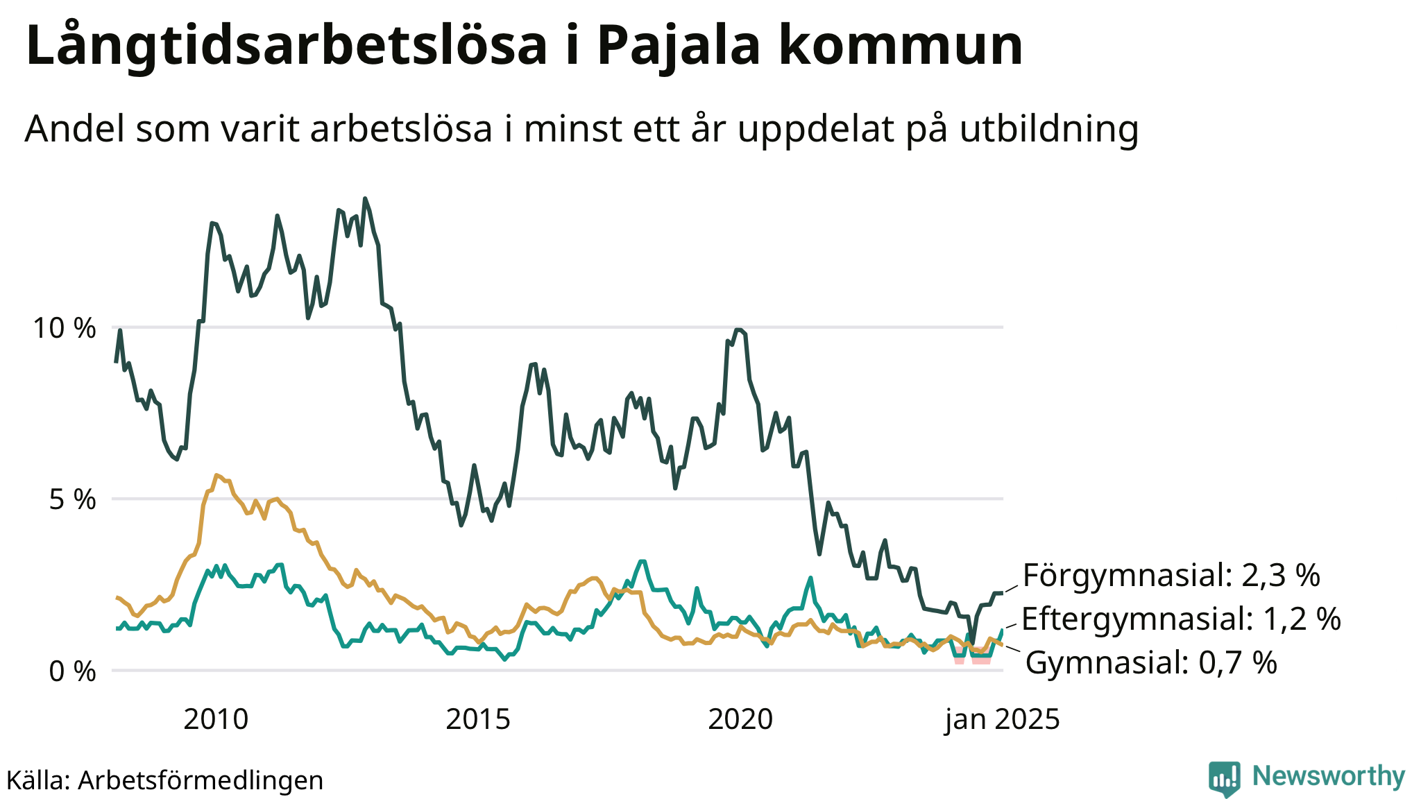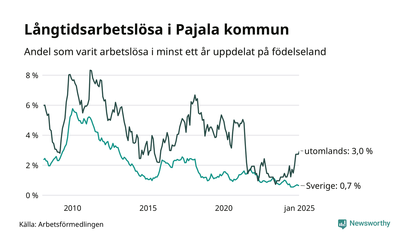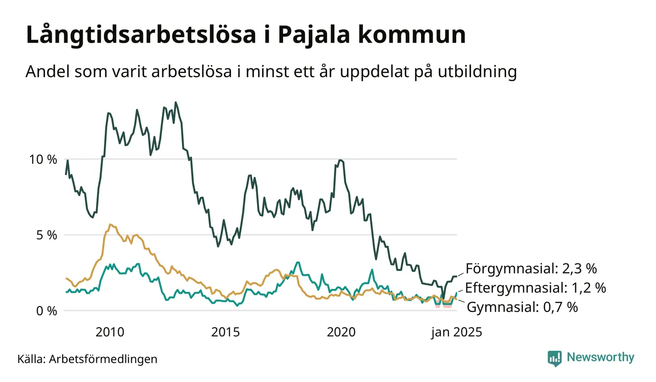 I januari hade 25 Pajalabor varit arbetslösa i minst ett år, vilket är en fler än månaden innan. 25 personer motsvarar 1,0 procent av arbetskraften i kommunen – andelen långtidsarbetslösa är ungefär på samma nivå som för ett år sedan. Pajala tillhör de kommuner som har lägst andel långtidsarbetslösa i hela landet just nu.