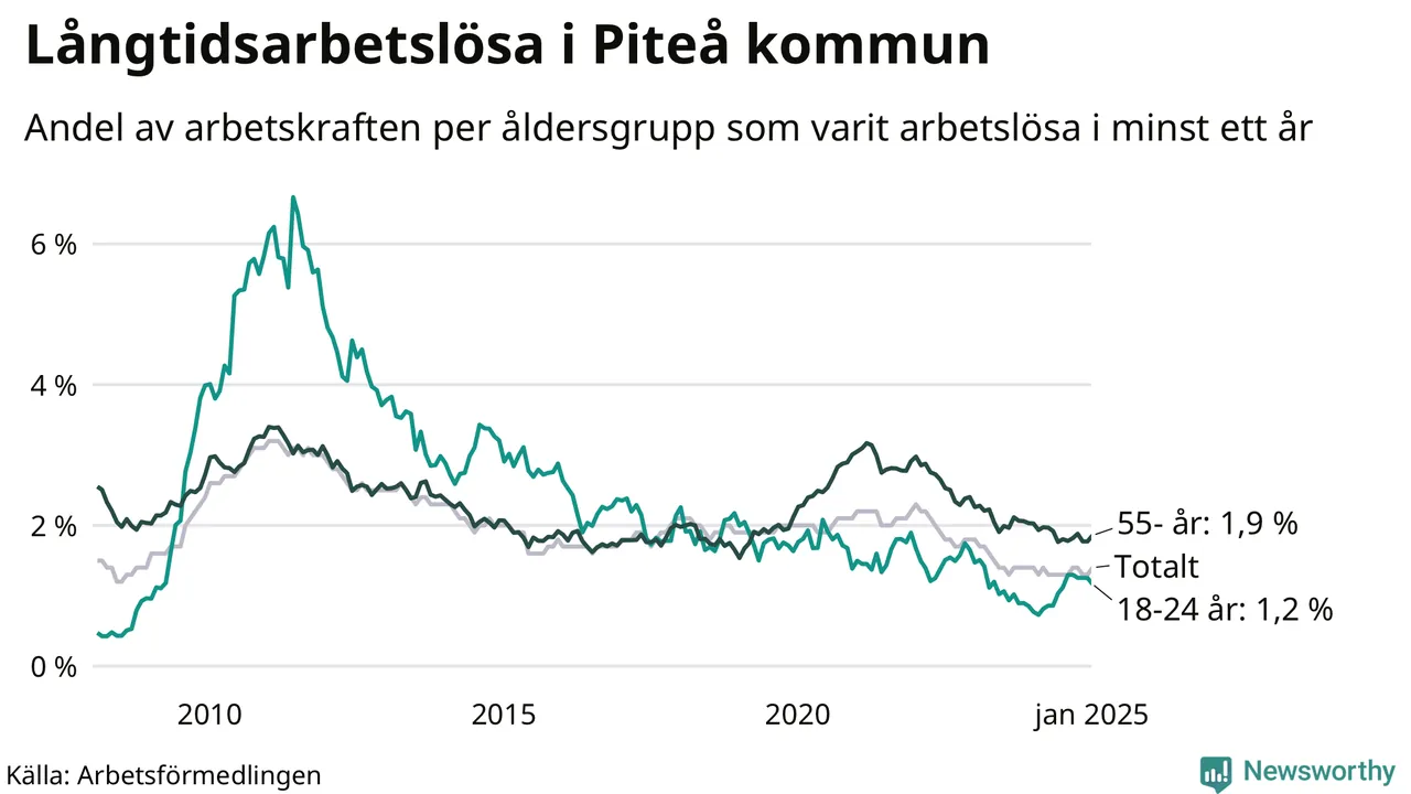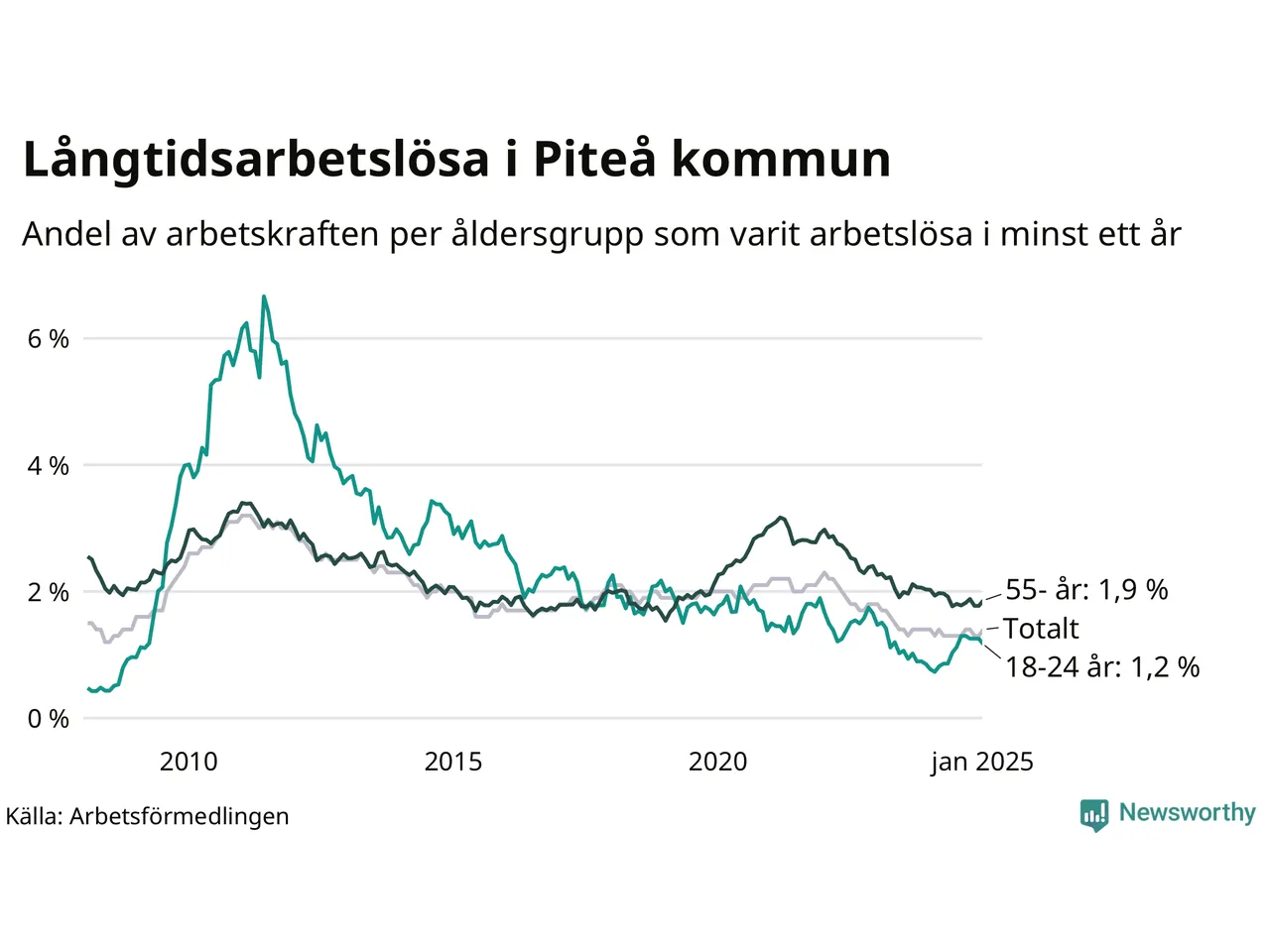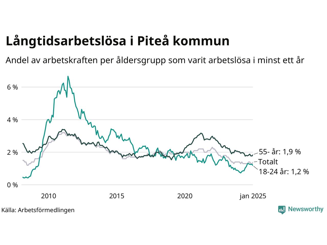 Av de 292 personerna som varit arbetslösa i mer än ett år i Piteå kommun är 87 personer mellan 55 och 651 år och 27 är mellan 18 och 24 år. För den äldre gruppen är andelen arbetslösa 1,9 procent medan den i den yngre gruppen är 1,2 procent. Även i riket som helhet är långtidsarbetslösheten högre i gruppen äldre.