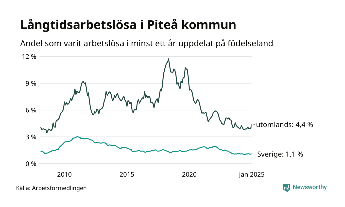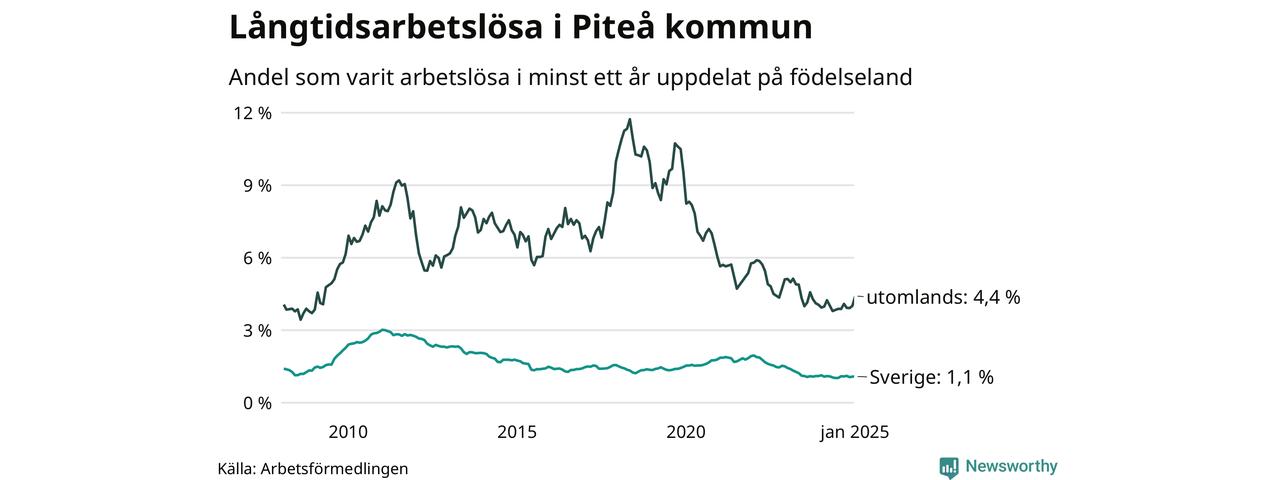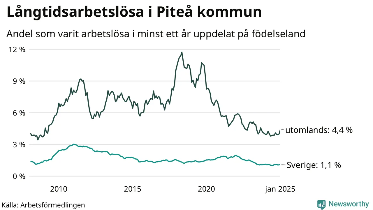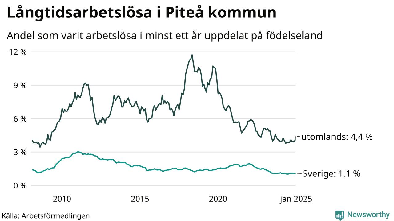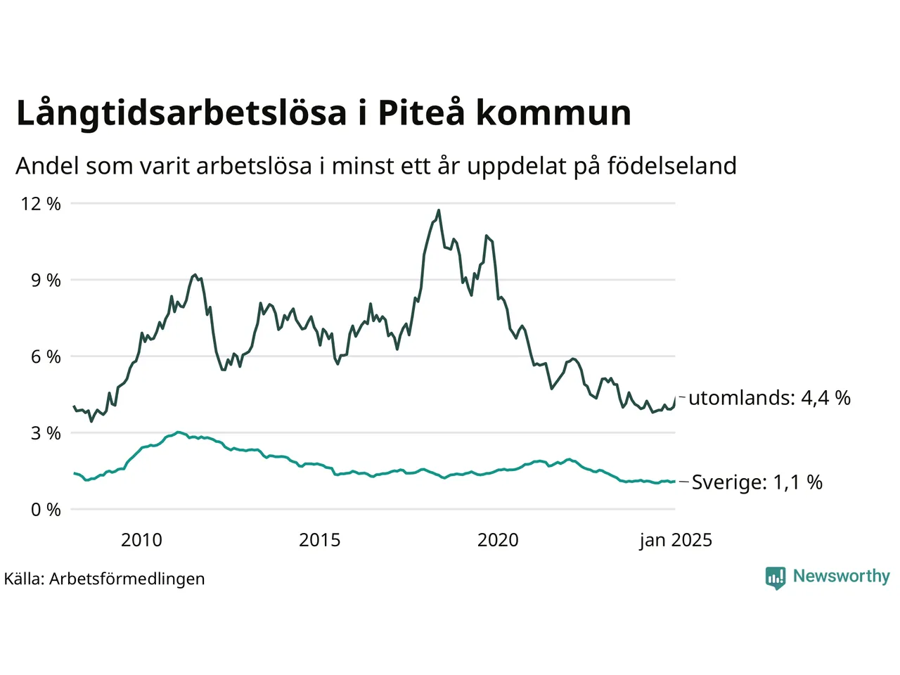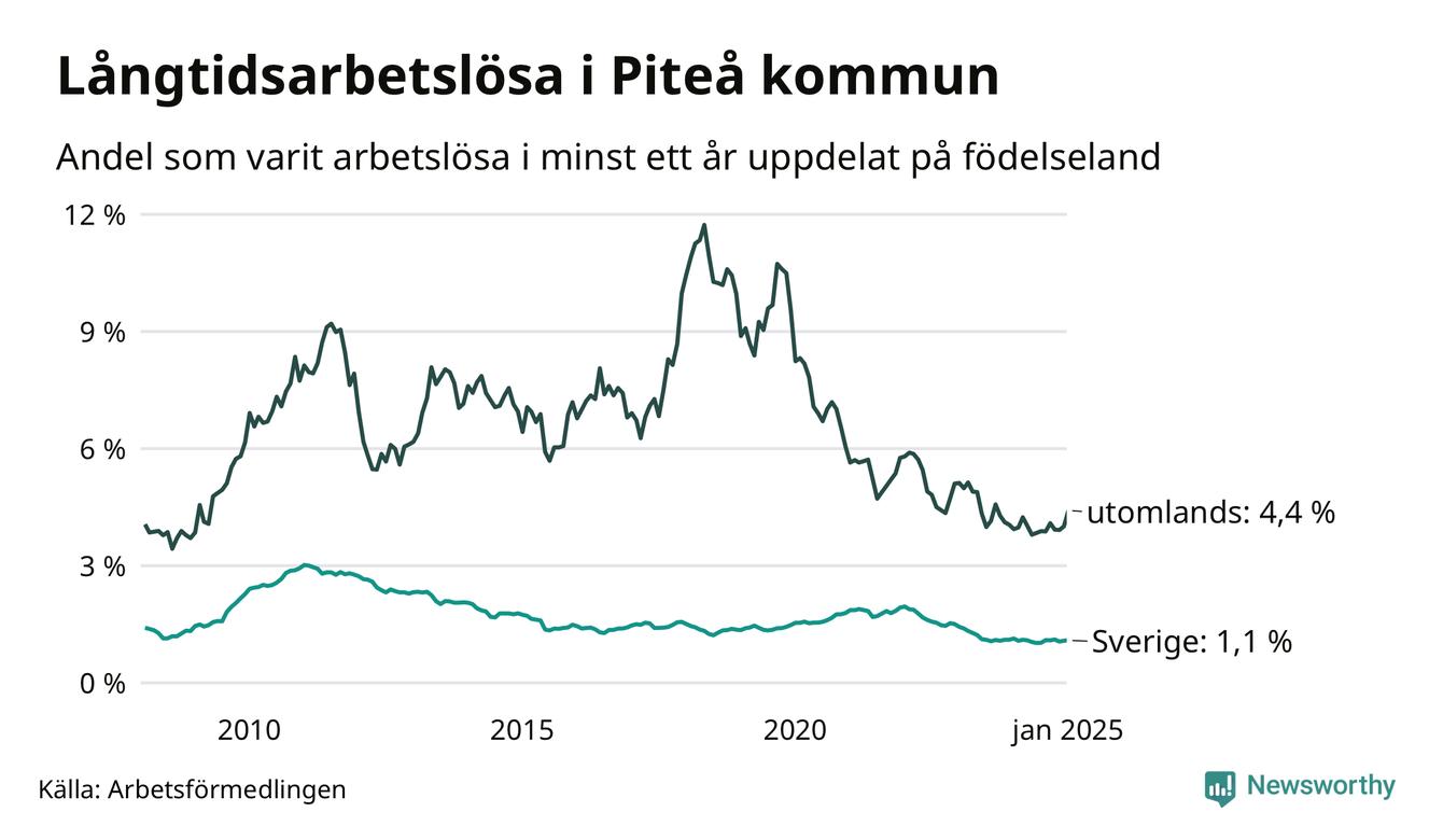 208 av de långtidsarbetslösa i Piteå är födda i Sverige, medan 84 är födda utomlands. Det innebär att långtidsarbetslösheten bland Sverigefödda är 1,1 procent, medan den är fyra gånger så hög – 4,4 procent – bland födda utomlands. Även i riket som helhet är arbetslösheten högre bland utrikesfödda.