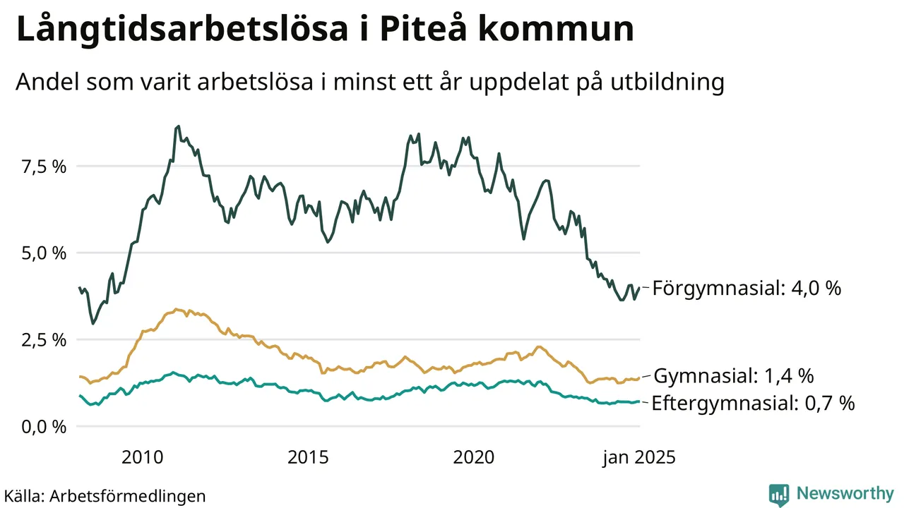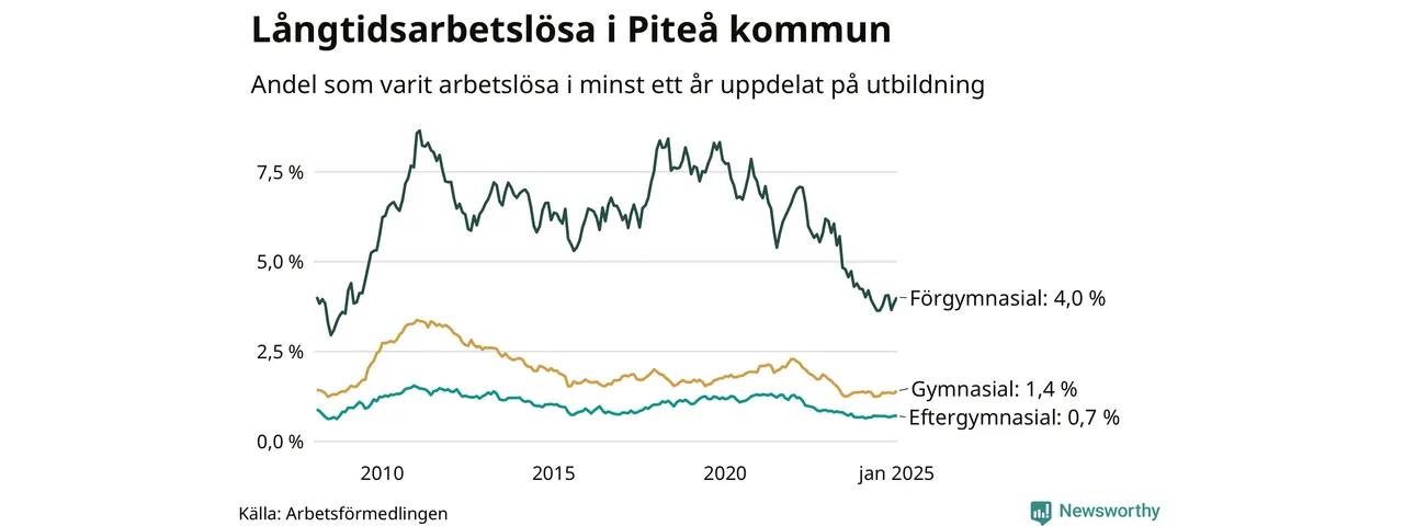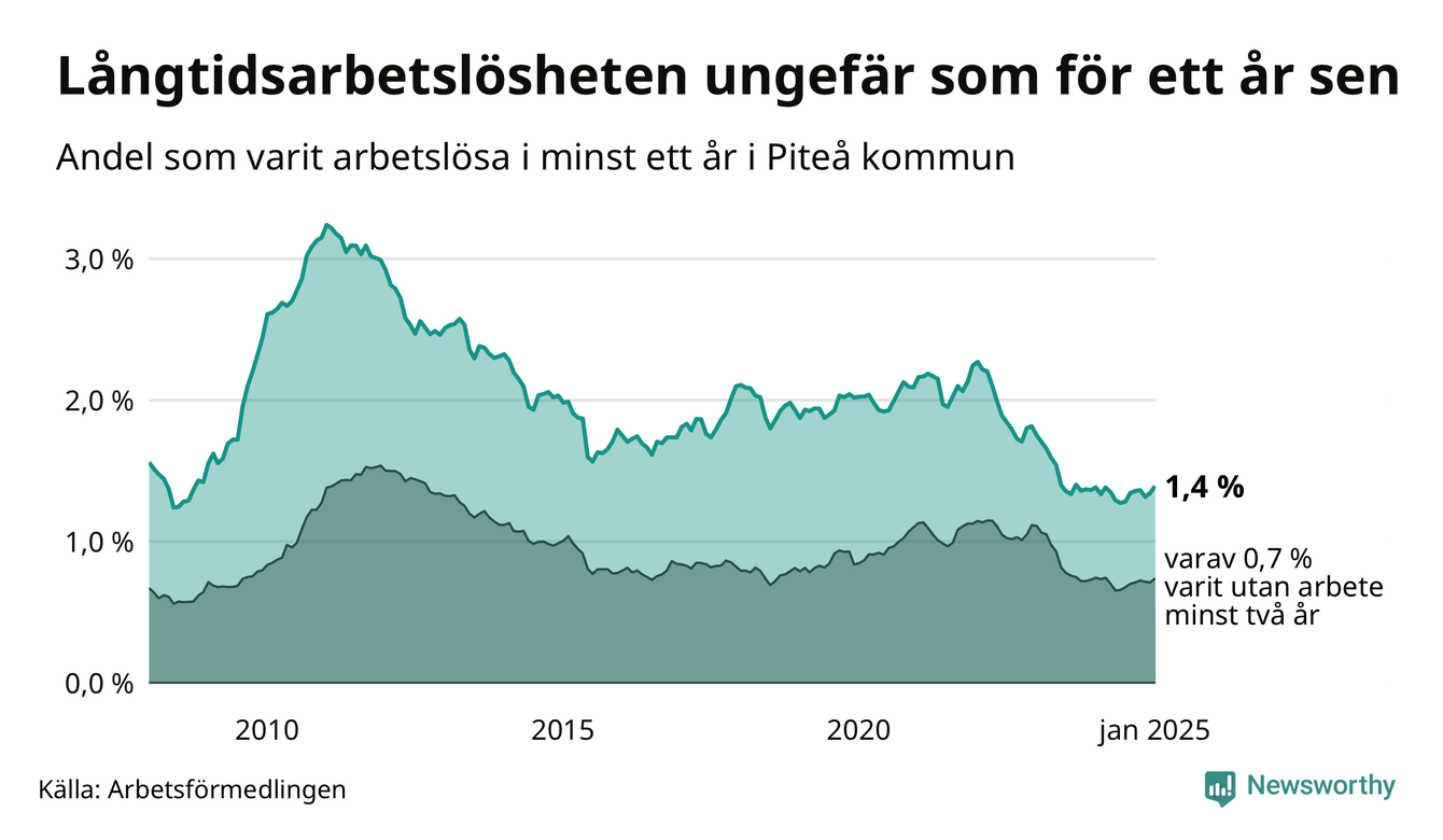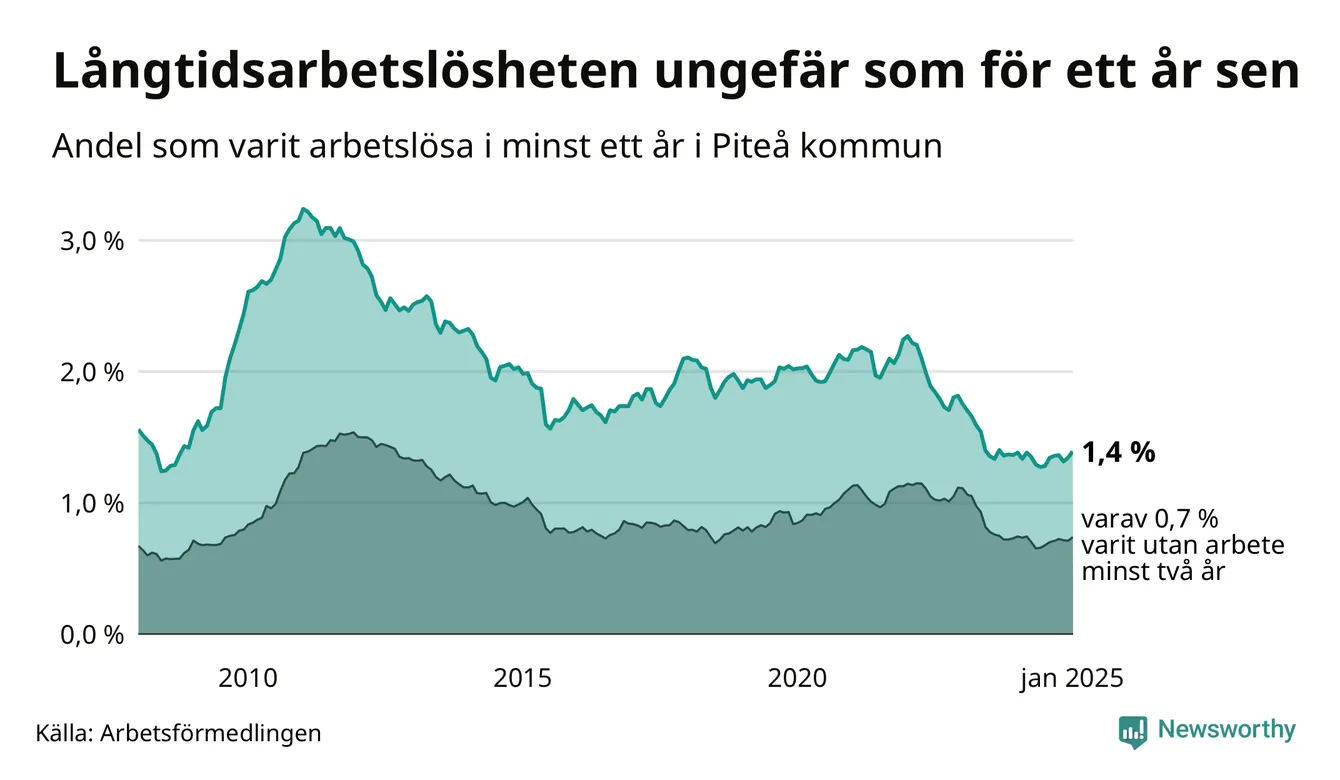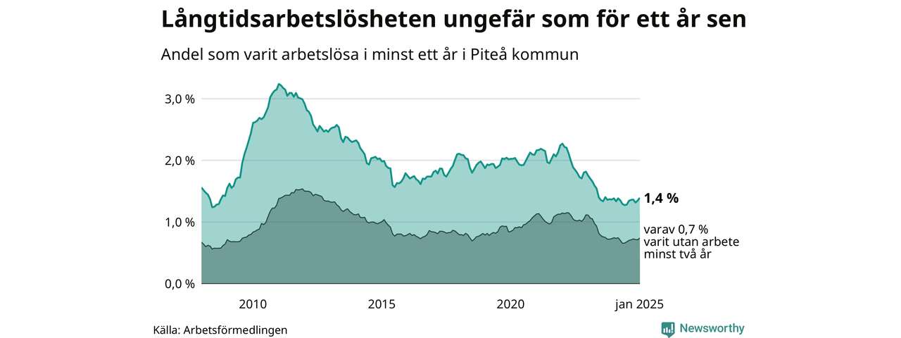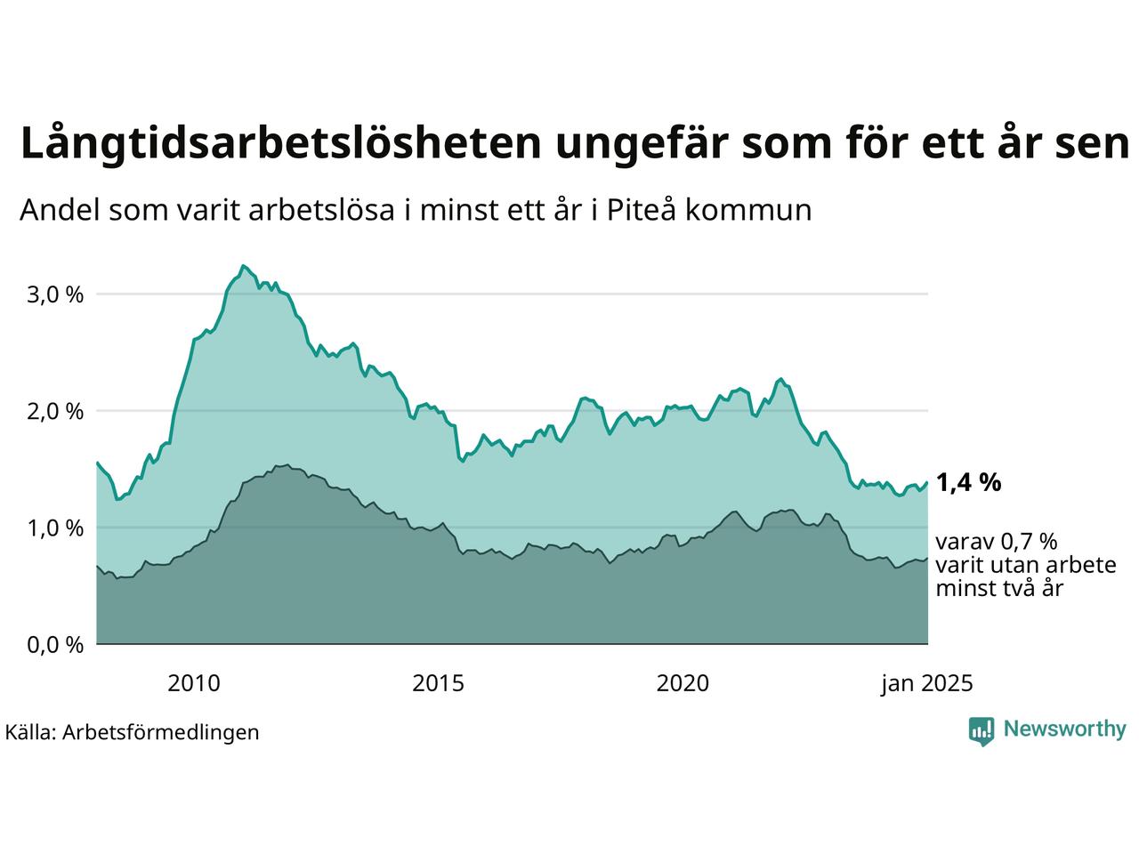 I januari hade 292 Piteåbor varit arbetslösa i minst ett år, vilket är tio fler än månaden innan. 292 personer motsvarar 1,4 procent av arbetskraften i kommunen – andelen långtidsarbetslösa är ungefär på samma nivå som för ett år sedan.
