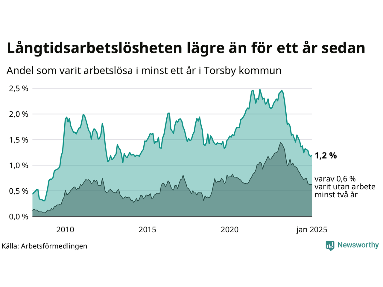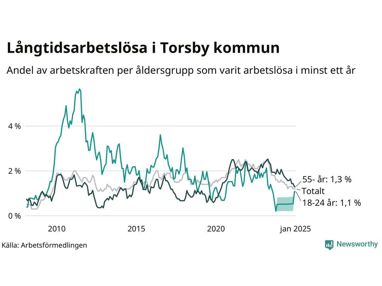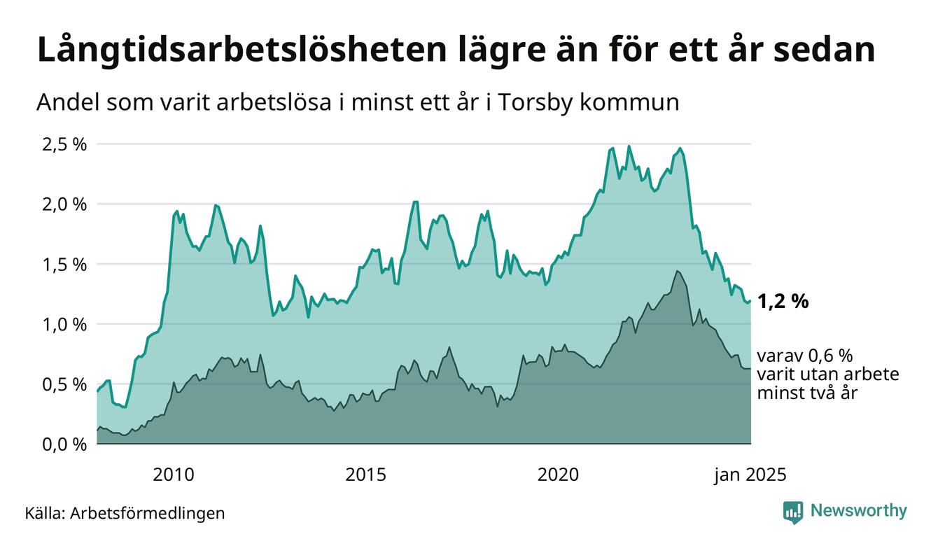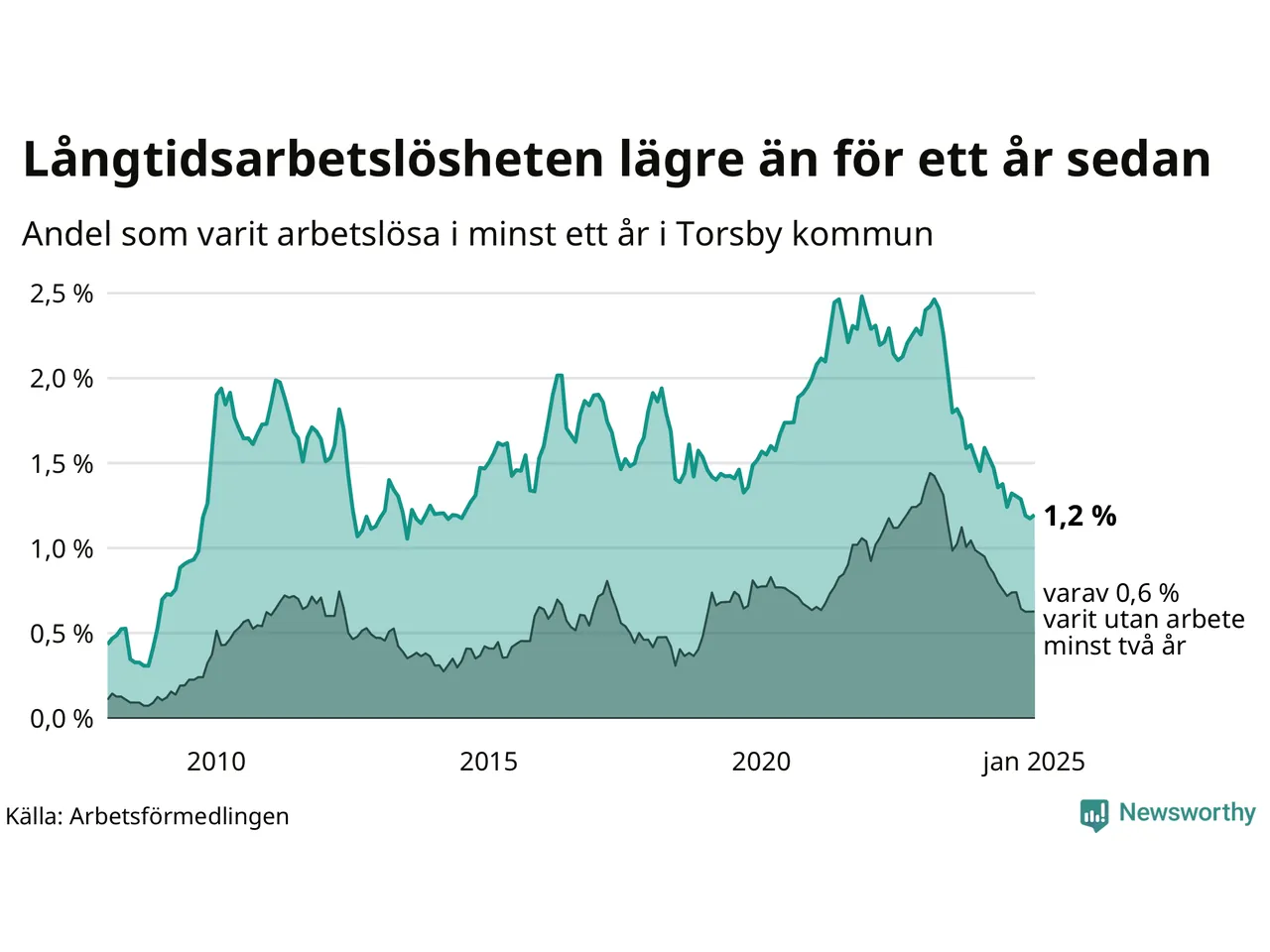 I januari hade 61 Torsbybor varit arbetslösa i minst ett år, vilket är en fler än månaden innan. Det är den första månaden sedan augusti 2024 som antalet arbetslösa ökar. 61 personer motsvarar 1,2 procent av arbetskraften i kommunen – andelen långtidsarbetslösa är 0,3 procentenheter lägre än samma månad för ett år sedan. Torsby tillhör de kommuner som har lägst andel långtidsarbetslösa i hela landet just nu.