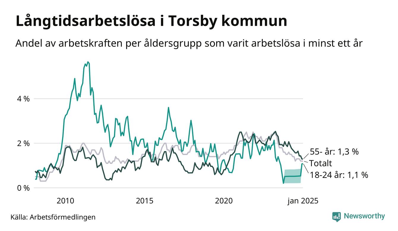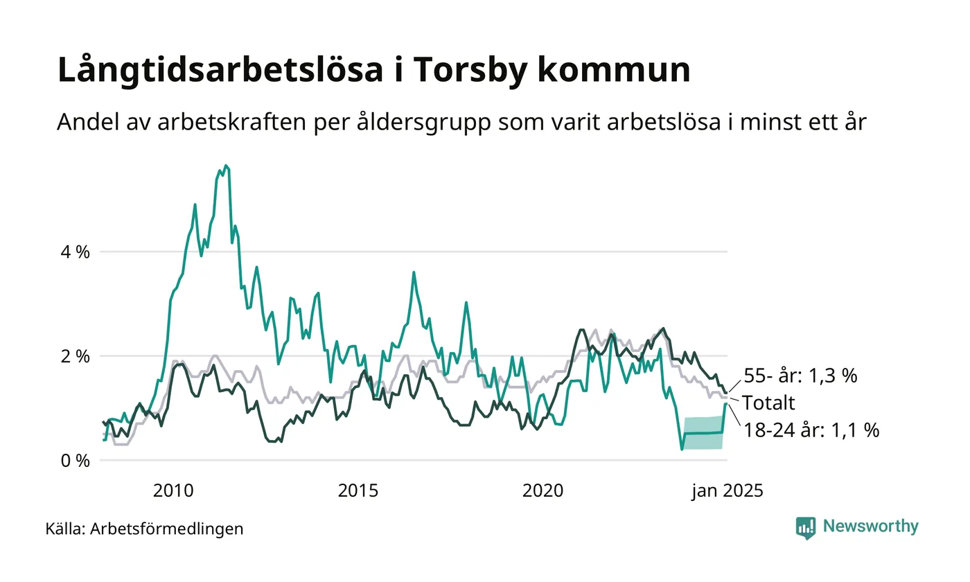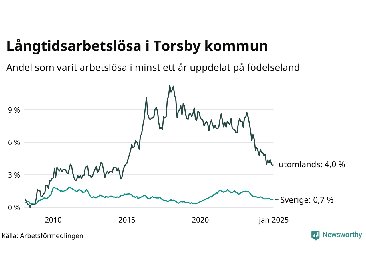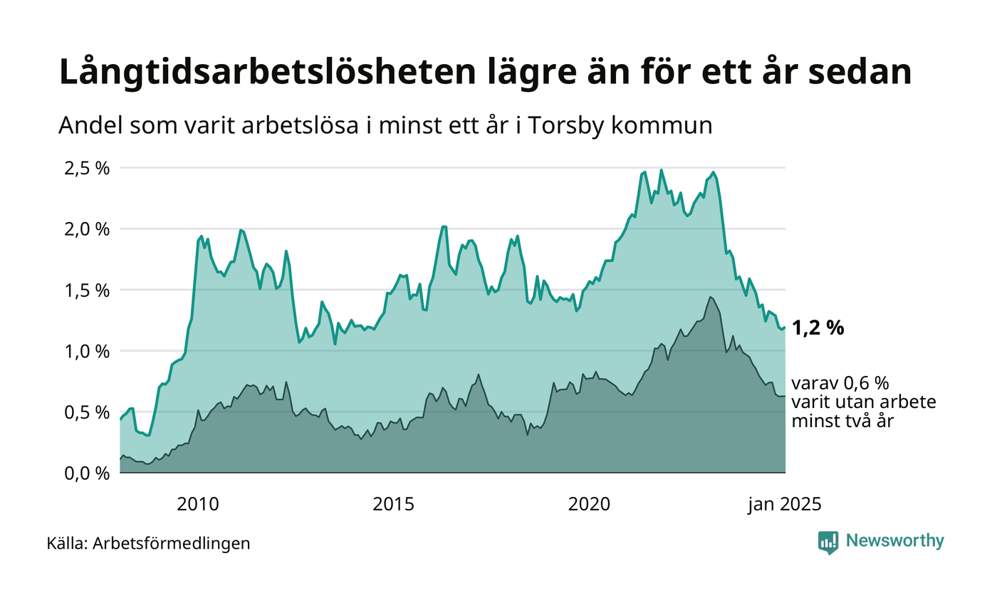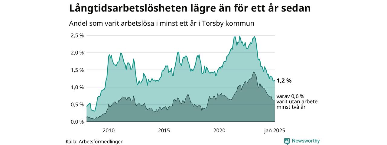 I januari hade 61 Torsbybor varit arbetslösa i minst ett år, vilket är en fler än månaden innan. Det är den första månaden sedan augusti 2024 som antalet arbetslösa ökar. 61 personer motsvarar 1,2 procent av arbetskraften i kommunen – andelen långtidsarbetslösa är 0,3 procentenheter lägre än samma månad för ett år sedan. Torsby tillhör de kommuner som har lägst andel långtidsarbetslösa i hela landet just nu.