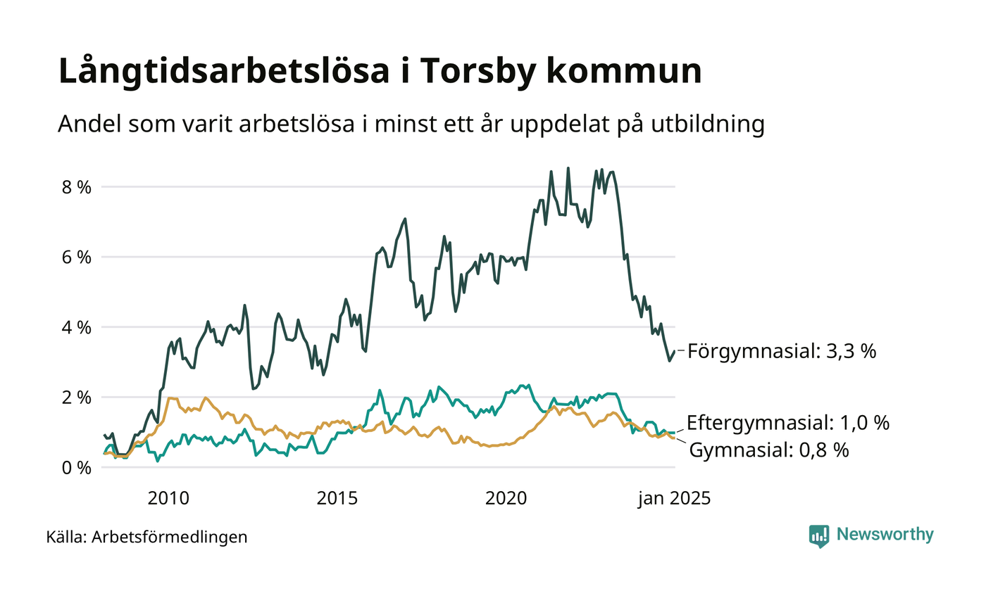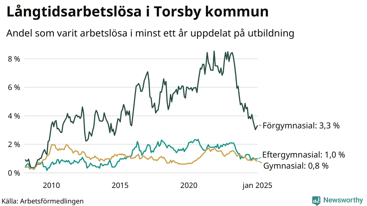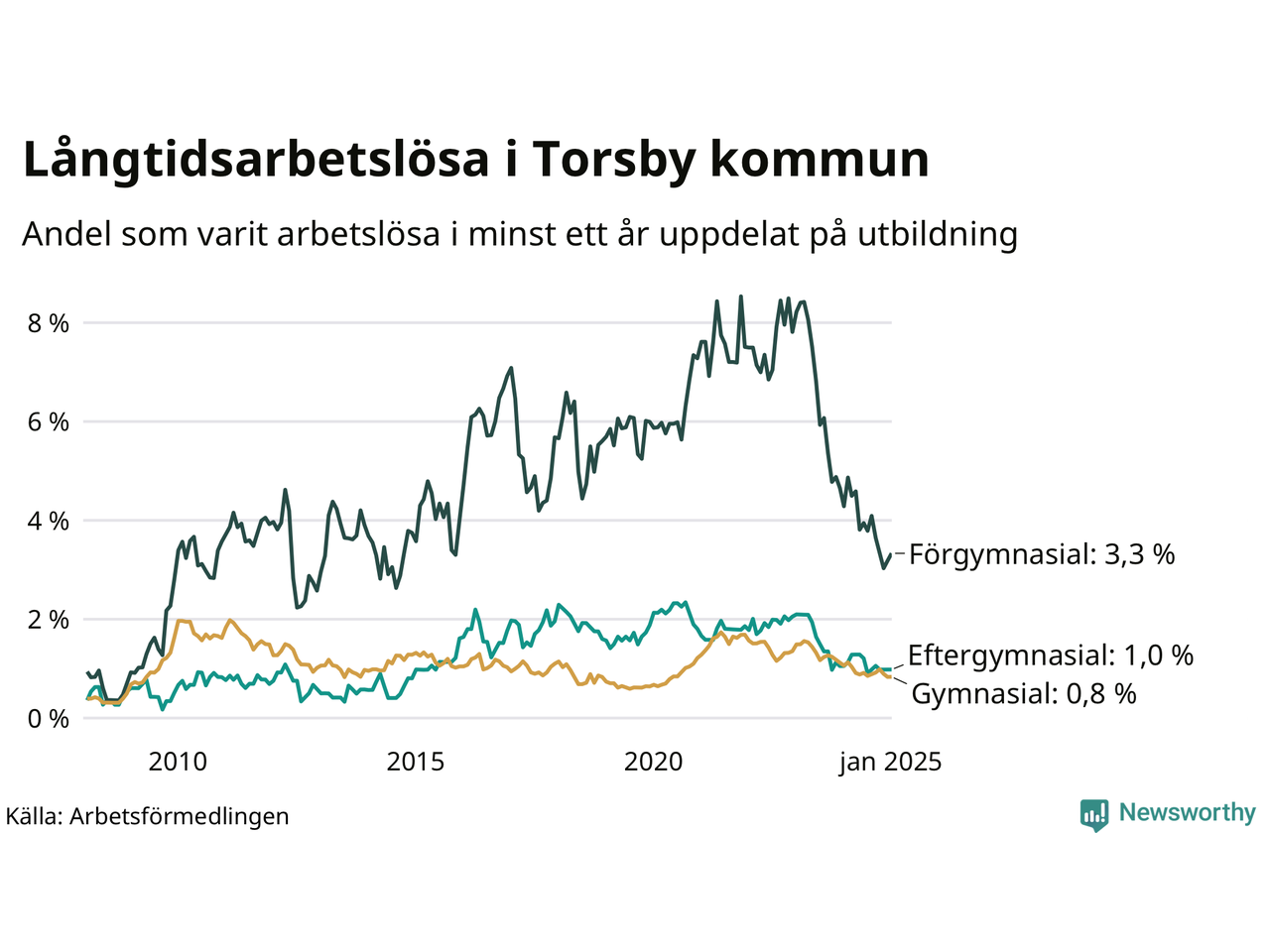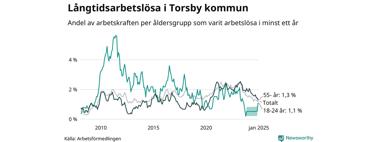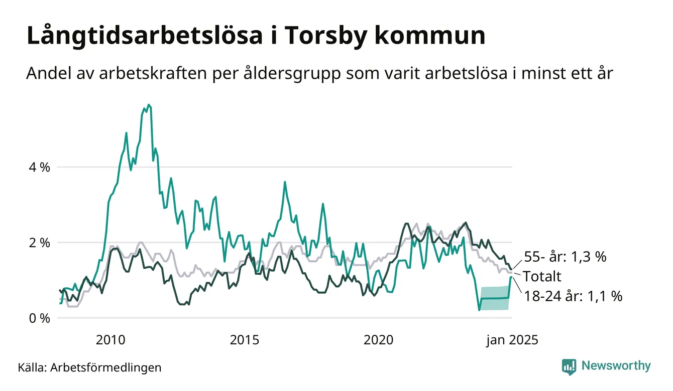 I januari hade 61 Torsbybor varit arbetslösa i minst ett år, vilket är en fler än månaden innan. Det är den första månaden sedan augusti 2024 som antalet arbetslösa ökar. 61 personer motsvarar 1,2 procent av arbetskraften i kommunen – andelen långtidsarbetslösa är 0,3 procentenheter lägre än samma månad för ett år sedan. Torsby tillhör de kommuner som har lägst andel långtidsarbetslösa i hela landet just nu.