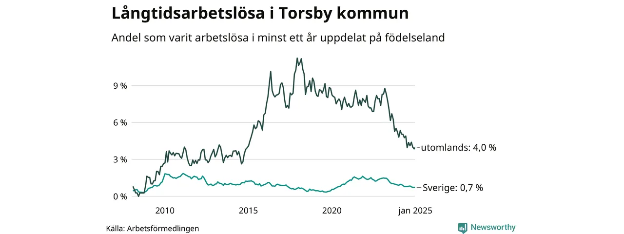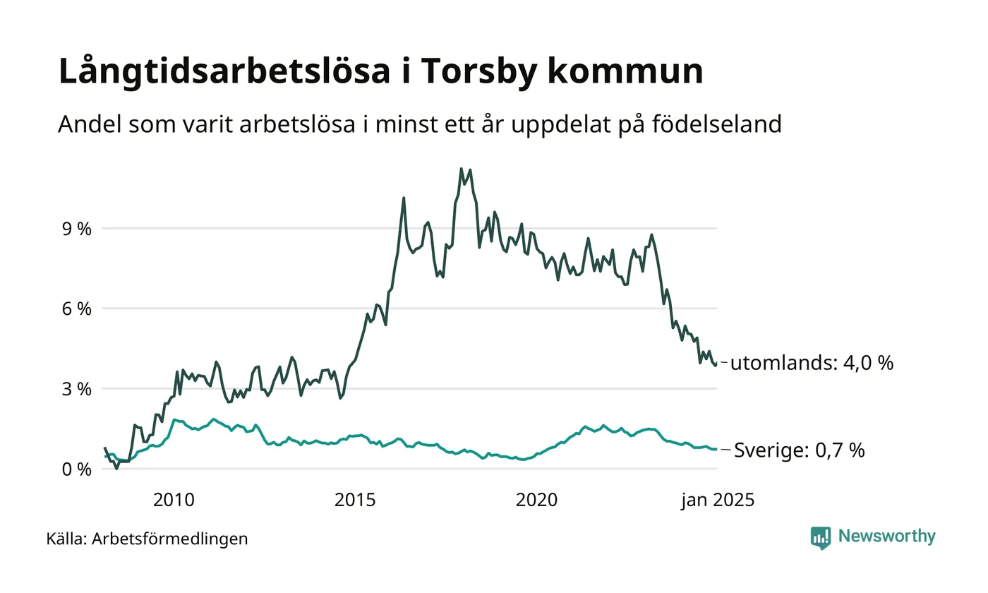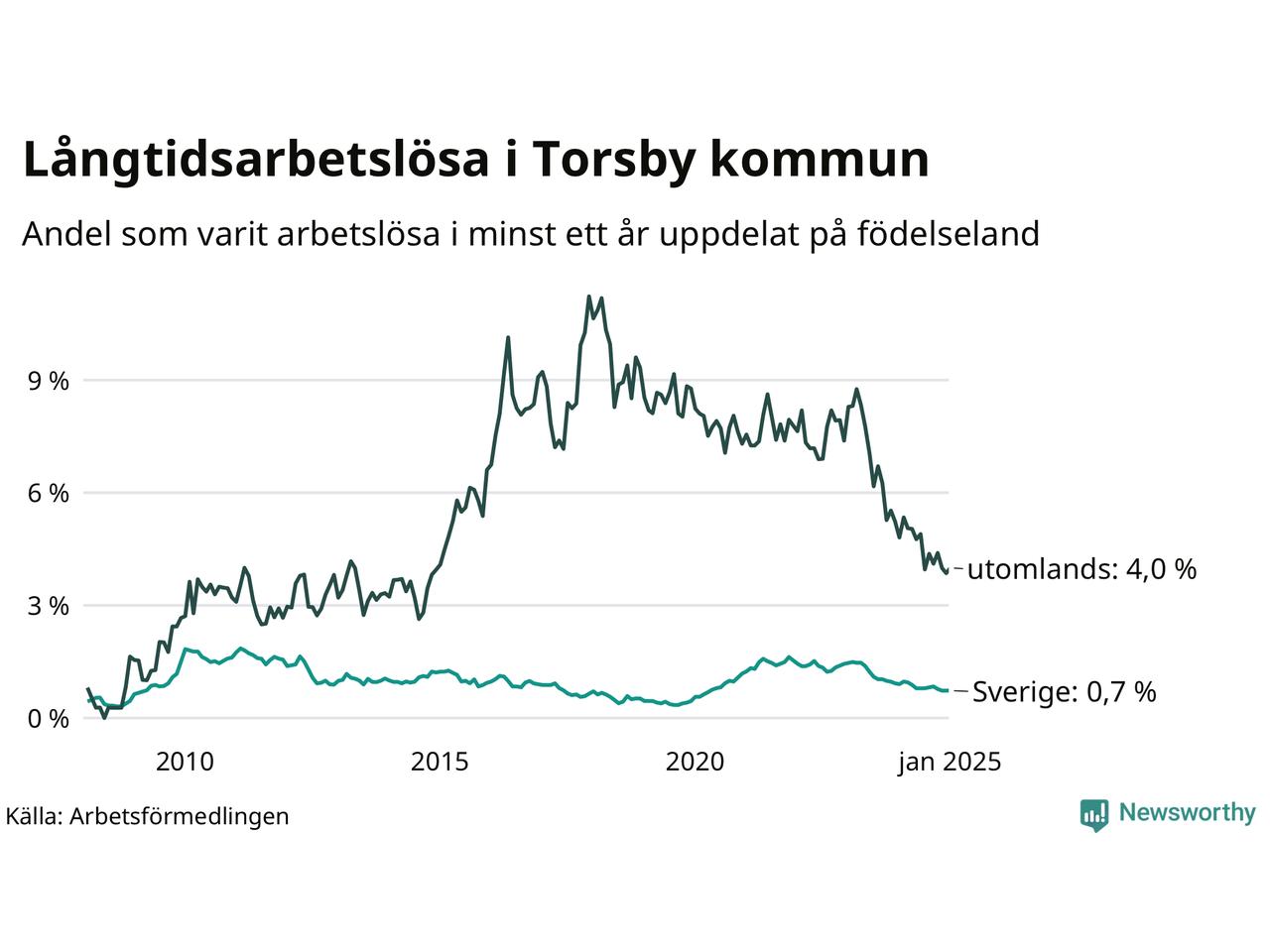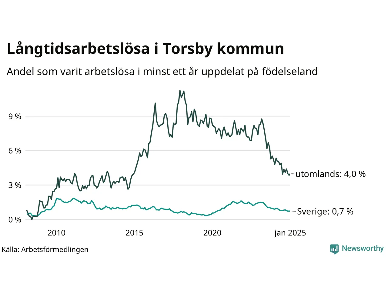 32 av de långtidsarbetslösa i Torsby är födda i Sverige, medan 29 är födda utomlands. Det innebär att långtidsarbetslösheten bland Sverigefödda är 0,7 procent, medan den är sex gånger så hög – 4,0 procent – bland födda utomlands. Även i riket som helhet är arbetslösheten högre bland utrikesfödda.