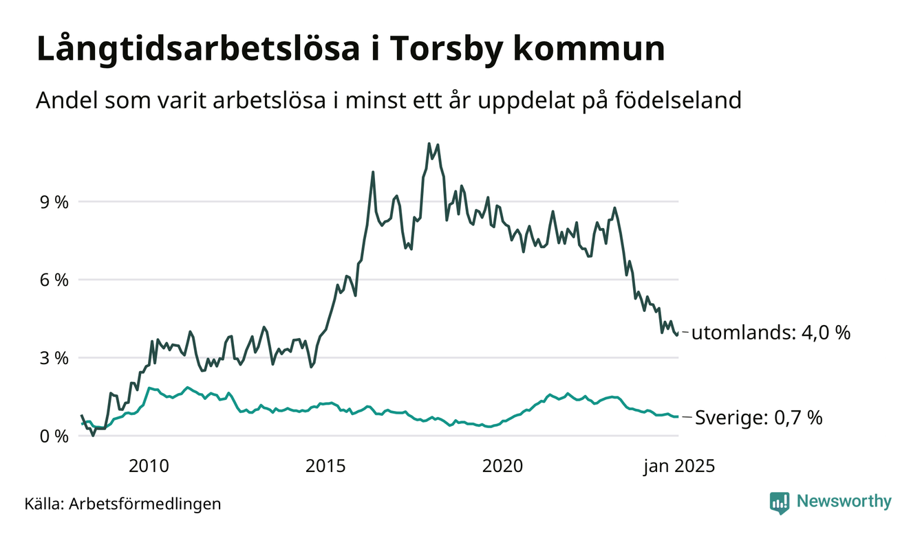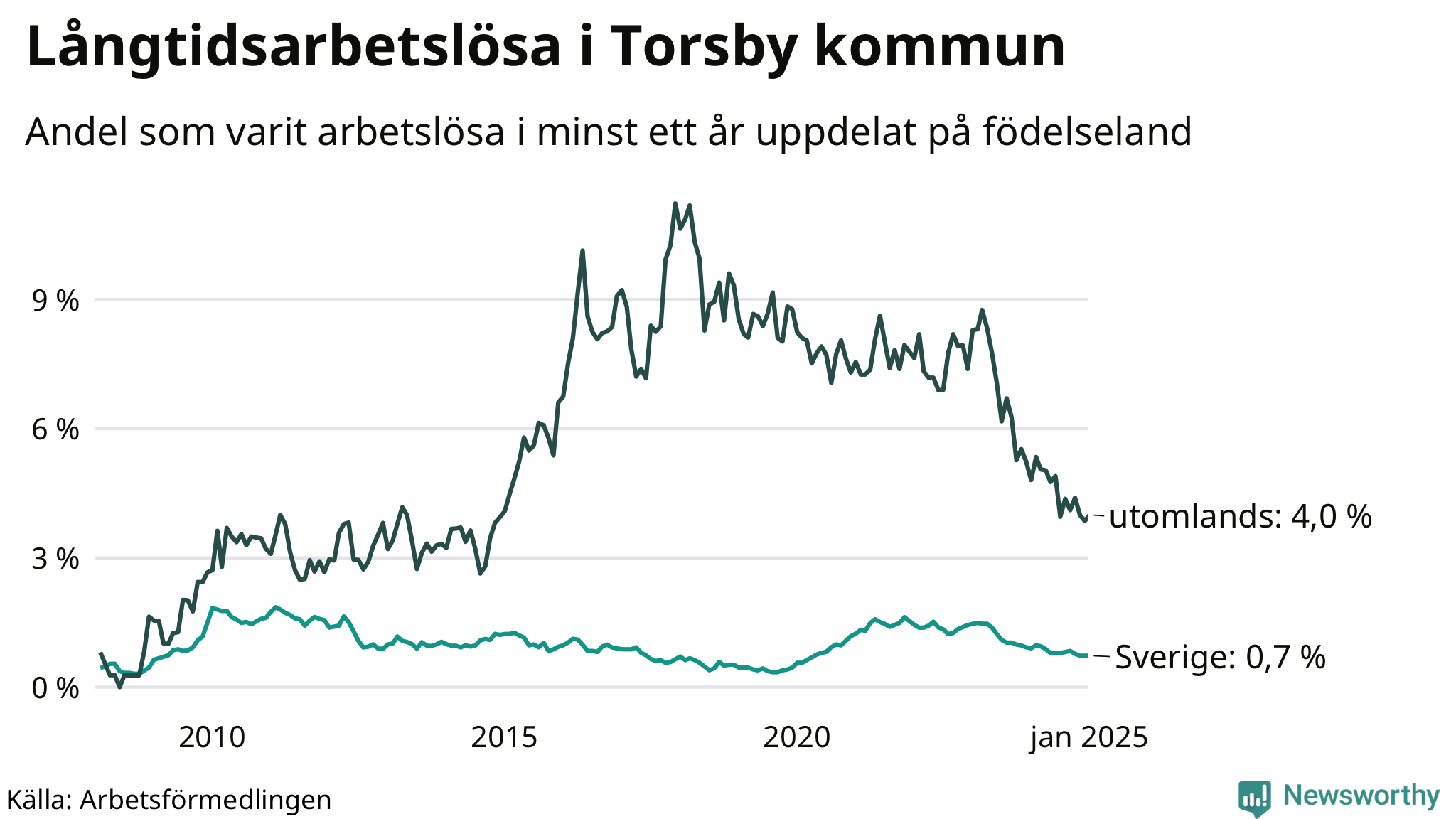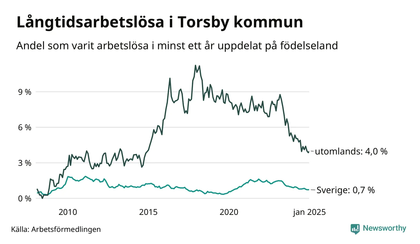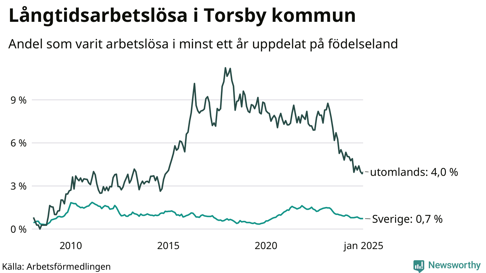 32 av de långtidsarbetslösa i Torsby är födda i Sverige, medan 29 är födda utomlands. Det innebär att långtidsarbetslösheten bland Sverigefödda är 0,7 procent, medan den är sex gånger så hög – 4,0 procent – bland födda utomlands. Även i riket som helhet är arbetslösheten högre bland utrikesfödda.