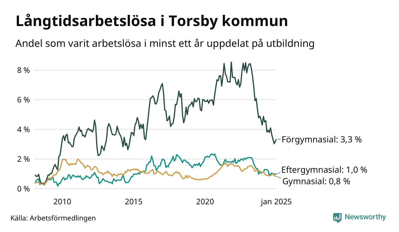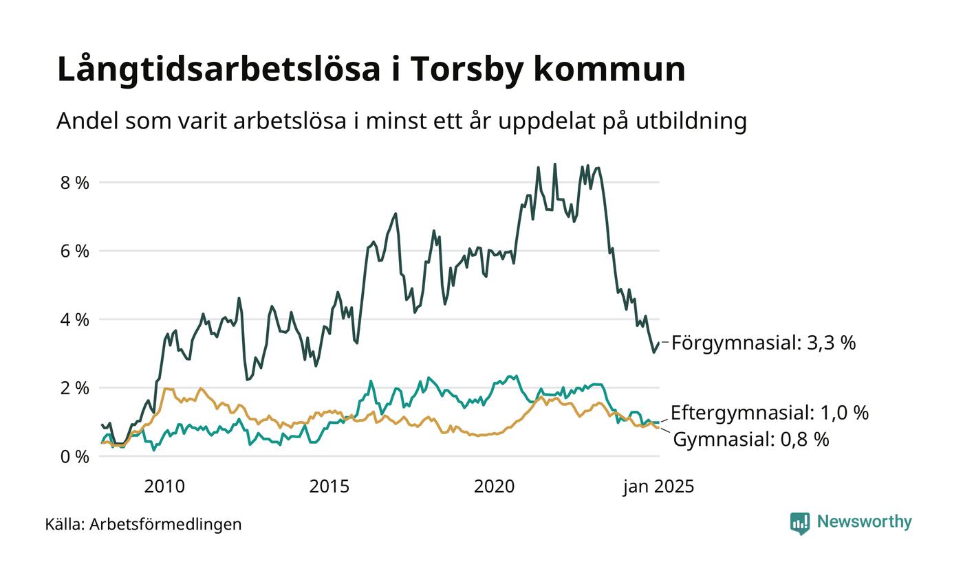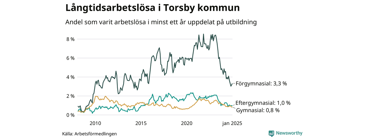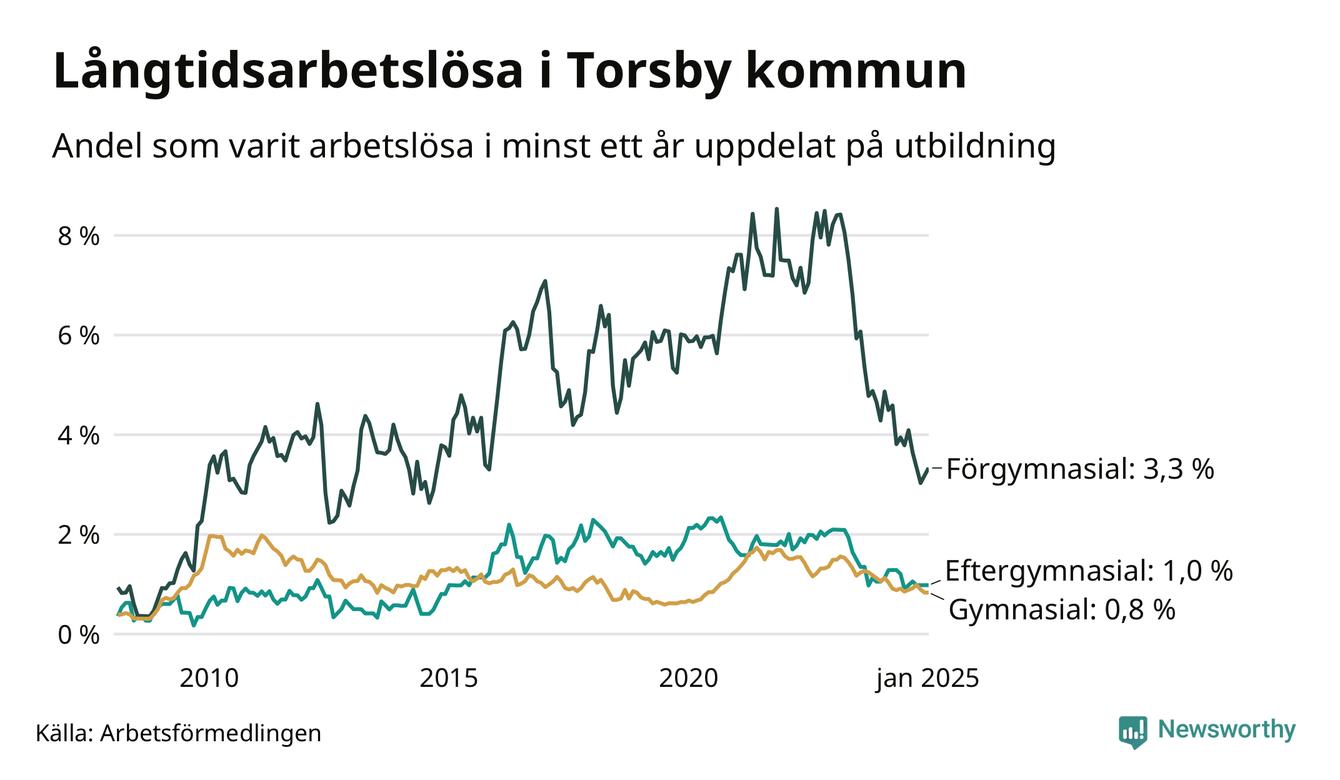 Graf över andel långtidsarbetslösa i Torsby uppdelat på utbildningsnivå