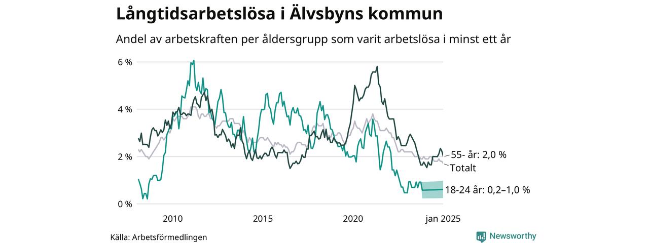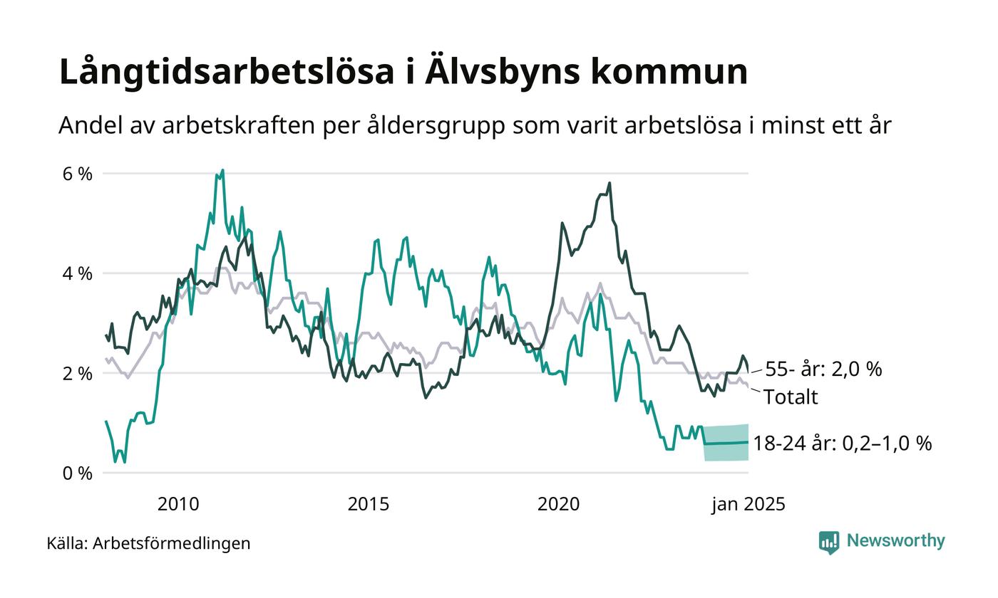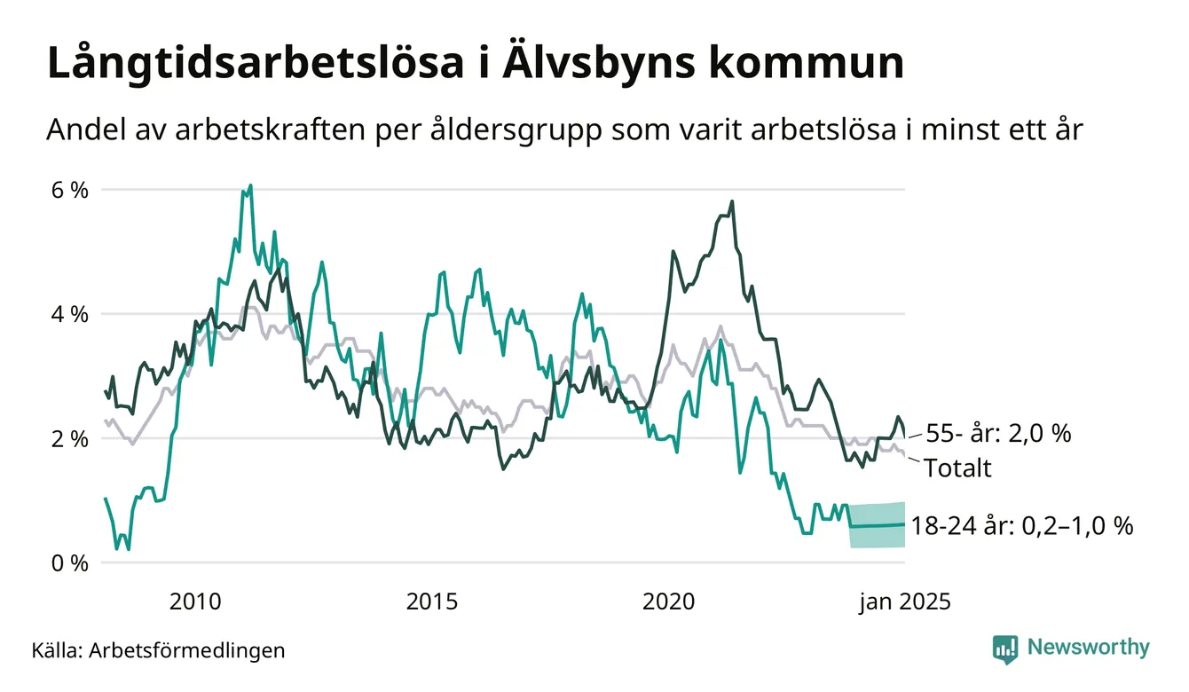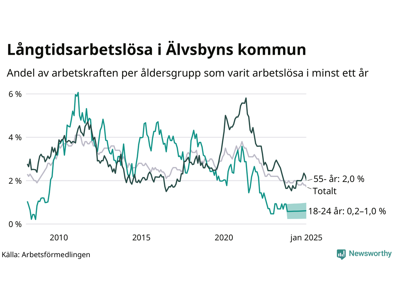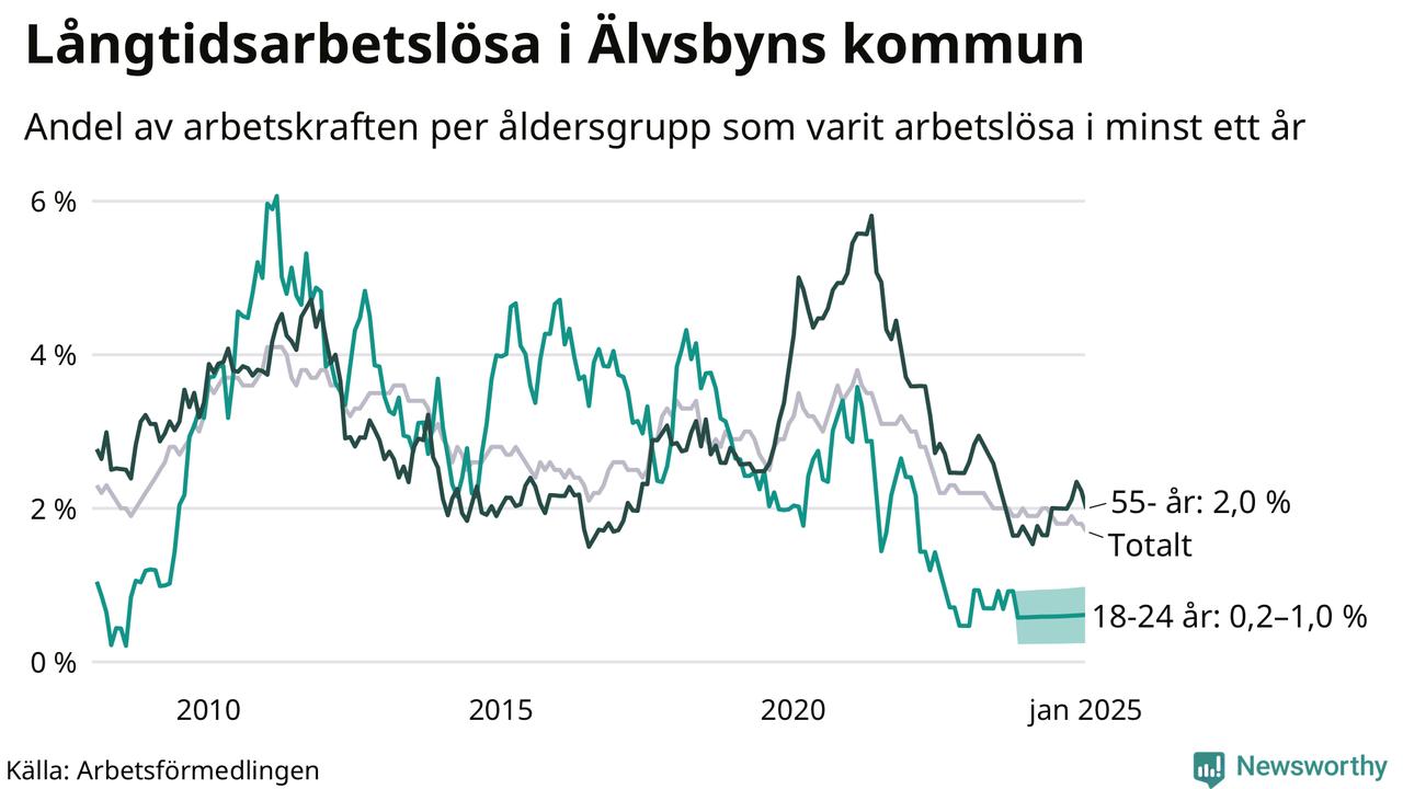 Av de 60 personerna som varit arbetslösa i mer än ett år i Älvsbyns kommun är 17 personer mellan 55 och 651 år och mellan en och fyra är mellan 18 och 24 år. För den äldre gruppen är andelen arbetslösa 2,0 procent medan den i den yngre gruppen är mellan 0,2 och 1,0 procent. Även i riket som helhet är långtidsarbetslösheten högre i gruppen äldre.