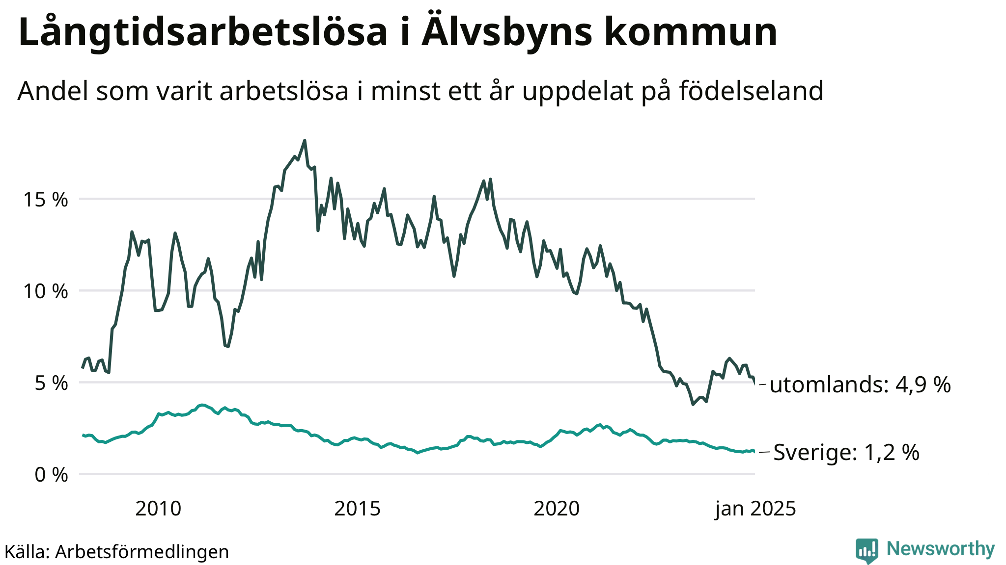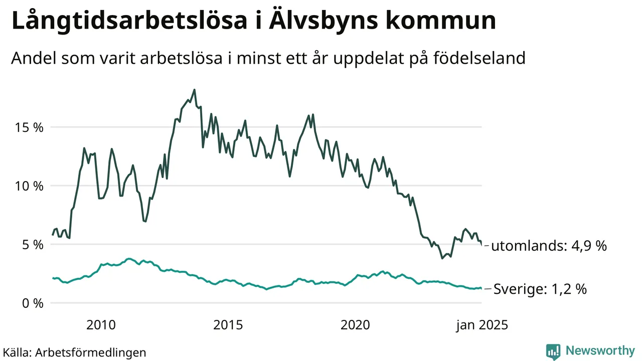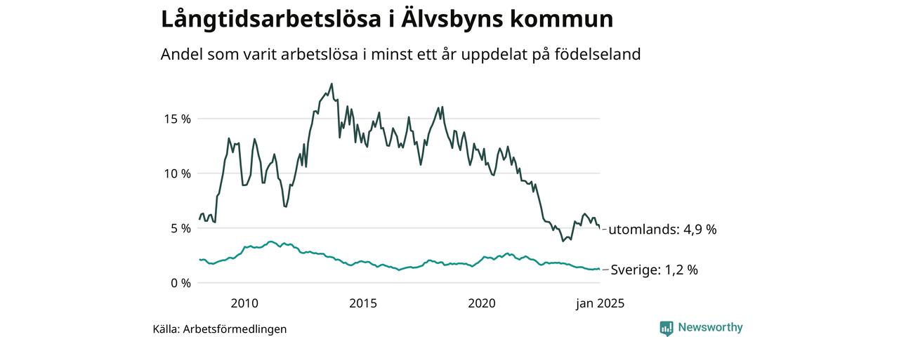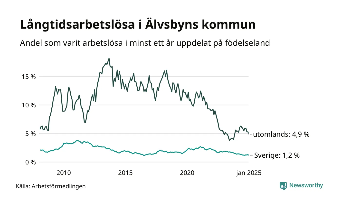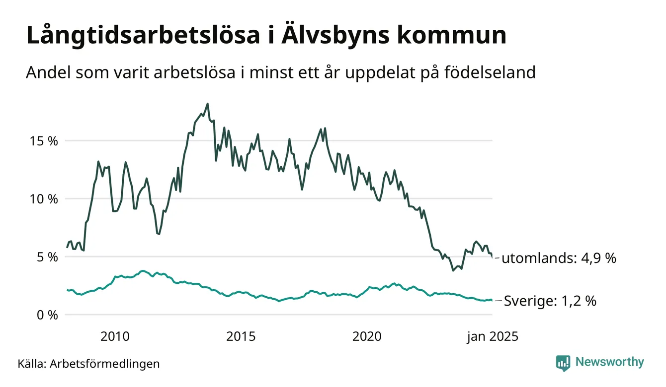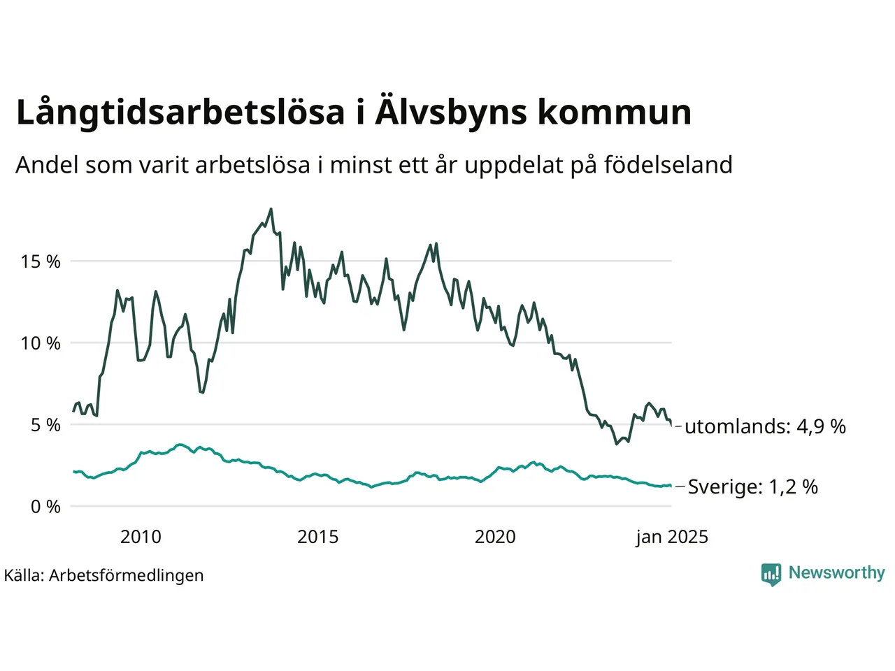 37 av de långtidsarbetslösa i Älvsbyn är födda i Sverige, medan 23 är födda utomlands. Det innebär att långtidsarbetslösheten bland Sverigefödda är 1,2 procent, medan den är fyra gånger så hög – 4,9 procent – bland födda utomlands. Även i riket som helhet är arbetslösheten högre bland utrikesfödda.