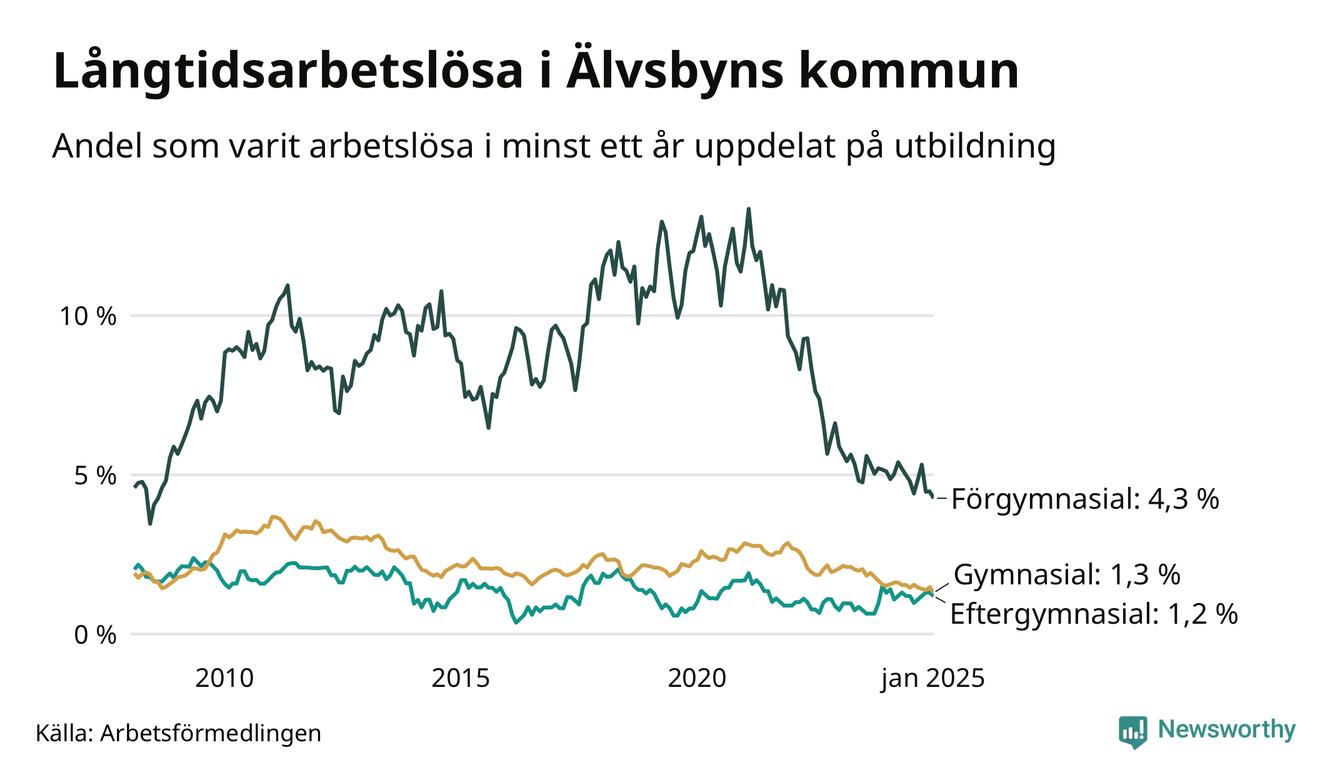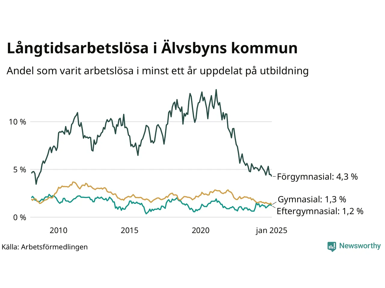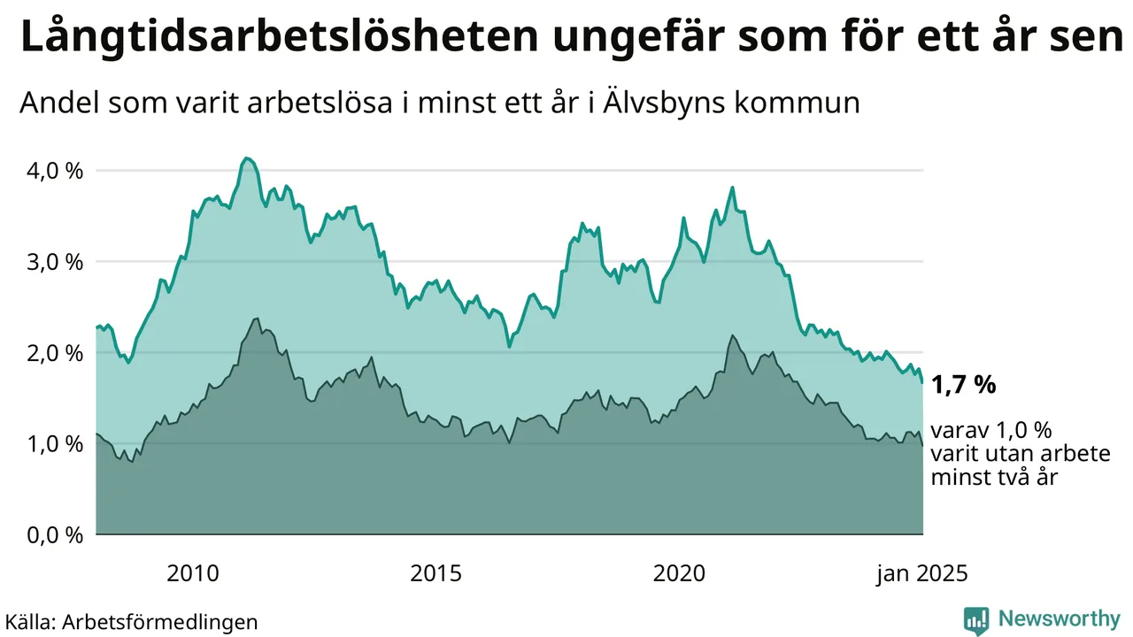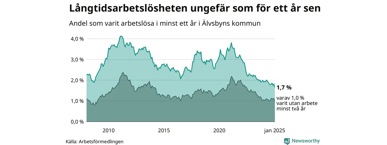 Andelen som varit utan arbete i minst 12 månader i Älvsbyns kommun är den lägsta under de senaste 15 åren. Det visar Arbetsförmedlingens senaste månadsstatistik.