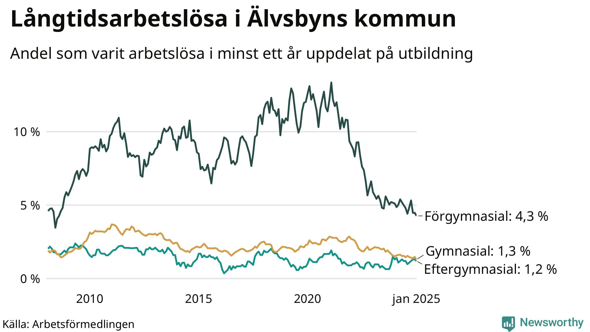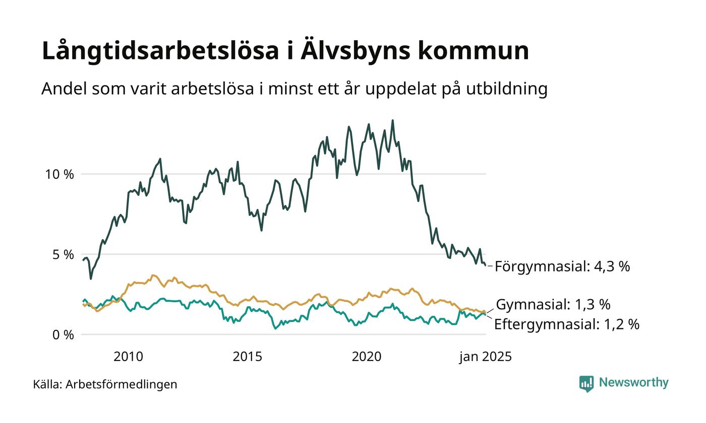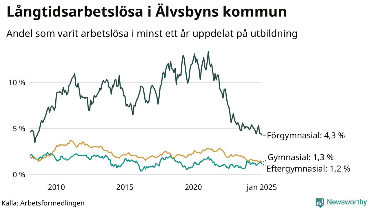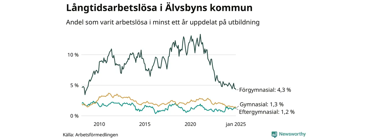 Andelen som varit utan arbete i minst 12 månader i Älvsbyns kommun är den lägsta under de senaste 15 åren. Det visar Arbetsförmedlingens senaste månadsstatistik.