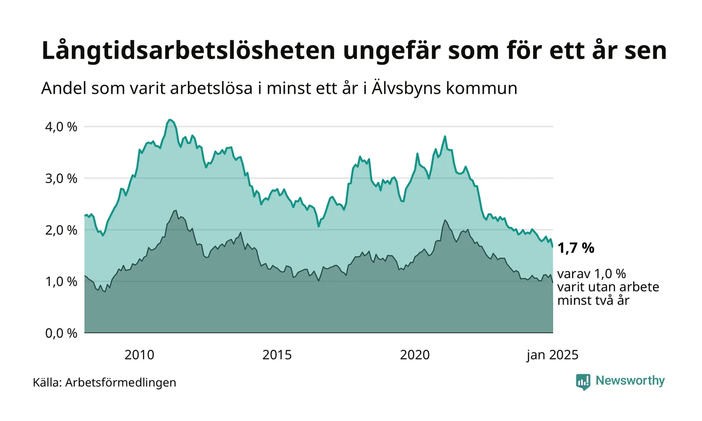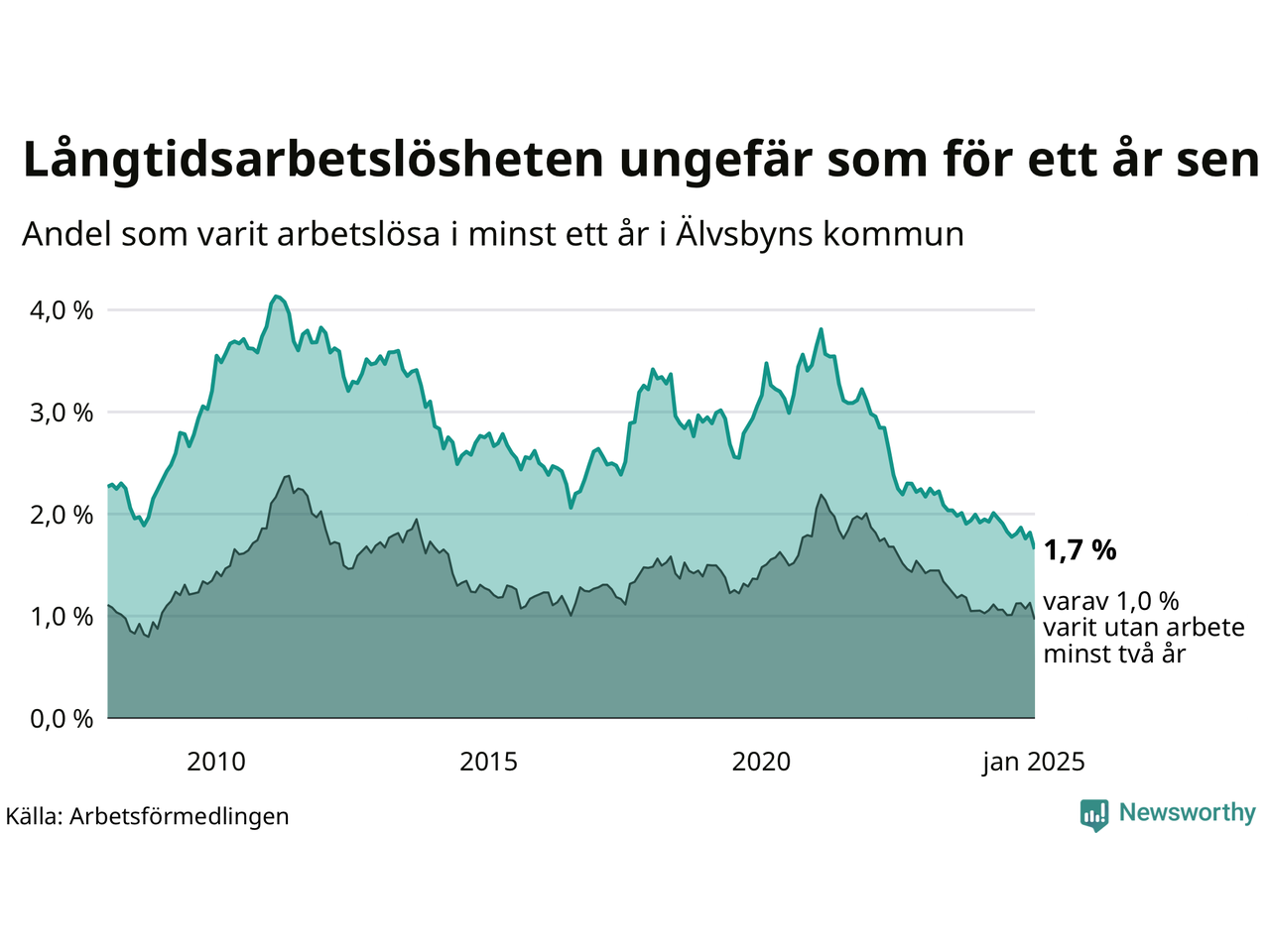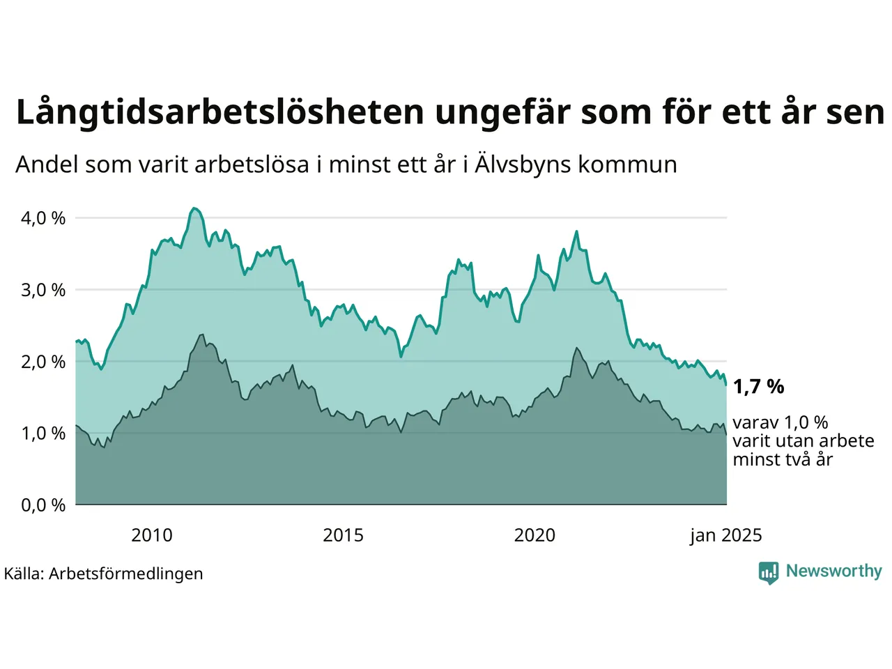 I januari hade 60 Älvsbybor varit arbetslösa i minst ett år, vilket är sex färre än månaden innan. 60 personer motsvarar 1,7 procent av arbetskraften i kommunen – andelen långtidsarbetslösa är ungefär på samma nivå som för ett år sedan. Det är också den den lägsta andelen långtidsarbetslösa under de senaste 15 åren.