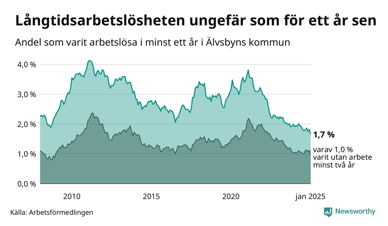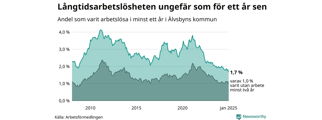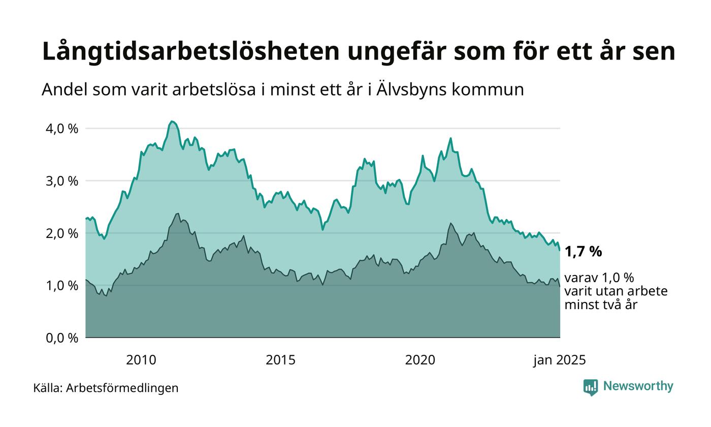 I januari hade 60 Älvsbybor varit arbetslösa i minst ett år, vilket är sex färre än månaden innan. 60 personer motsvarar 1,7 procent av arbetskraften i kommunen – andelen långtidsarbetslösa är ungefär på samma nivå som för ett år sedan. Det är också den den lägsta andelen långtidsarbetslösa under de senaste 15 åren.