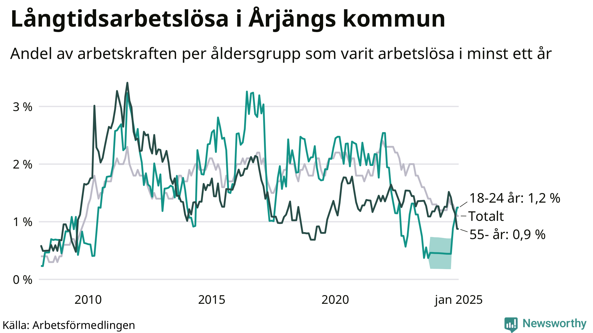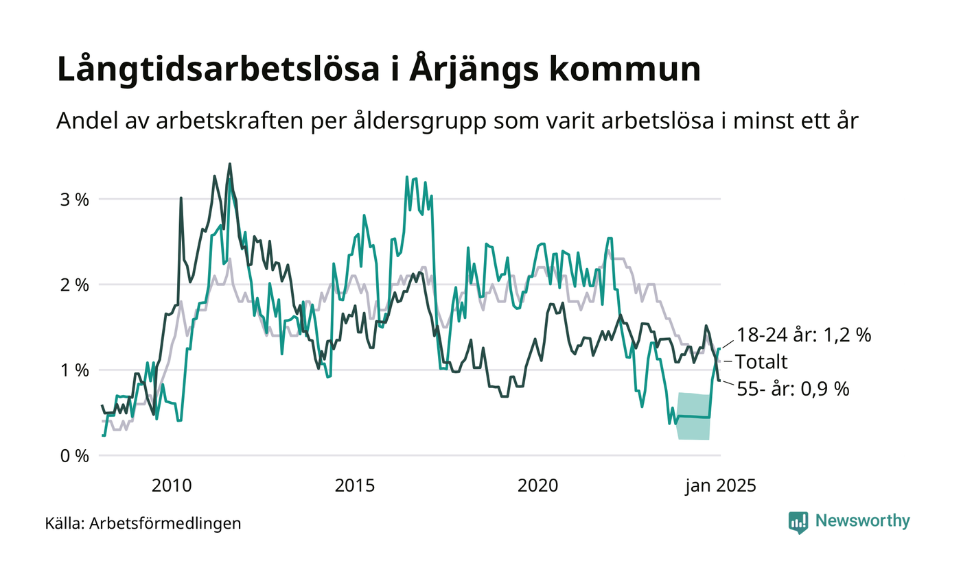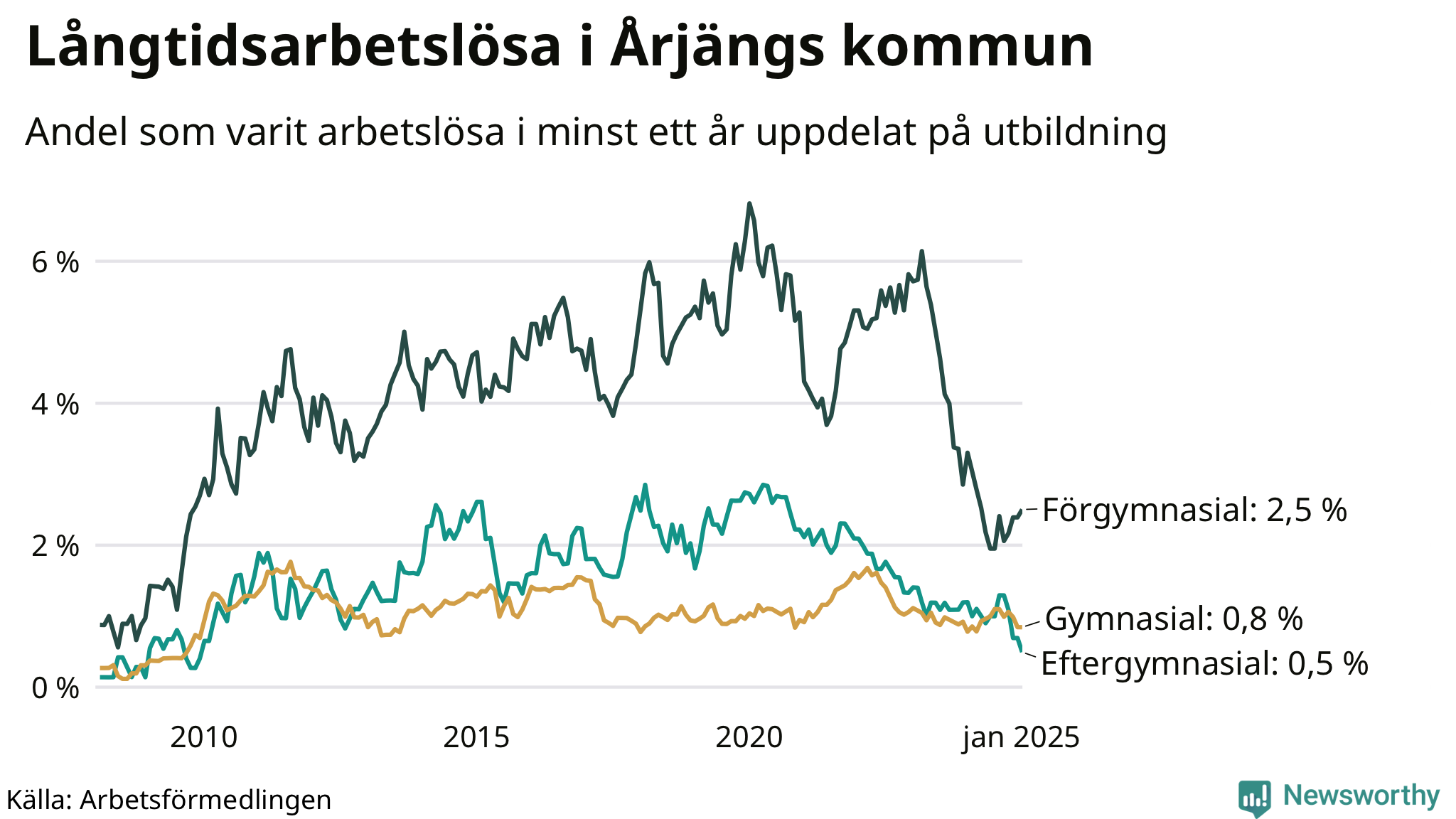| Andel arbetslösa i minst ett år | 1,1 % | 2,4 % | 2,9 % |