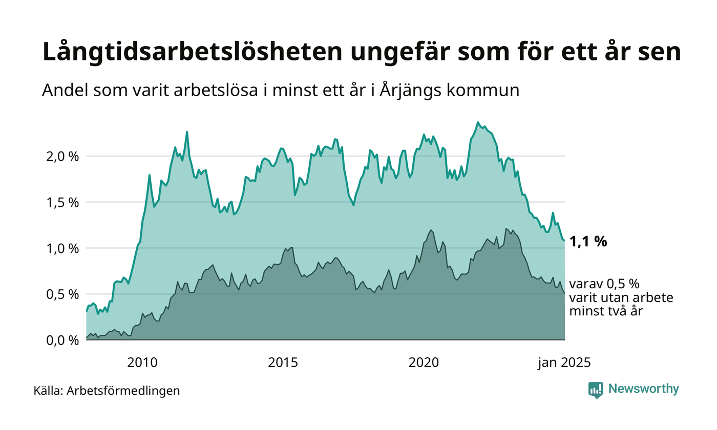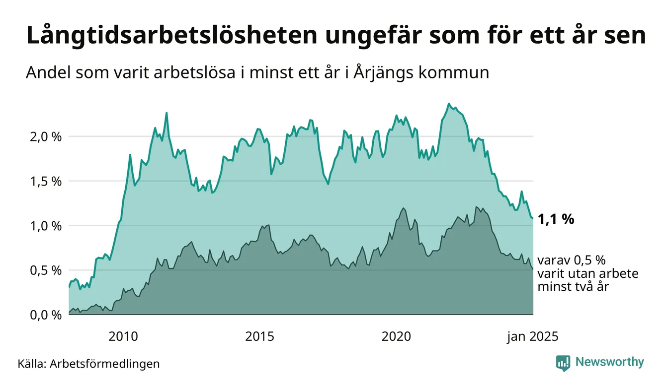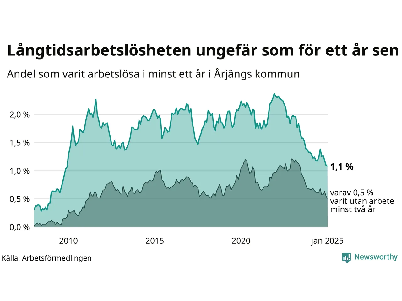 I januari hade 51 Årjängsbor varit arbetslösa i minst ett år, vilket är en färre än månaden innan. 51 personer motsvarar 1,1 procent av arbetskraften i kommunen – andelen långtidsarbetslösa är ungefär på samma nivå som för ett år sedan. Årjäng tillhör de kommuner som har lägst andel långtidsarbetslösa i hela landet just nu.