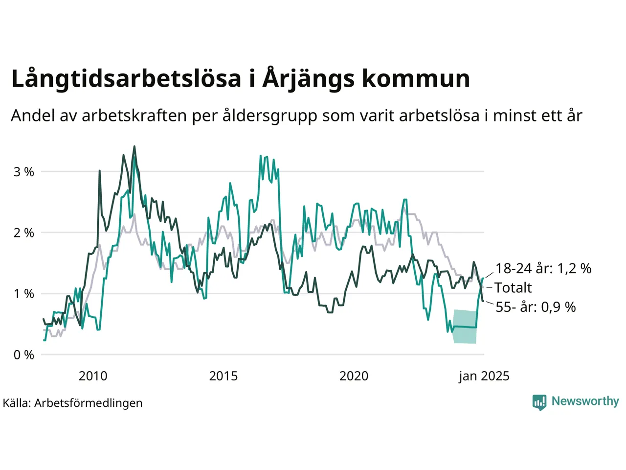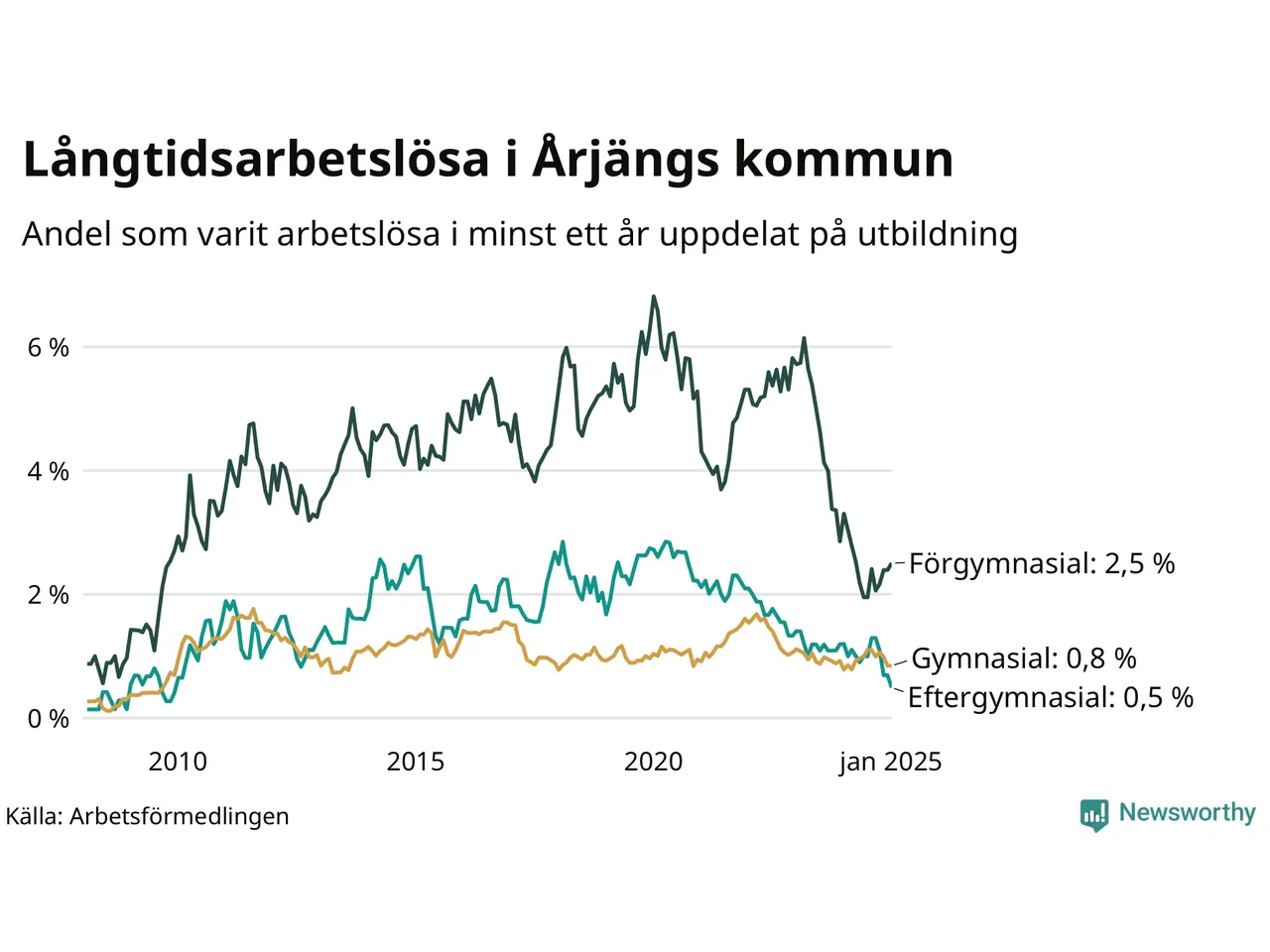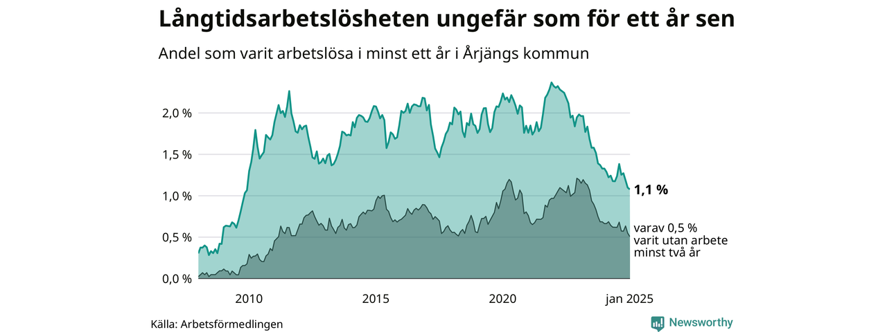 I januari hade 51 Årjängsbor varit arbetslösa i minst ett år, vilket är en färre än månaden innan. 51 personer motsvarar 1,1 procent av arbetskraften i kommunen – andelen långtidsarbetslösa är ungefär på samma nivå som för ett år sedan. Årjäng tillhör de kommuner som har lägst andel långtidsarbetslösa i hela landet just nu.