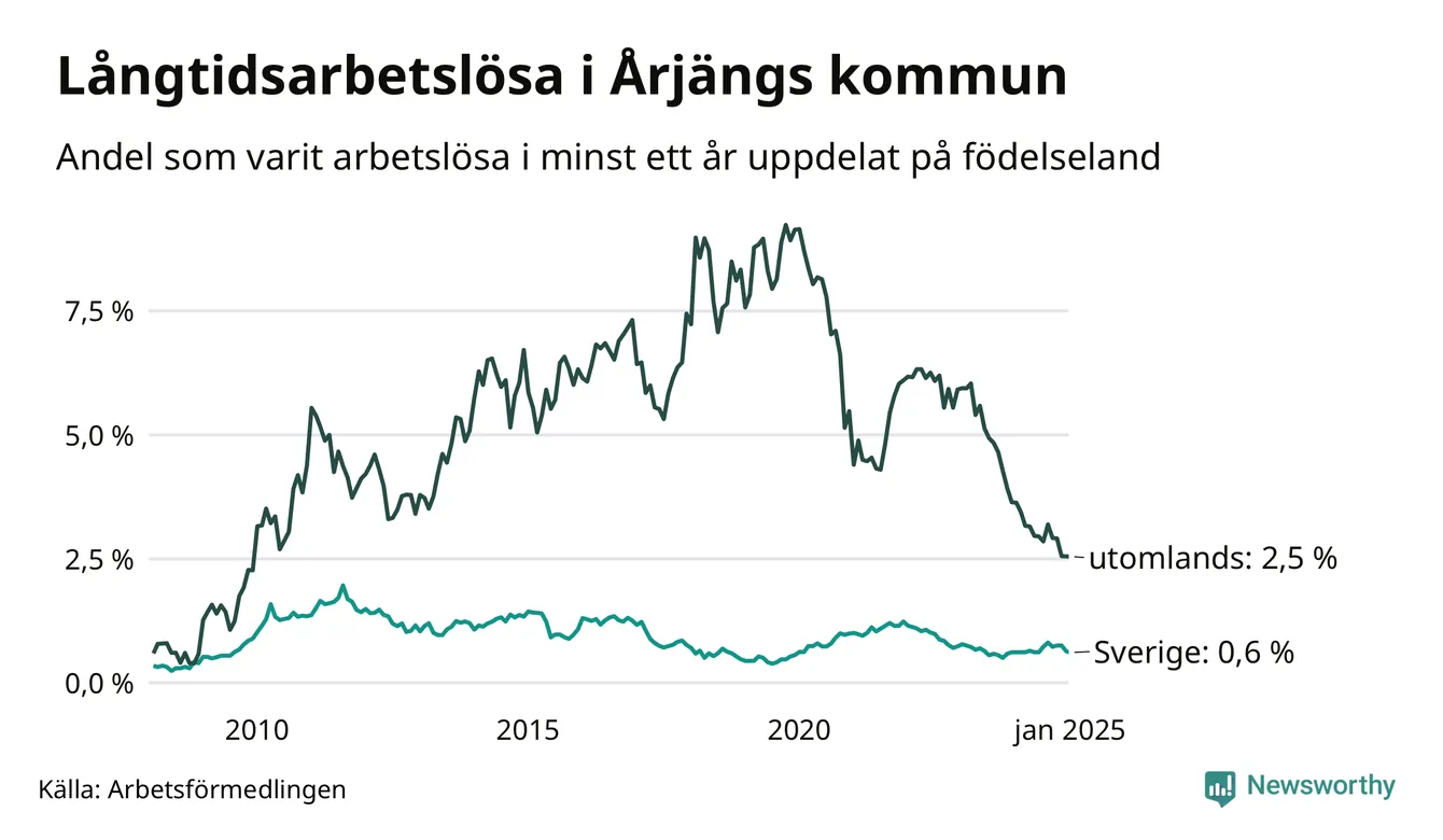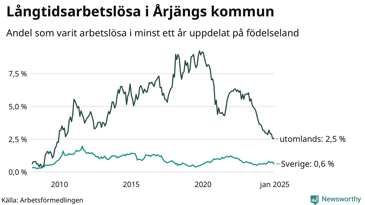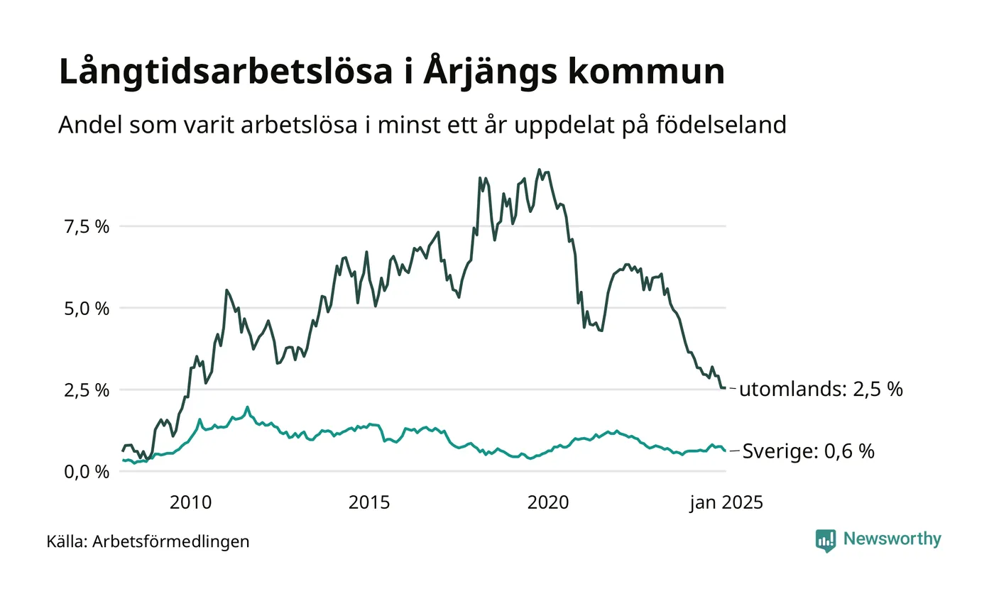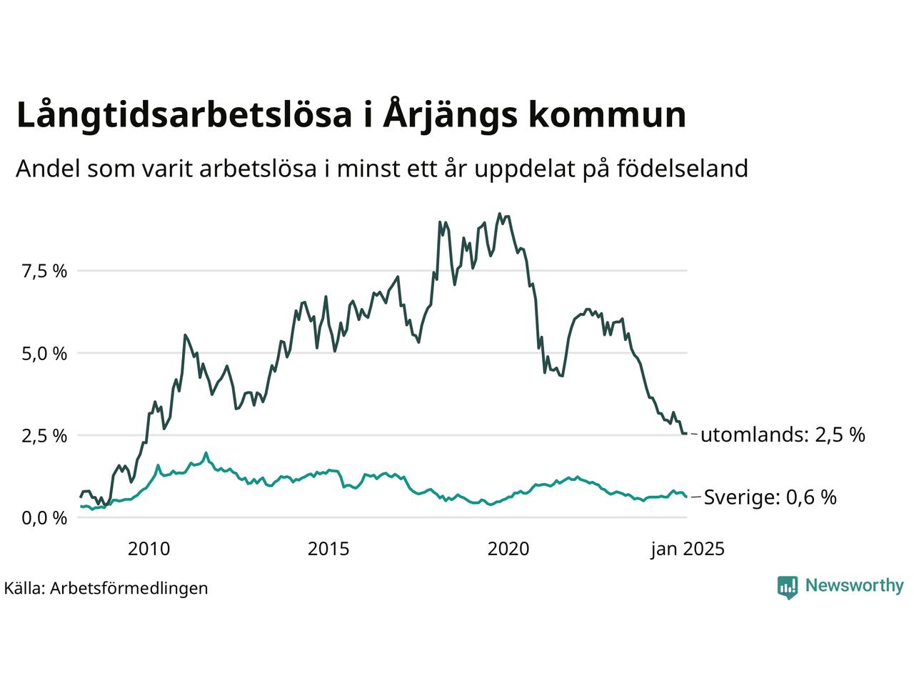 22 av de långtidsarbetslösa i Årjäng är födda i Sverige, medan 29 är födda utomlands. Det innebär att långtidsarbetslösheten bland Sverigefödda är 0,6 procent, medan den är fyra gånger så hög – 2,5 procent – bland födda utomlands. Även i riket som helhet är arbetslösheten högre bland utrikesfödda.