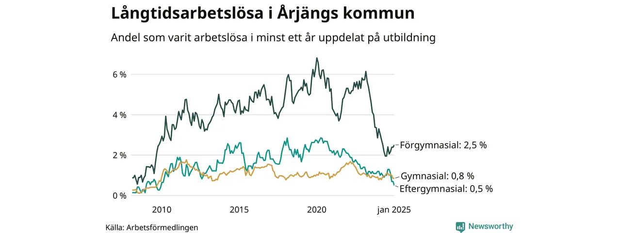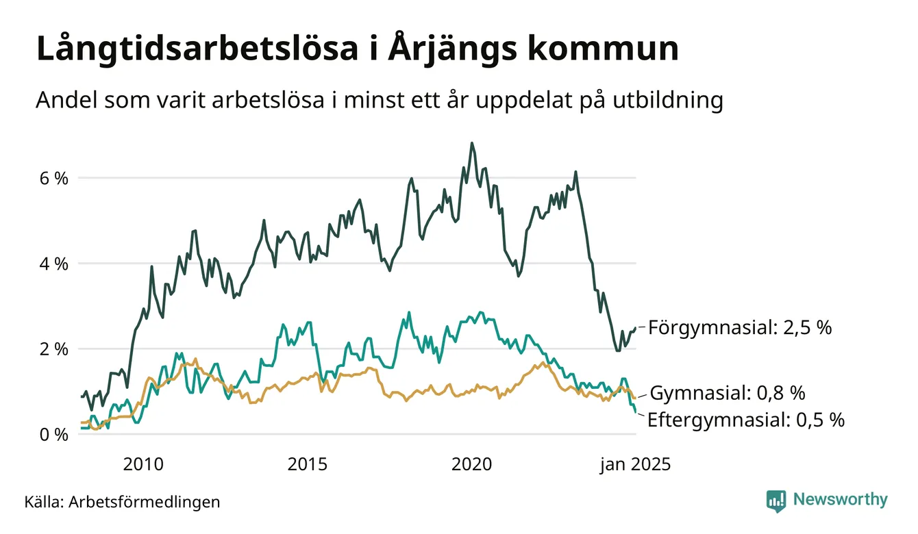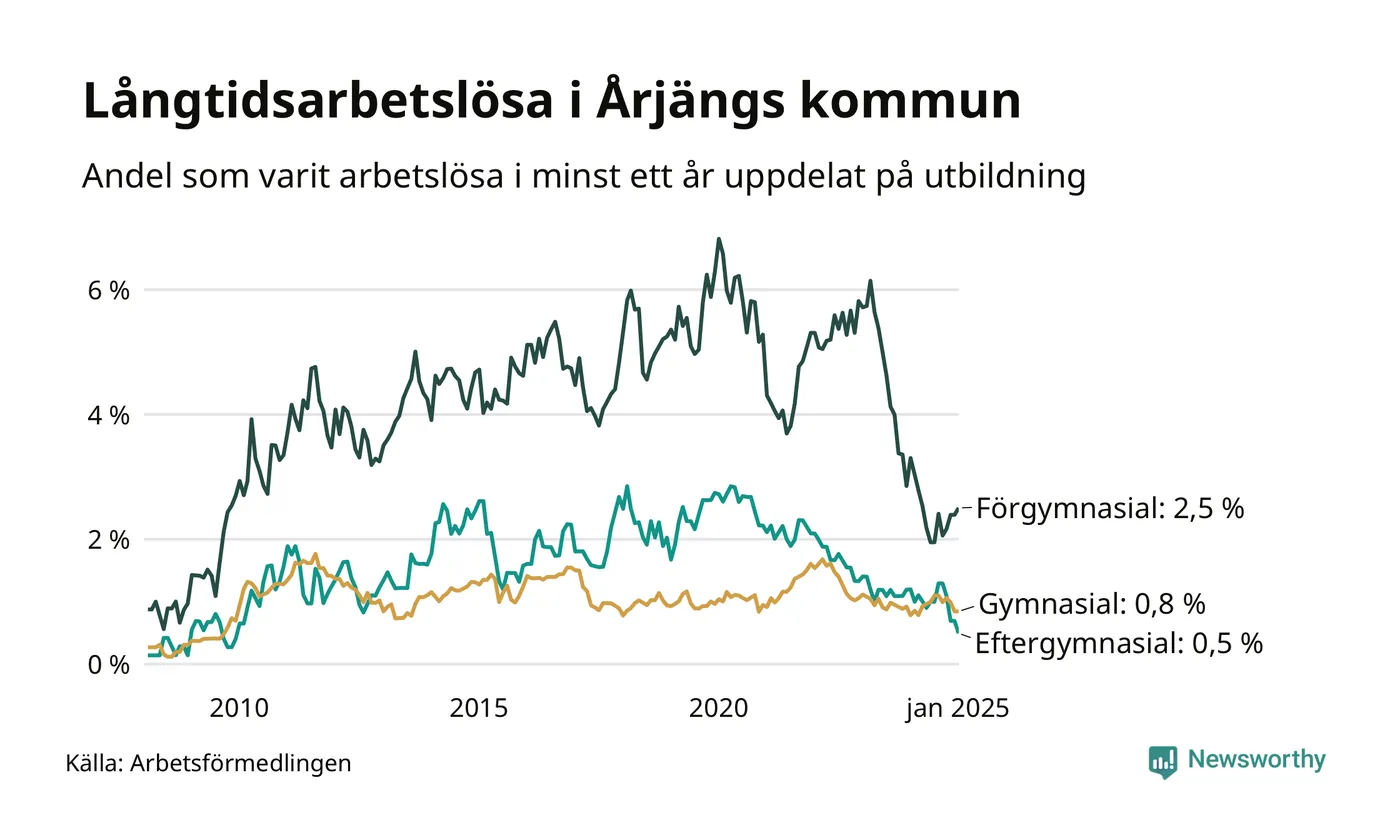 | Andel arbetslösa i minst två år | 0,5 % | 1,4 % | 1,5 % |