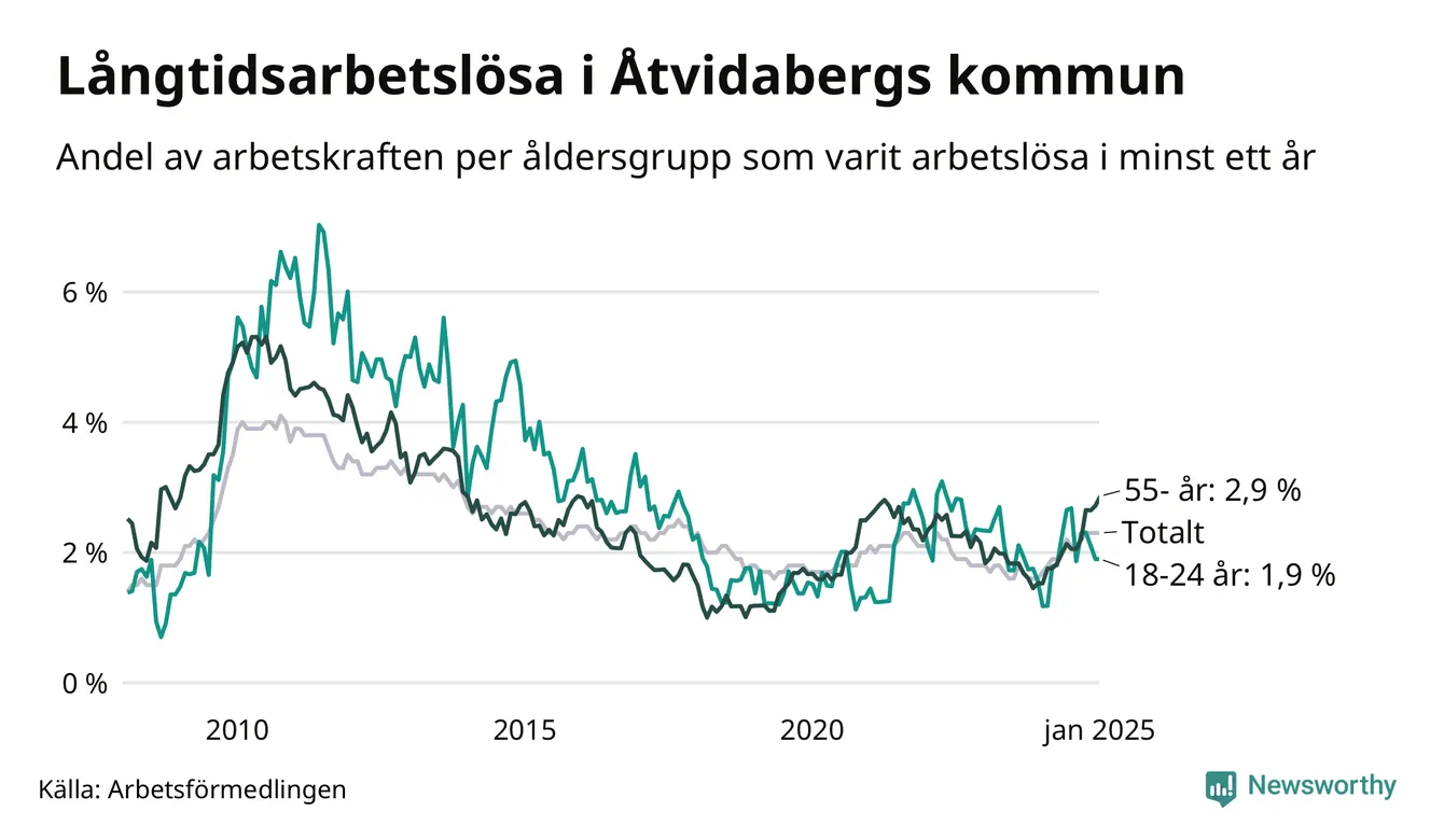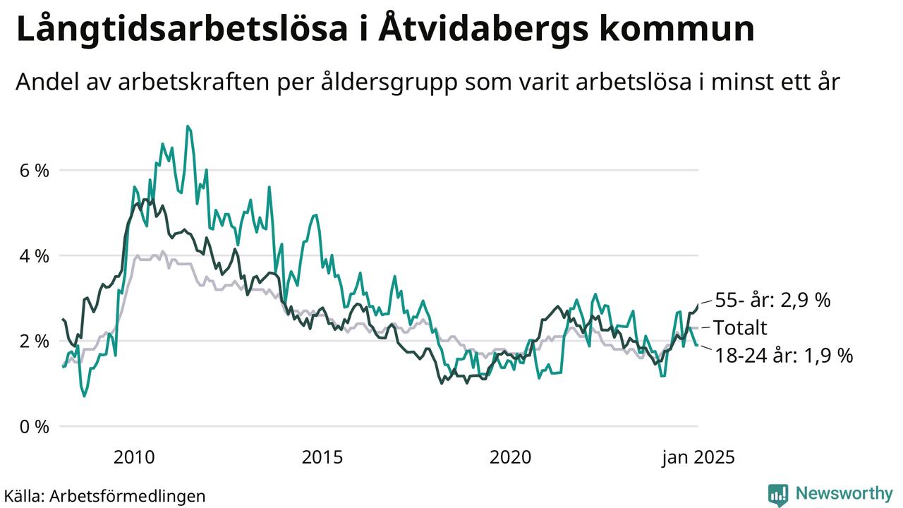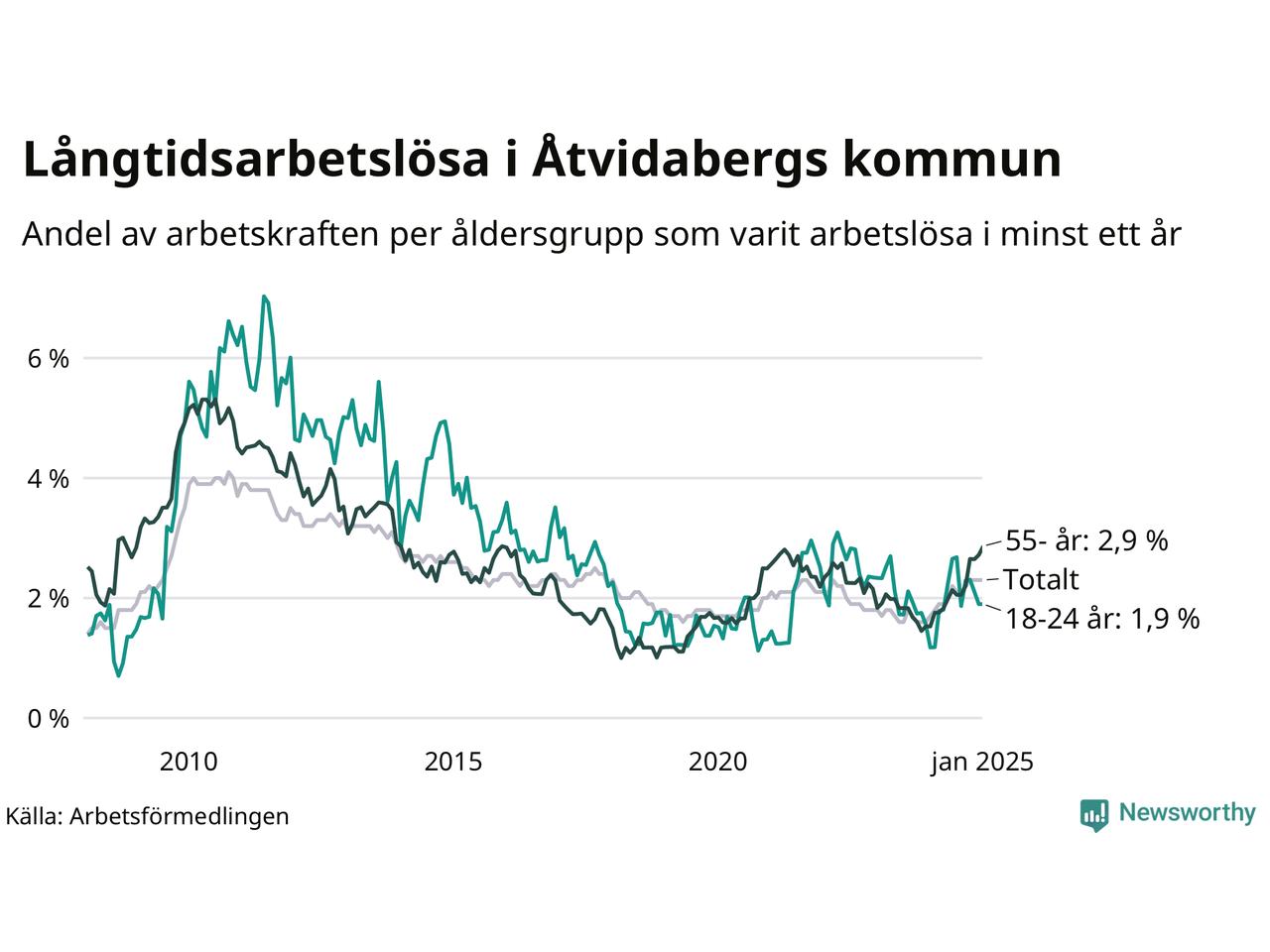 Av de 124 personerna som varit arbetslösa i mer än ett år i Åtvidabergs kommun är 38 personer mellan 55 och 651 år och nio är mellan 18 och 24 år. För den äldre gruppen är andelen arbetslösa 2,9 procent medan den i den yngre gruppen är 1,9 procent. Även i riket som helhet är långtidsarbetslösheten högre i gruppen äldre.