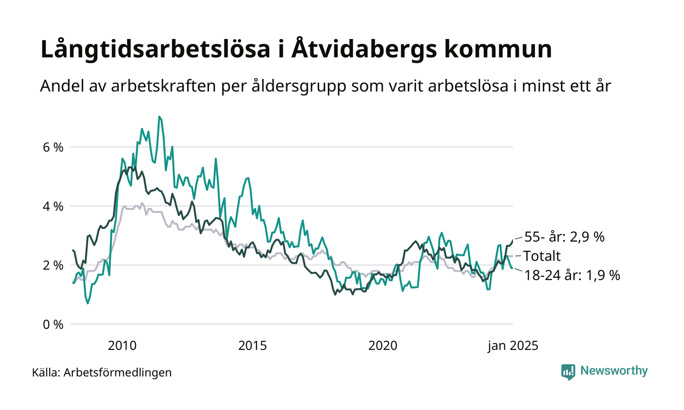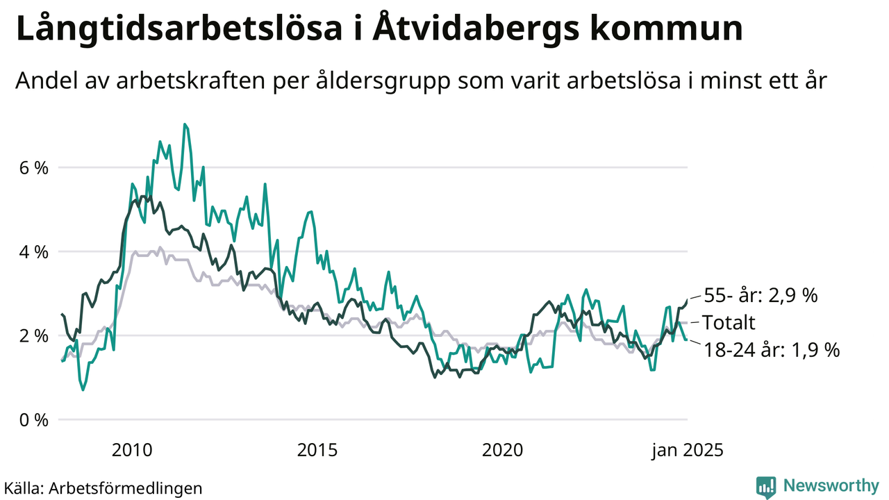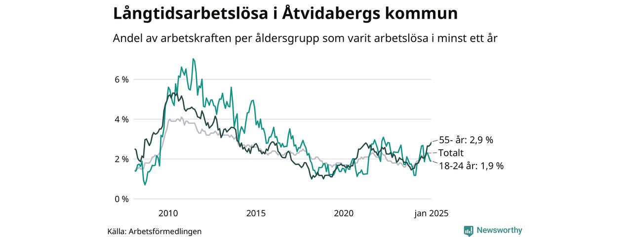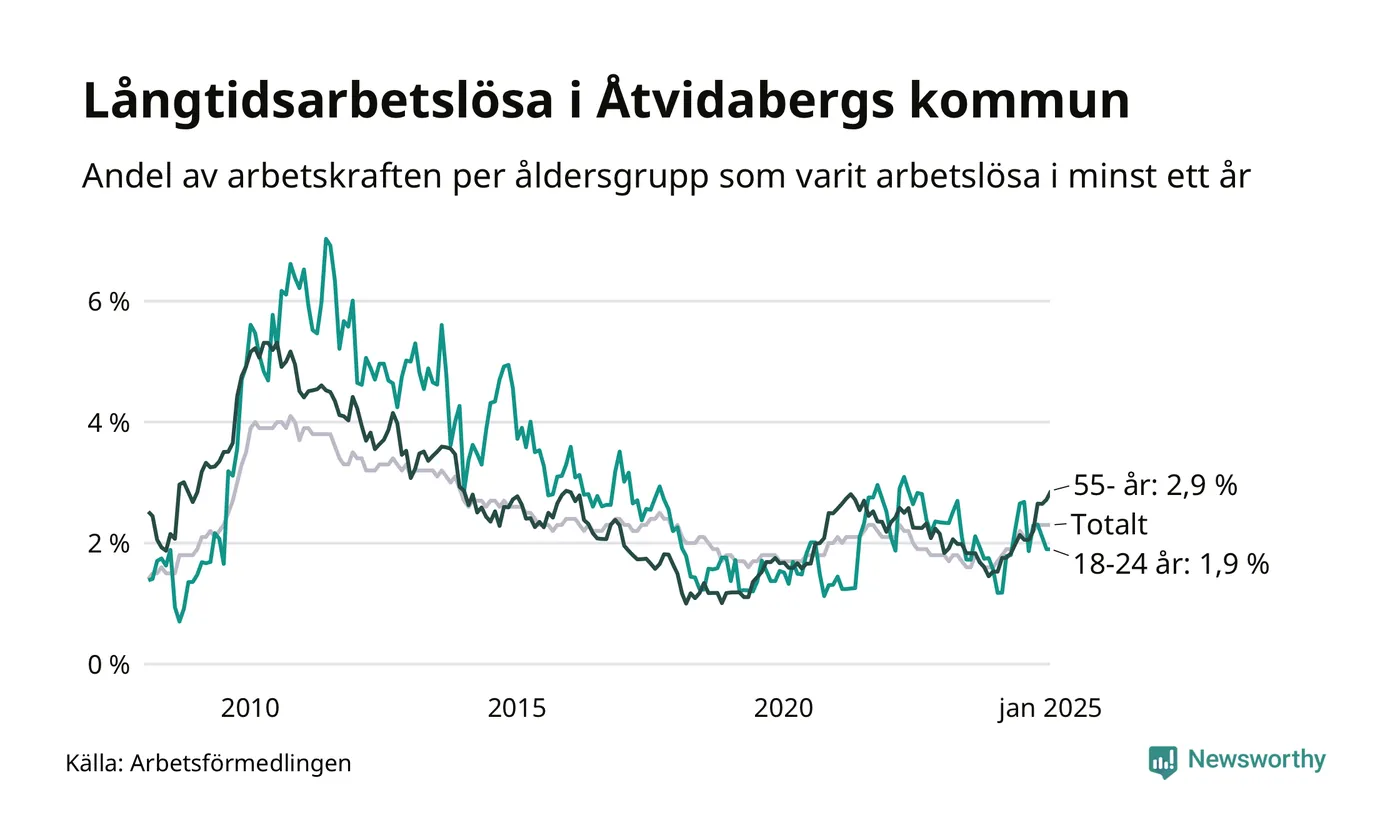 Av de 124 personerna som varit arbetslösa i mer än ett år i Åtvidabergs kommun är 38 personer mellan 55 och 651 år och nio är mellan 18 och 24 år. För den äldre gruppen är andelen arbetslösa 2,9 procent medan den i den yngre gruppen är 1,9 procent. Även i riket som helhet är långtidsarbetslösheten högre i gruppen äldre.