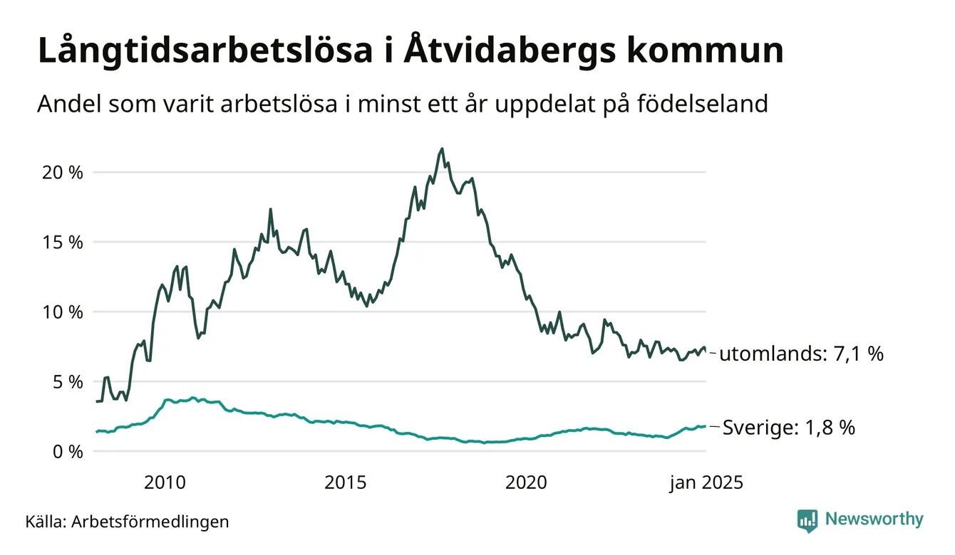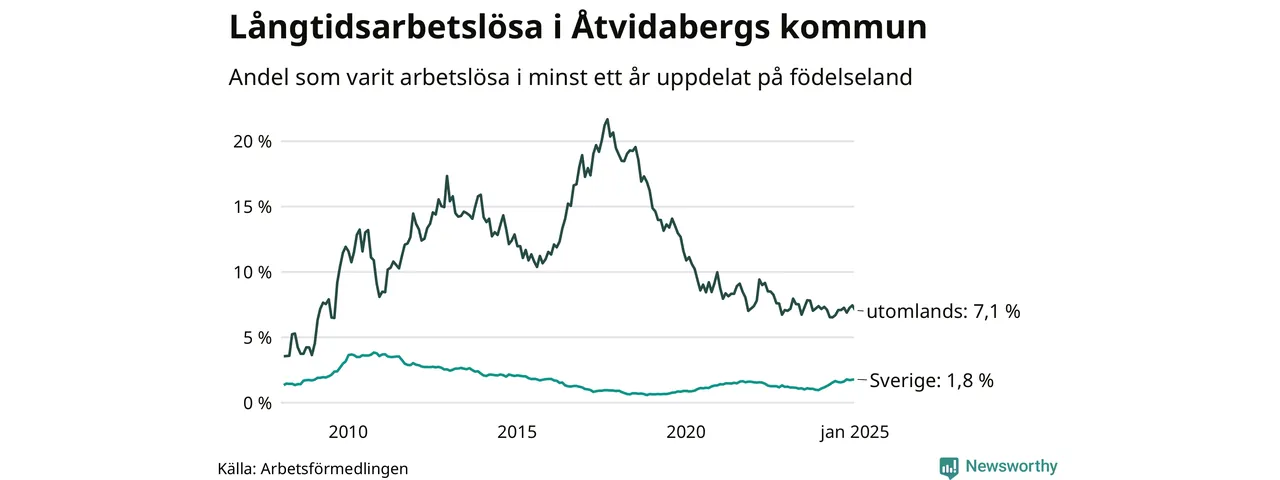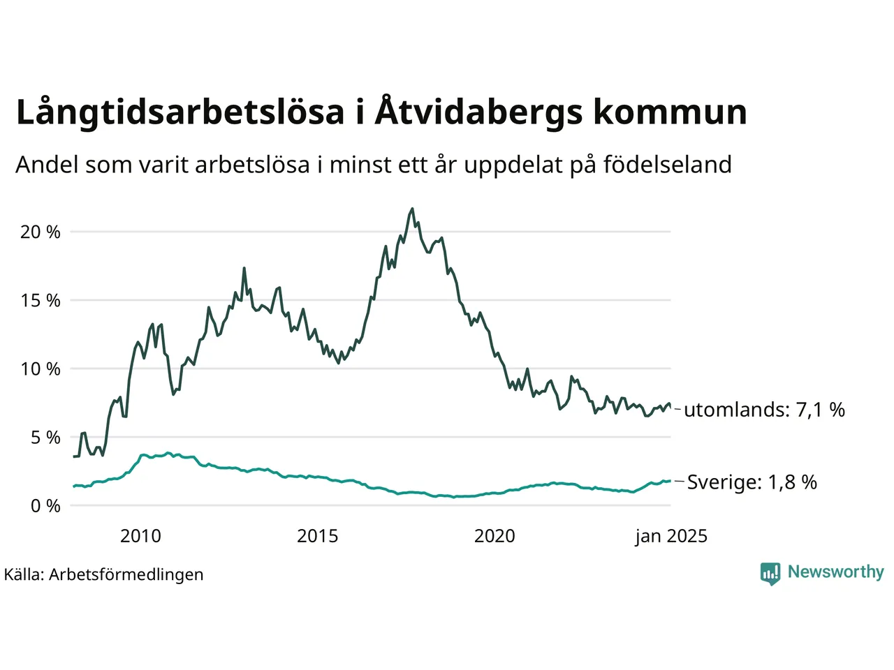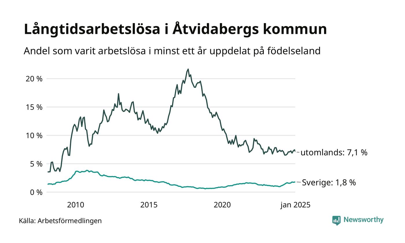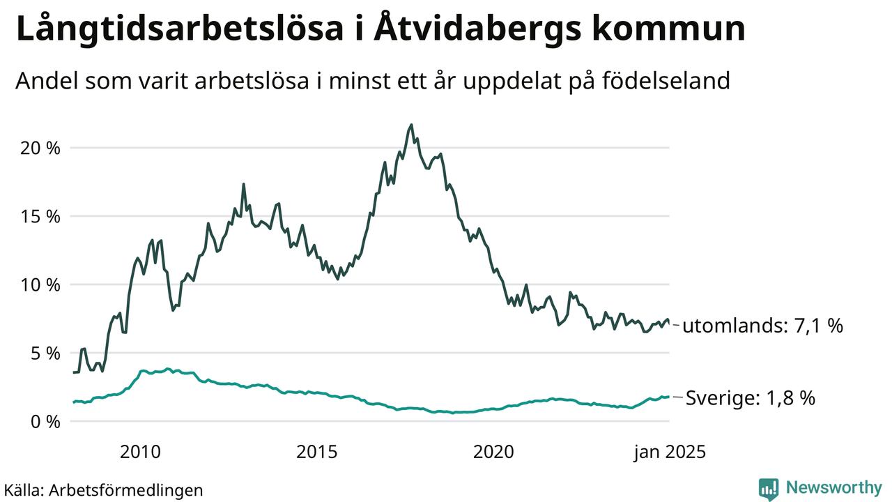 86 av de långtidsarbetslösa i Åtvidaberg är födda i Sverige, medan 38 är födda utomlands. Det innebär att långtidsarbetslösheten bland Sverigefödda är 1,8 procent, medan den är fyra gånger så hög – 7,1 procent – bland födda utomlands. Även i riket som helhet är arbetslösheten högre bland utrikesfödda.
