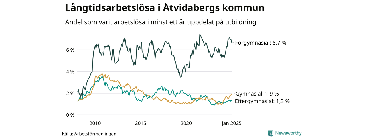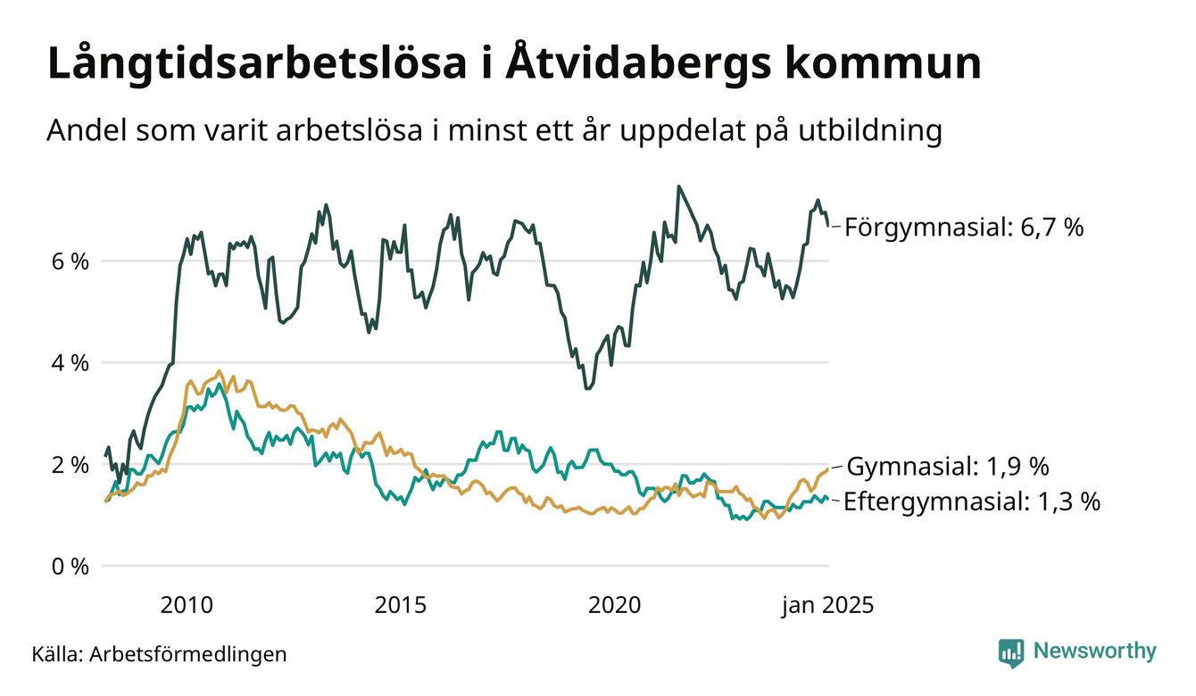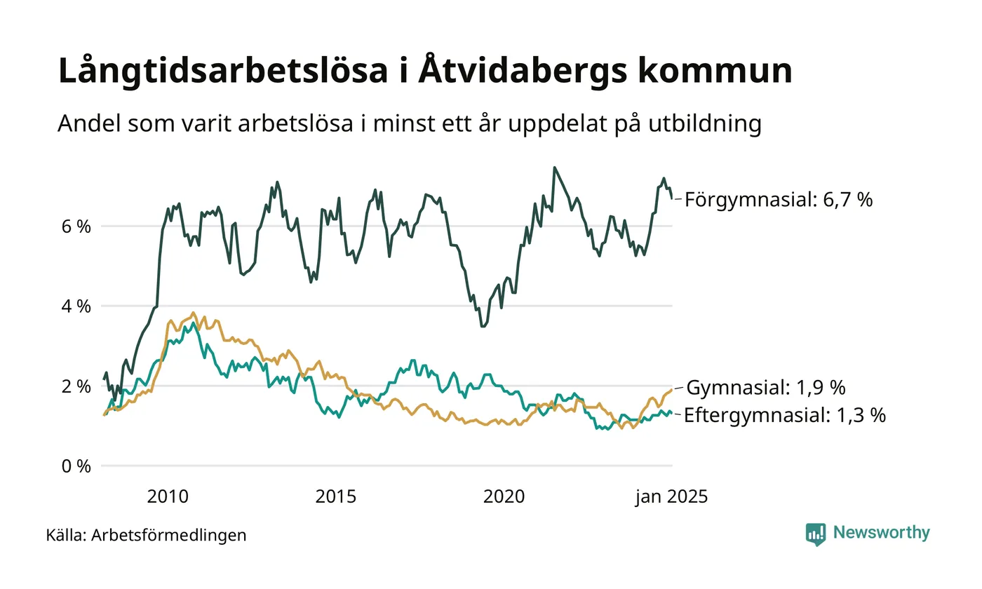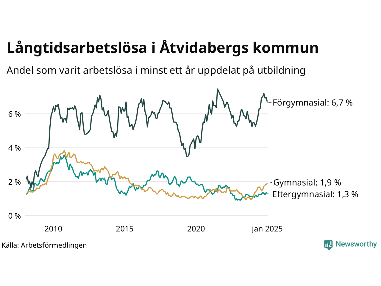 Även när det gäller utbildningsnivå är skillnaderna stora. 45 av de som varit arbetslösa i minst ett år har inte någon gymnasieutbildning, vilket motsvarar en långtidsarbetslöhet på 6,7 procent i den gruppen. Det kan jämföras med 1,9 procent bland dem som gått ut gymnasiet och 1,3 procent bland dem som studerat vidare efter gymnasiet.