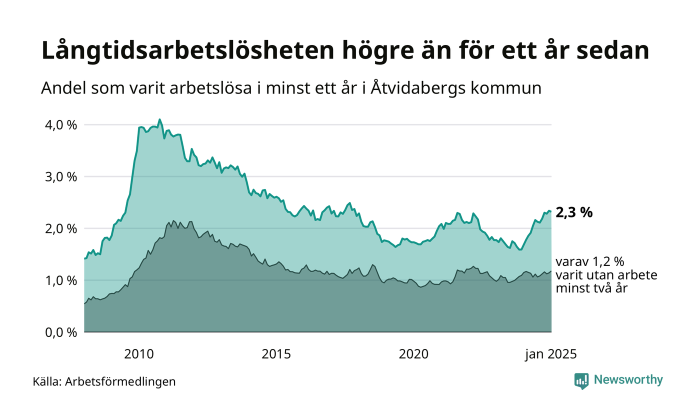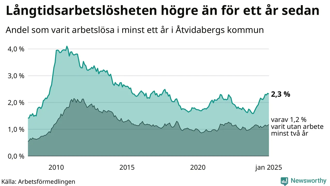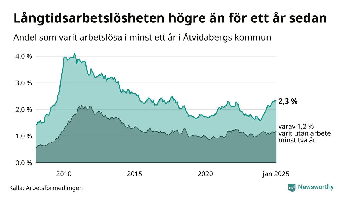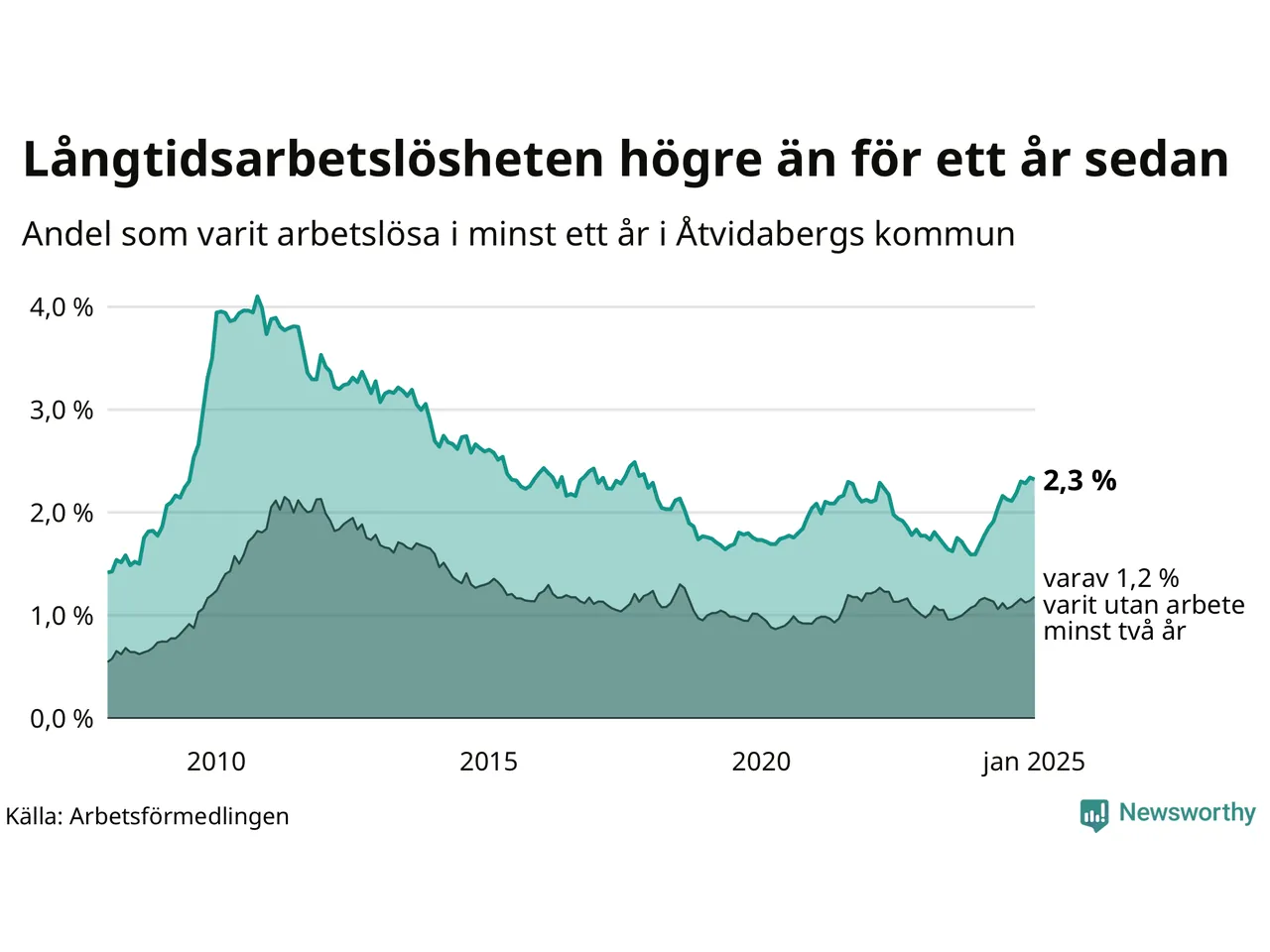 I januari hade 124 Åtvidabergsbor varit arbetslösa i minst ett år, vilket är en färre än månaden innan. 124 personer motsvarar 2,3 procent av arbetskraften i kommunen – andelen långtidsarbetslösa är 0,6 procentenheter högre än samma månad för ett år sedan.