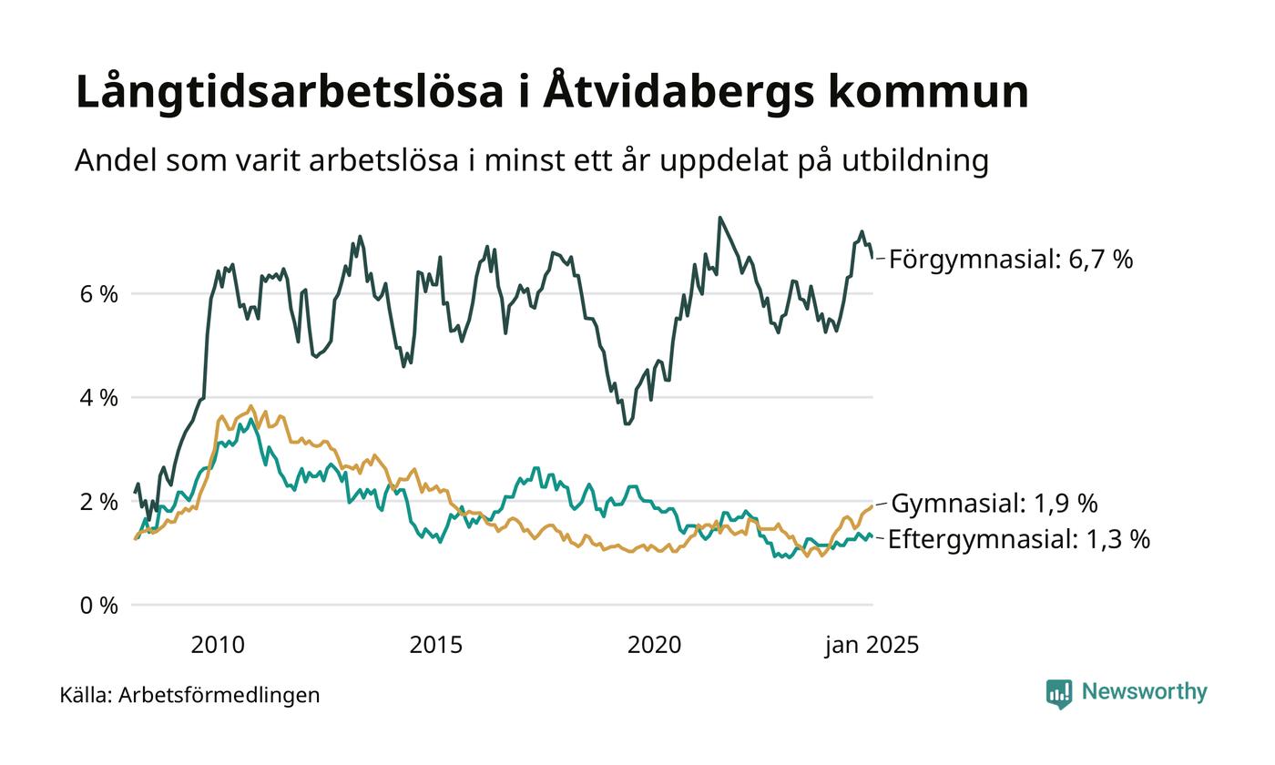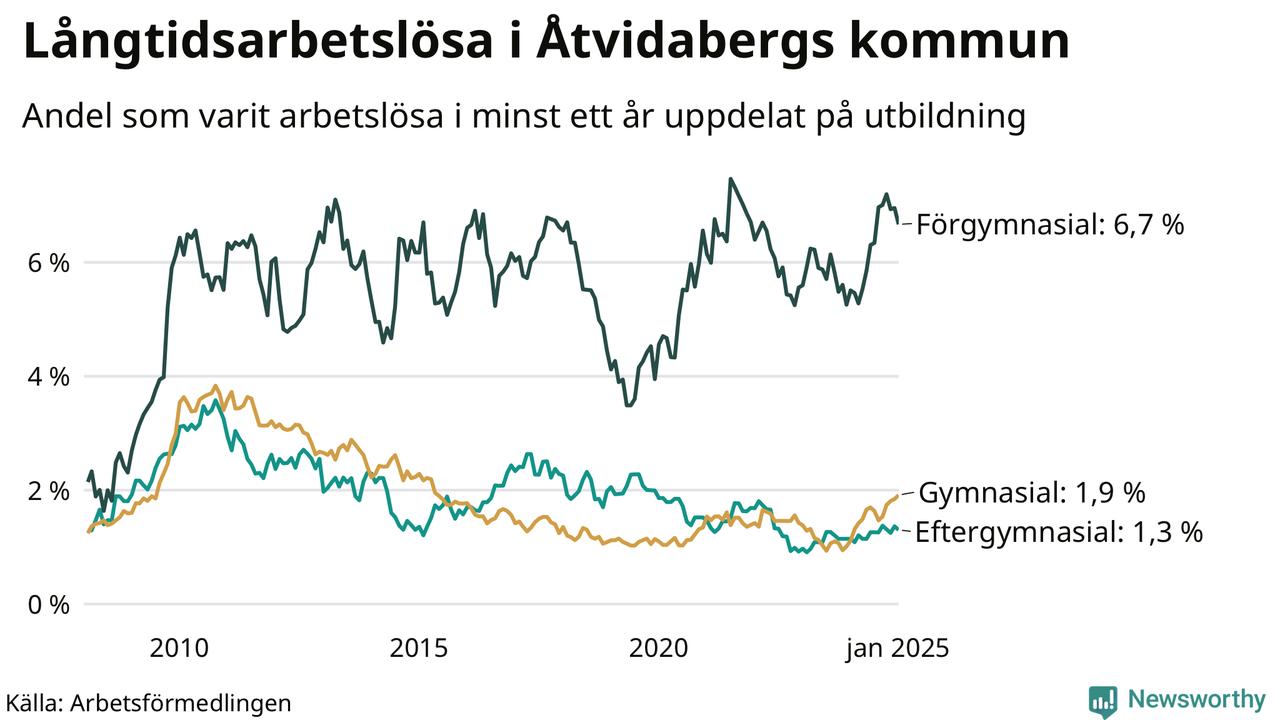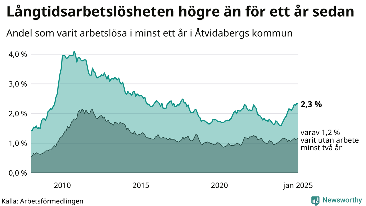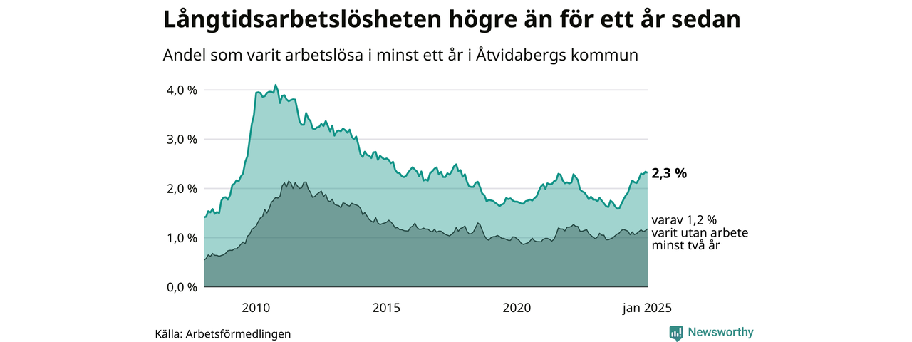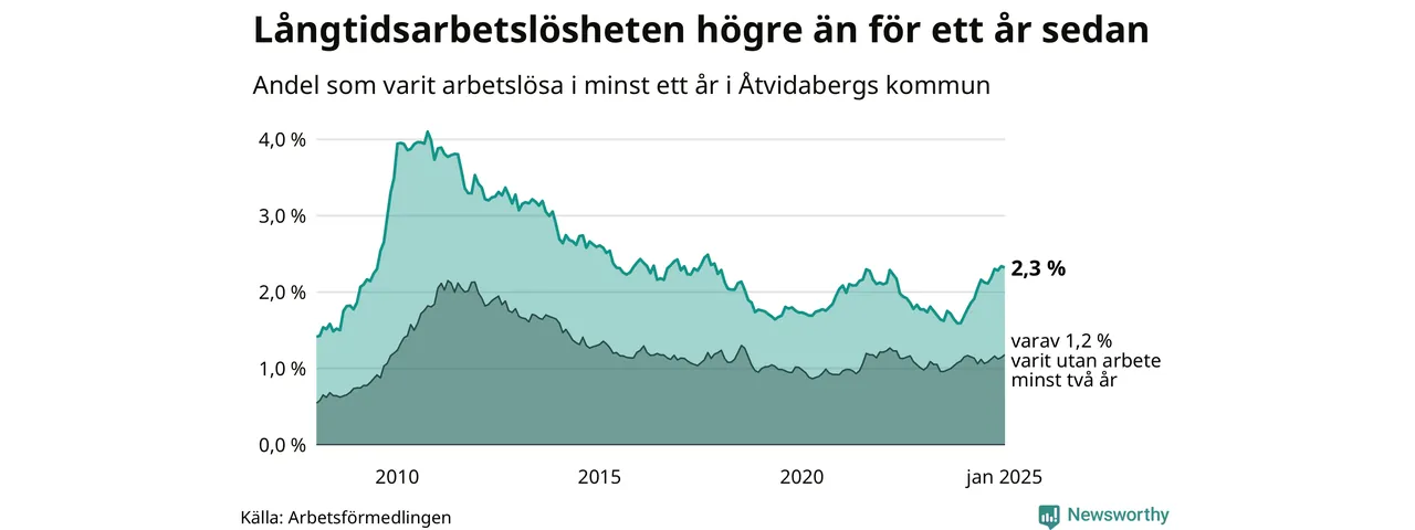 I januari hade 124 Åtvidabergsbor varit arbetslösa i minst ett år, vilket är en färre än månaden innan. 124 personer motsvarar 2,3 procent av arbetskraften i kommunen – andelen långtidsarbetslösa är 0,6 procentenheter högre än samma månad för ett år sedan.