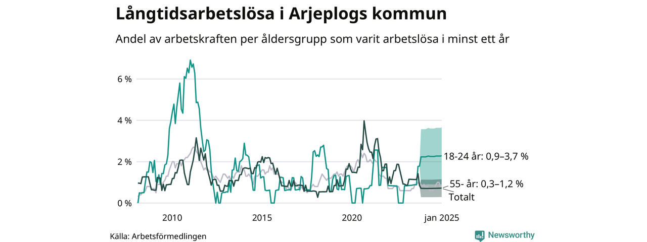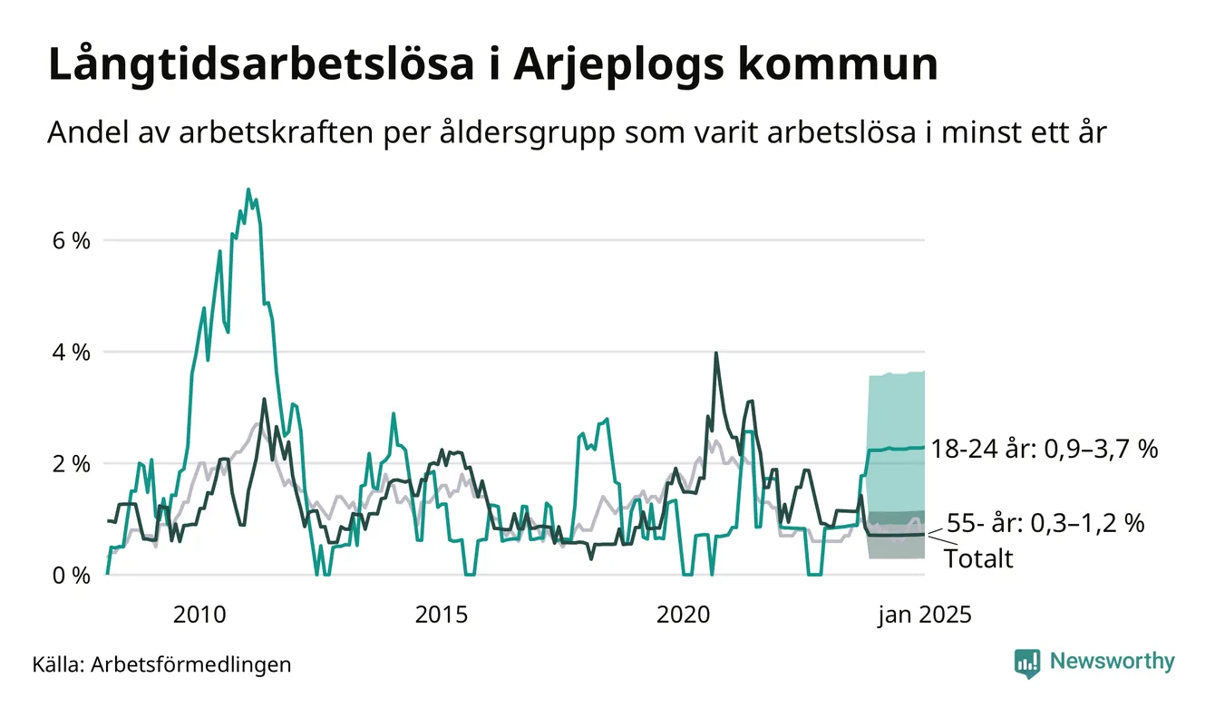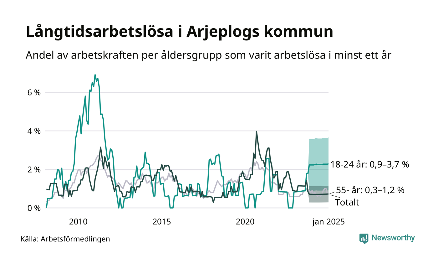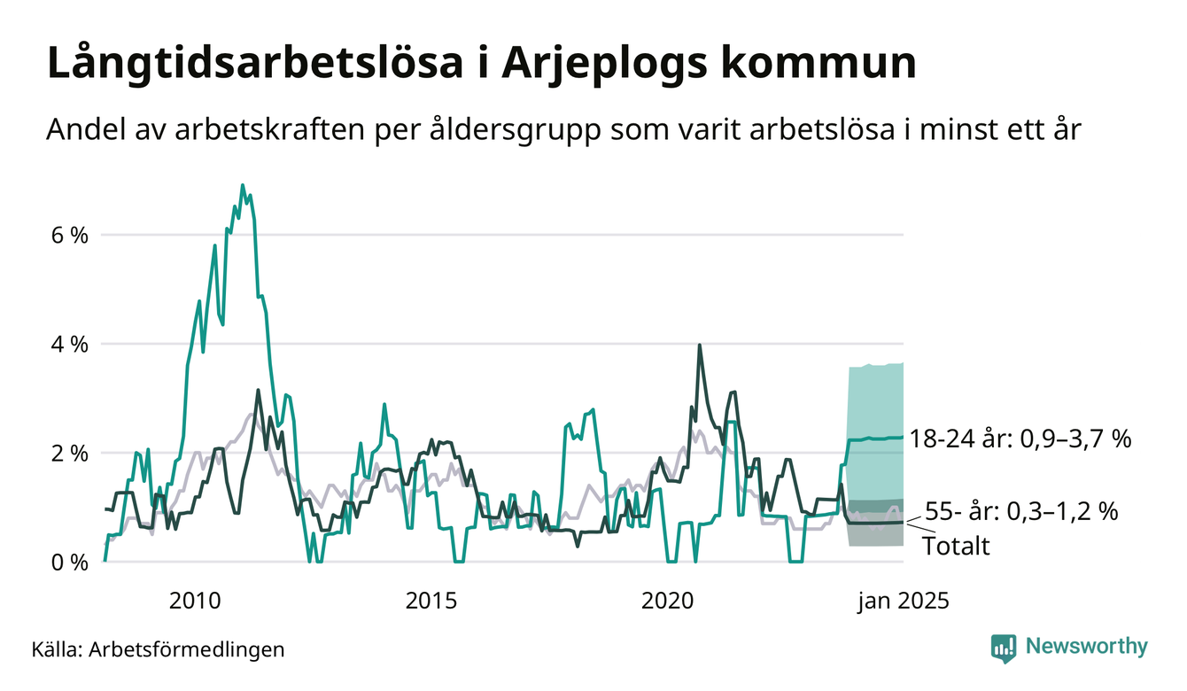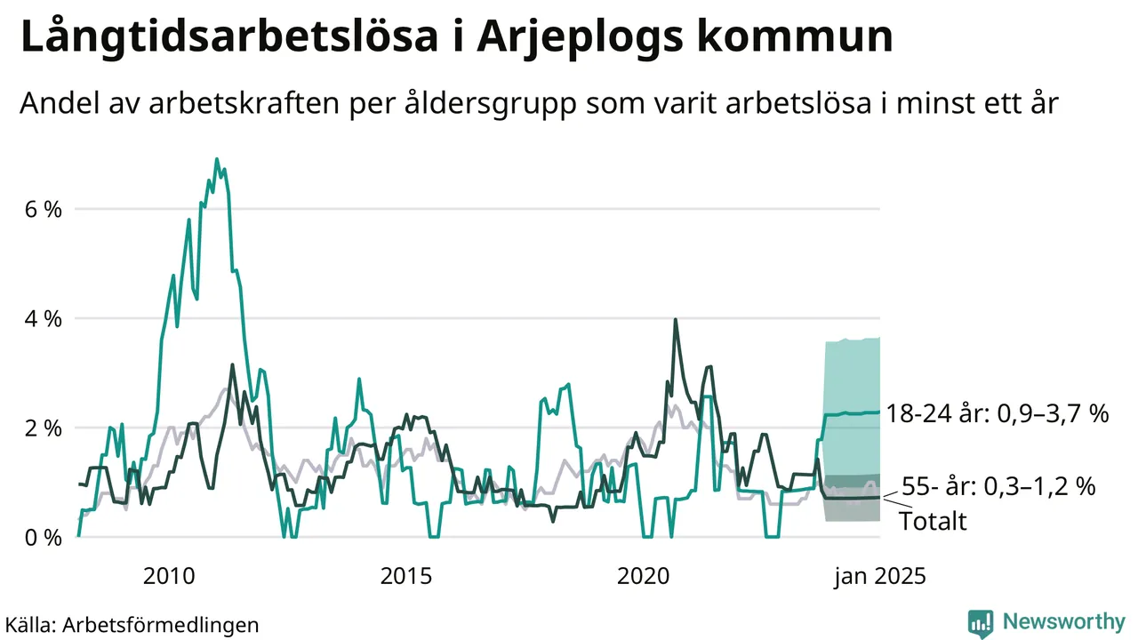 I såväl gruppen 18–24 år som bland dem mellan 55 och 65 år1 har färre än fem personer i Arjeplogs kommun varit arbetslösa i mer än ett år. Det motsvarar någonstans mellan 0,9 och 3,7 respektive 0,3 och 1,2 procent.