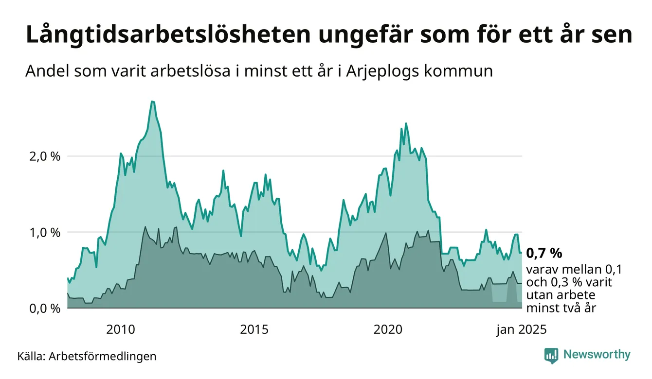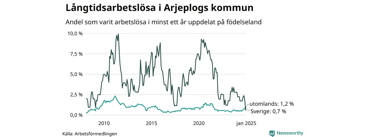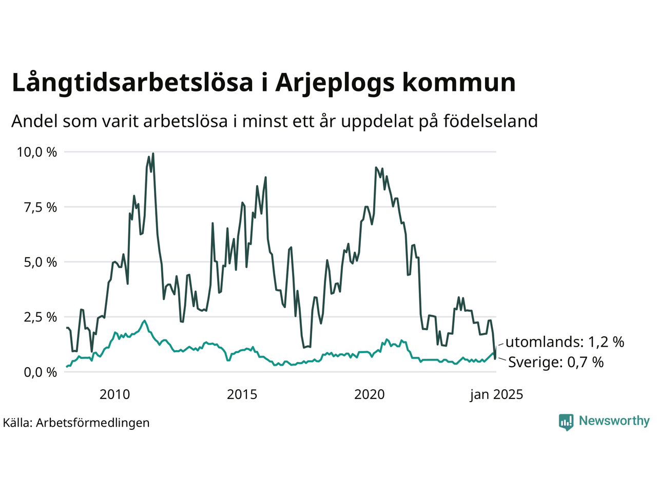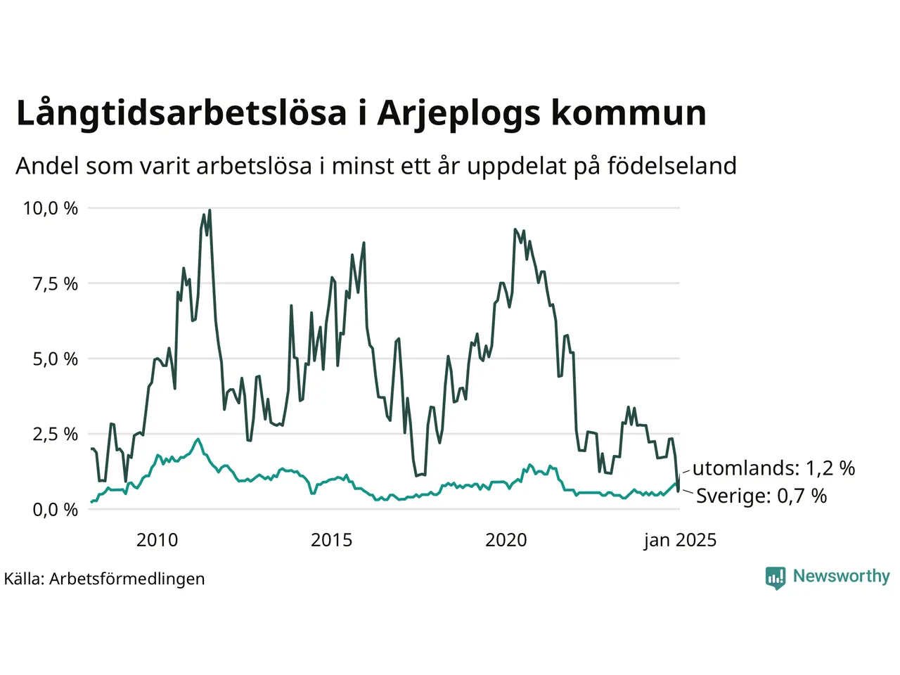 I januari hade nio Arjeplogsbor varit arbetslösa i minst ett år, vilket är lika många som månaden innan. Nio personer motsvarar 0,7 procent av arbetskraften i kommunen – andelen långtidsarbetslösa är ungefär på samma nivå som för ett år sedan. Arjeplogs kommun hade näst lägst andel långtidsarbetslösa i landet i januari.