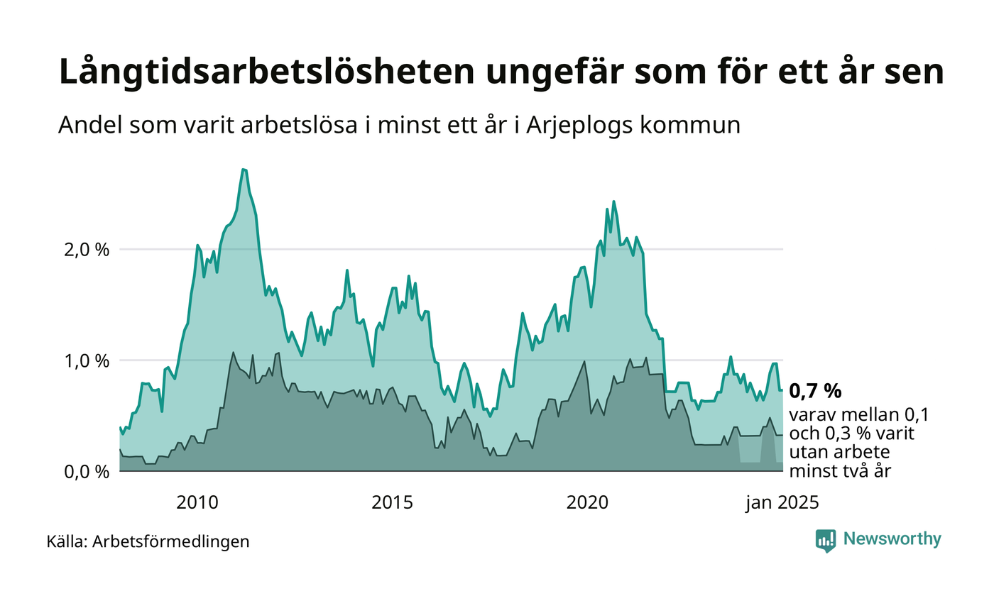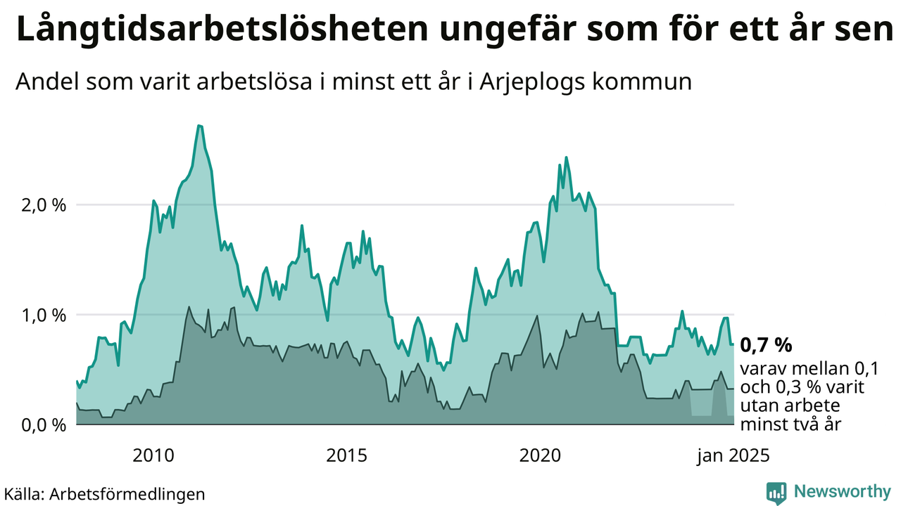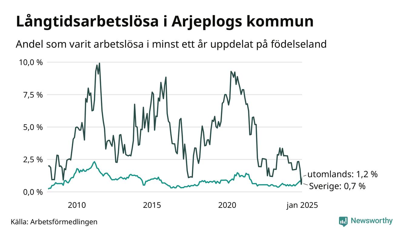 I januari hade nio Arjeplogsbor varit arbetslösa i minst ett år, vilket är lika många som månaden innan. Nio personer motsvarar 0,7 procent av arbetskraften i kommunen – andelen långtidsarbetslösa är ungefär på samma nivå som för ett år sedan. Arjeplogs kommun hade näst lägst andel långtidsarbetslösa i landet i januari.