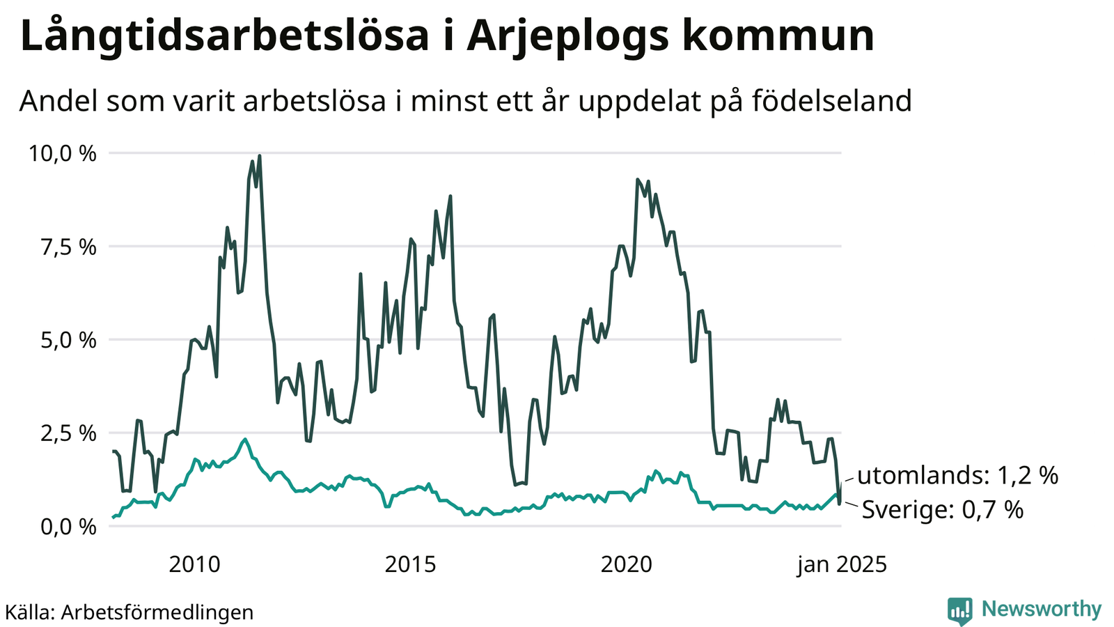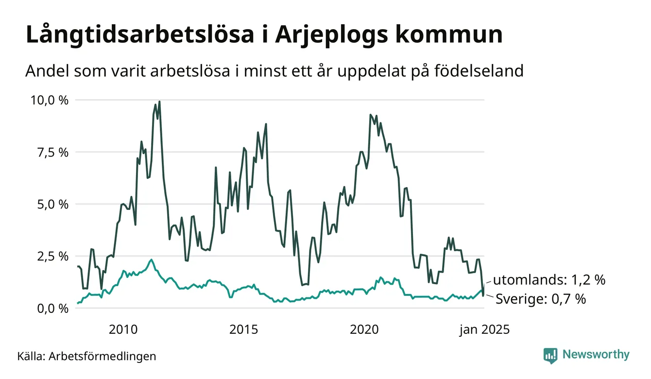 Sju av de långtidsarbetslösa i Arjeplog är födda i Sverige, medan två är födda utomlands. Det innebär att långtidsarbetslösheten bland Sverigefödda är 0,7 procent, medan den är 1,2 procent bland födda utomlands. Även i riket som helhet är arbetslösheten högre bland utrikesfödda.