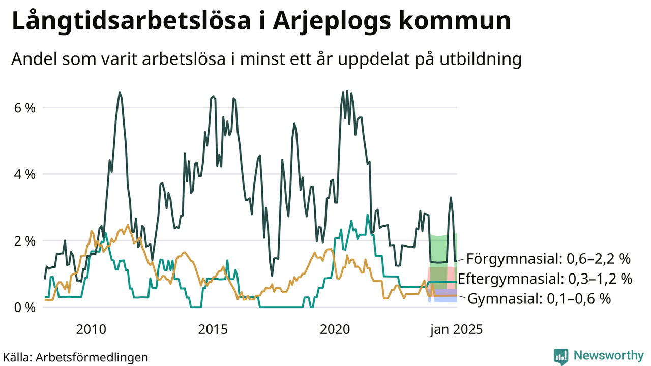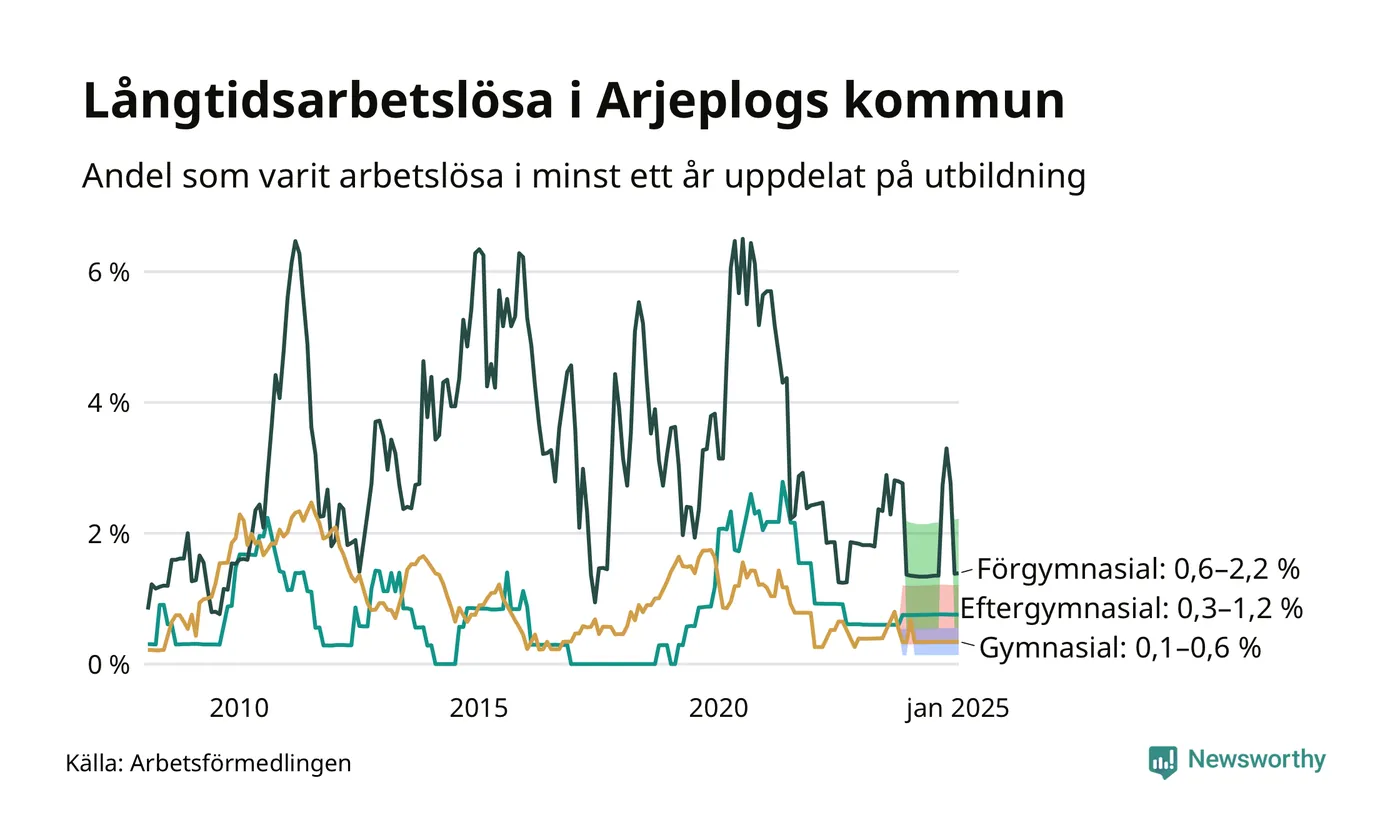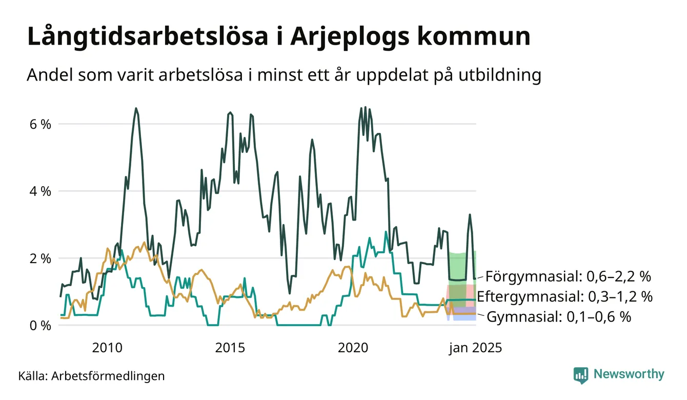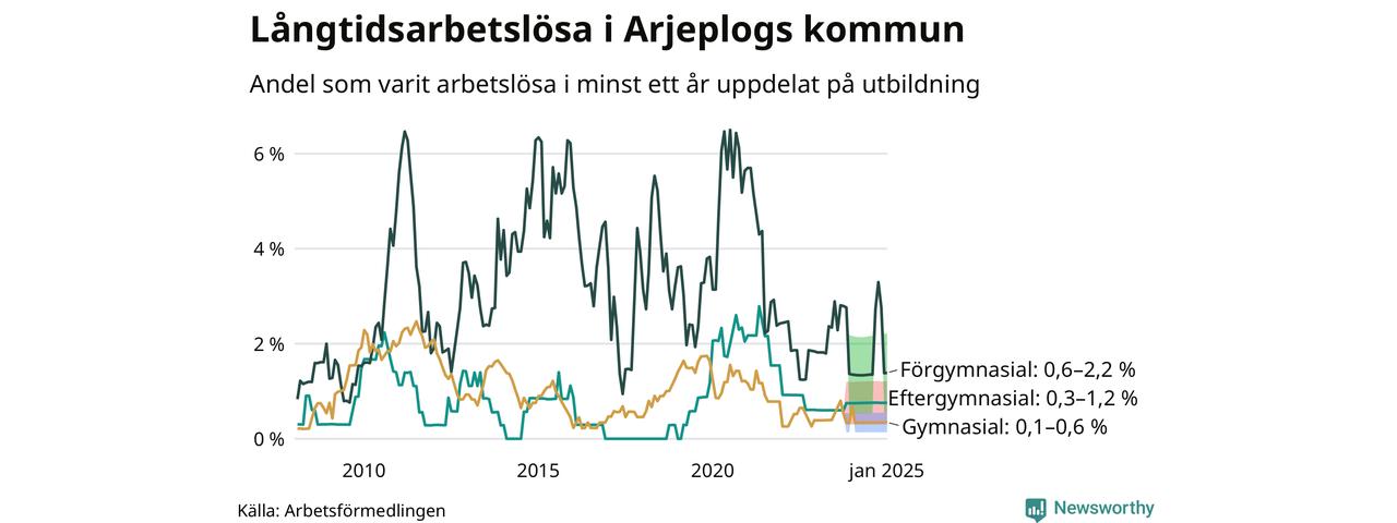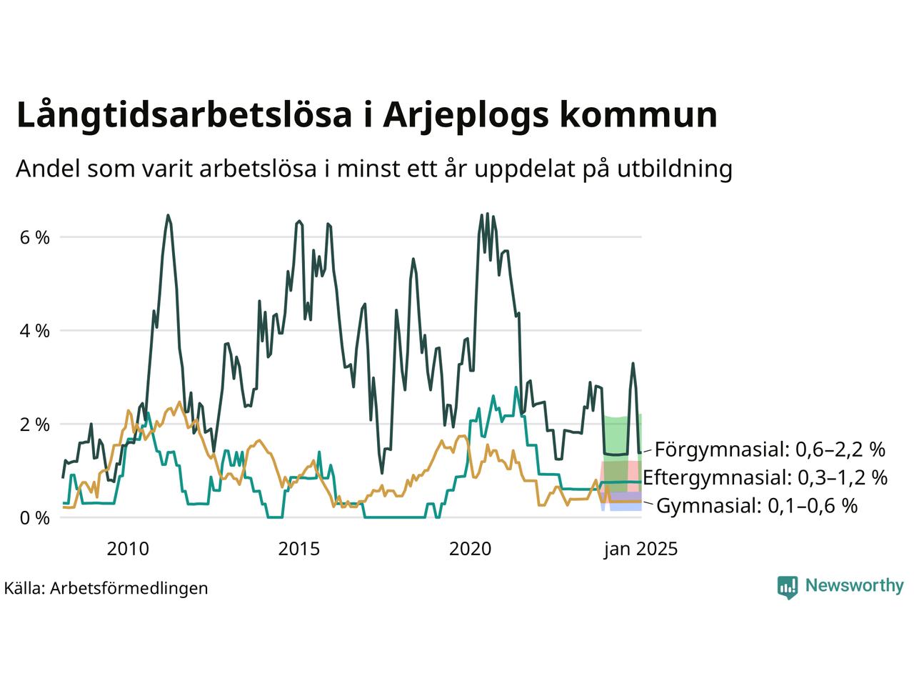 Tittar man på antal arbetslösa nedbrutet på utbildningsnivå i Arjeplogs kommun, rör det sig om färre än fem personer i samtliga grupper – de som inte har någon gymnasieutbildning, de som har en gymnasieutbildning och de som studerat vidare efter gymnasiet.