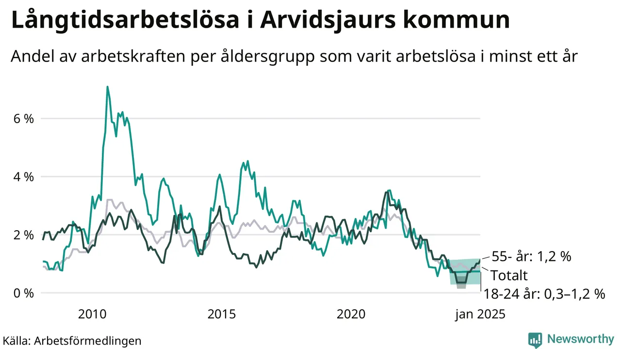 Av de 26 personerna som varit arbetslösa i mer än ett år i Arvidsjaurs kommun är åtta personer mellan 55 och 651 år och mellan en och fyra är mellan 18 och 24 år. För den äldre gruppen är andelen arbetslösa 1,2 procent medan den i den yngre gruppen är mellan 0,3 och 1,2 procent. Även i riket som helhet är långtidsarbetslösheten högre i gruppen äldre.