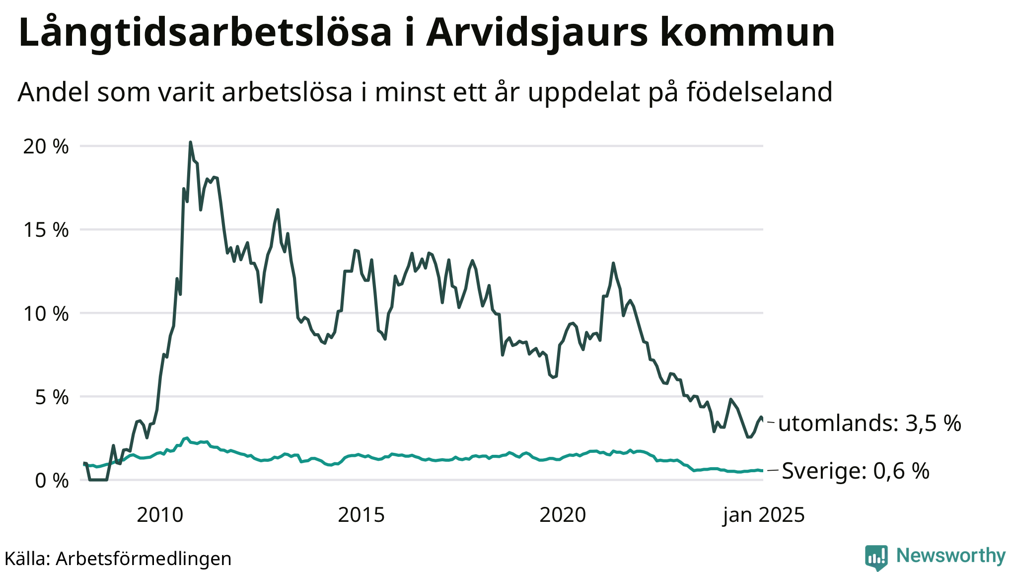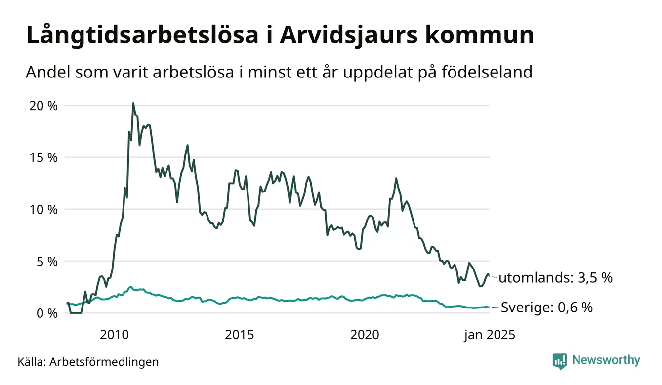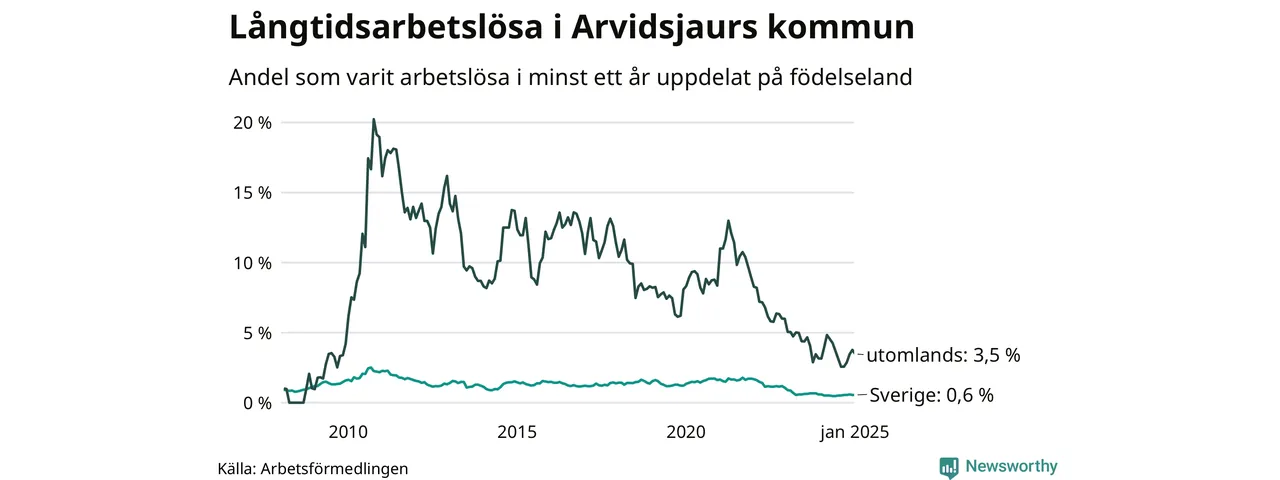 14 av de långtidsarbetslösa i Arvidsjaur är födda i Sverige, medan tolv är födda utomlands. Det innebär att långtidsarbetslösheten bland Sverigefödda är 0,6 procent, medan den är sex gånger så hög – 3,5 procent – bland födda utomlands. Även i riket som helhet är arbetslösheten högre bland utrikesfödda.