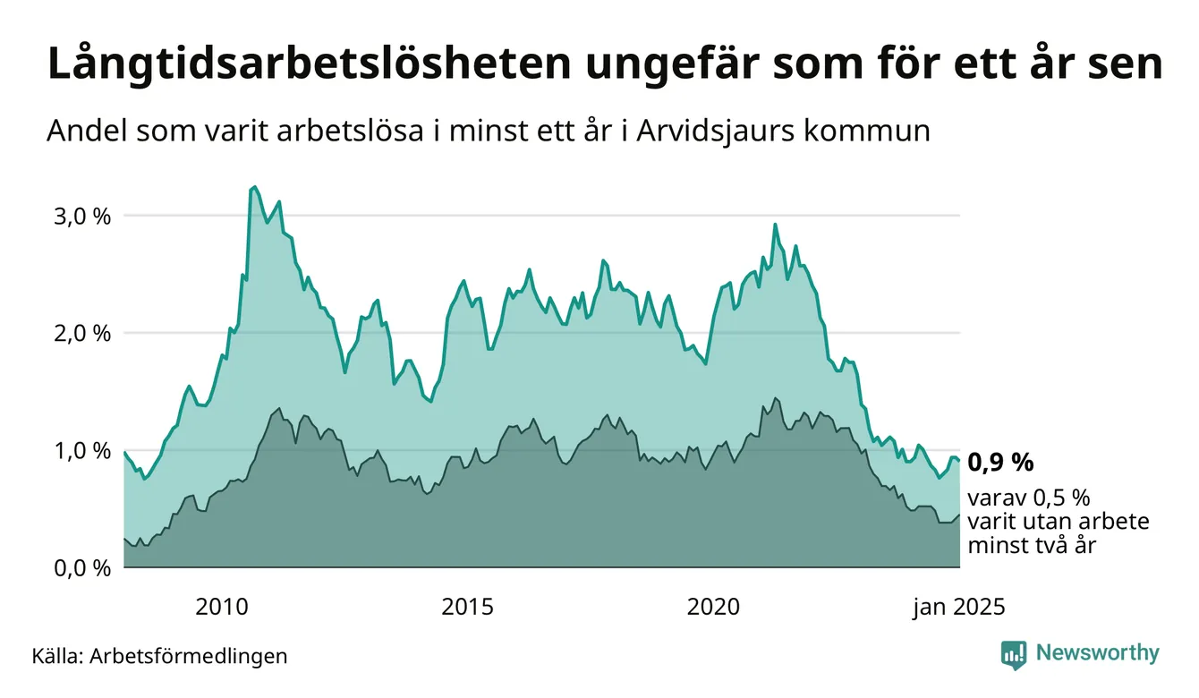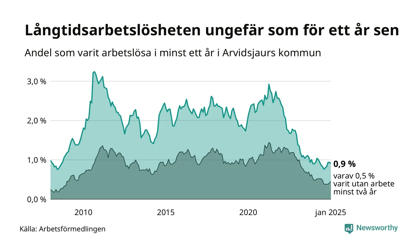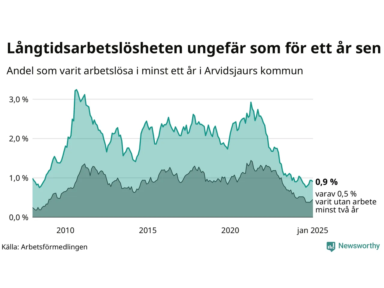 I januari hade 26 Arvidsjaursbor varit arbetslösa i minst ett år, vilket är en färre än månaden innan. Det är den första månaden sedan augusti 2024 som antalet arbetslösa minskar. 26 personer motsvarar 0,9 procent av arbetskraften i kommunen – andelen långtidsarbetslösa är ungefär på samma nivå som för ett år sedan. Arvidsjaur tillhör de kommuner som har lägst andel långtidsarbetslösa i hela landet just nu.