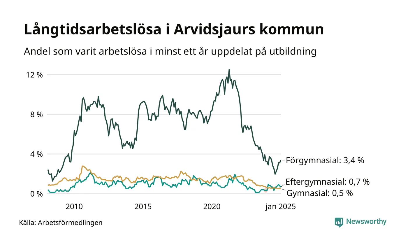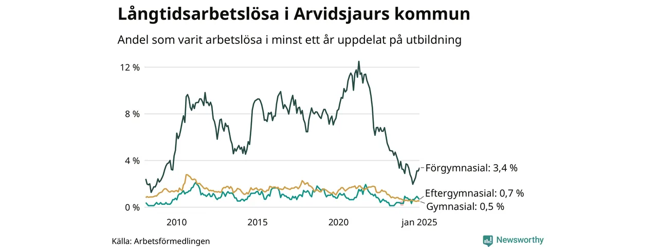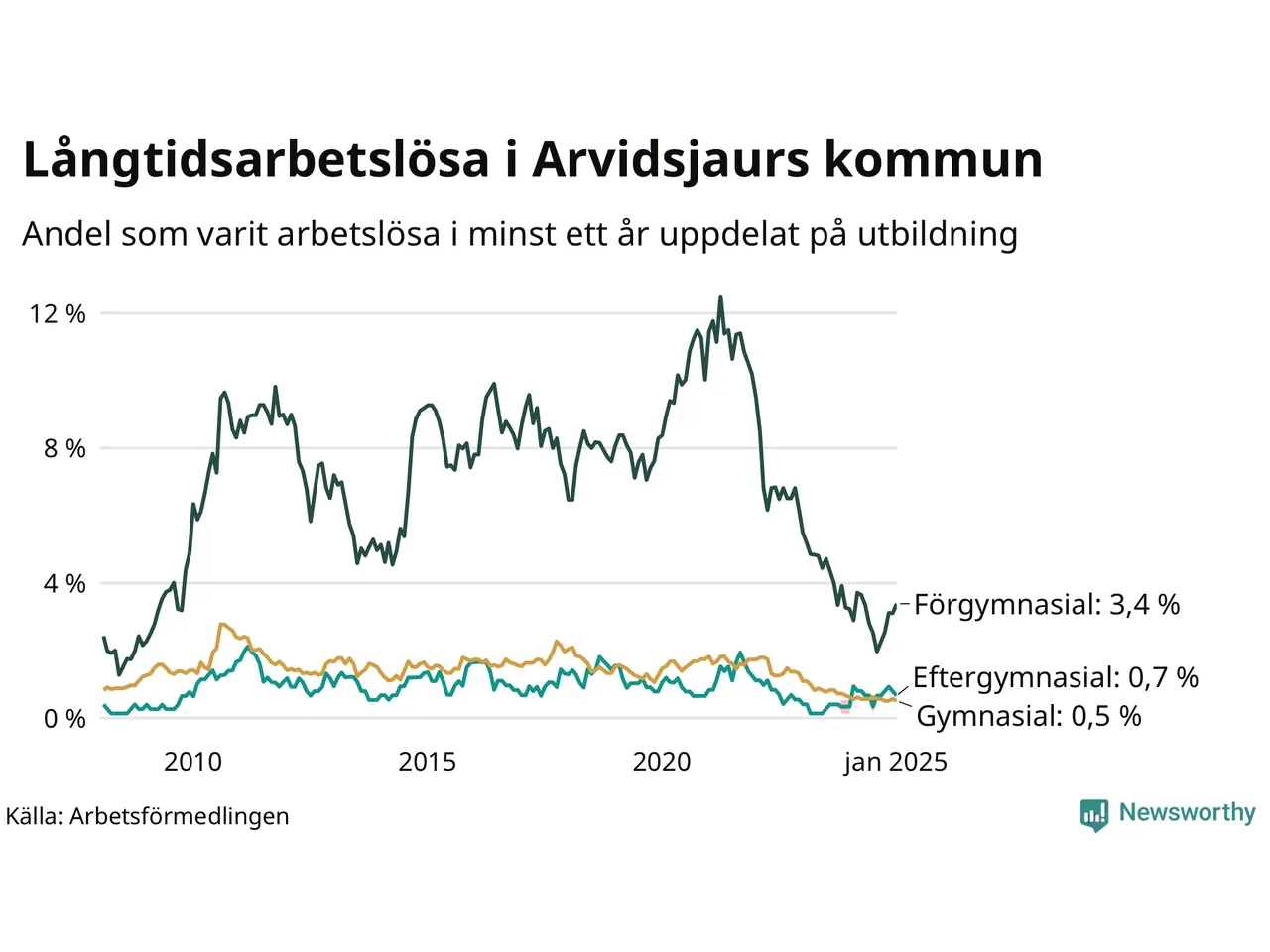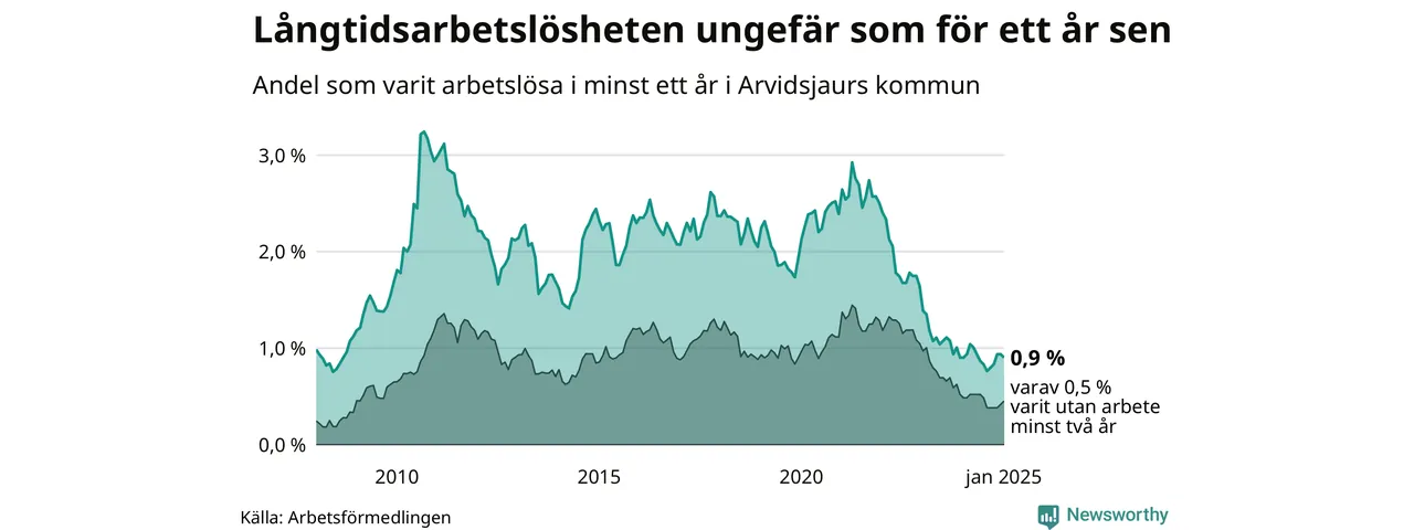 I januari hade 26 Arvidsjaursbor varit arbetslösa i minst ett år, vilket är en färre än månaden innan. Det är den första månaden sedan augusti 2024 som antalet arbetslösa minskar. 26 personer motsvarar 0,9 procent av arbetskraften i kommunen – andelen långtidsarbetslösa är ungefär på samma nivå som för ett år sedan. Arvidsjaur tillhör de kommuner som har lägst andel långtidsarbetslösa i hela landet just nu.