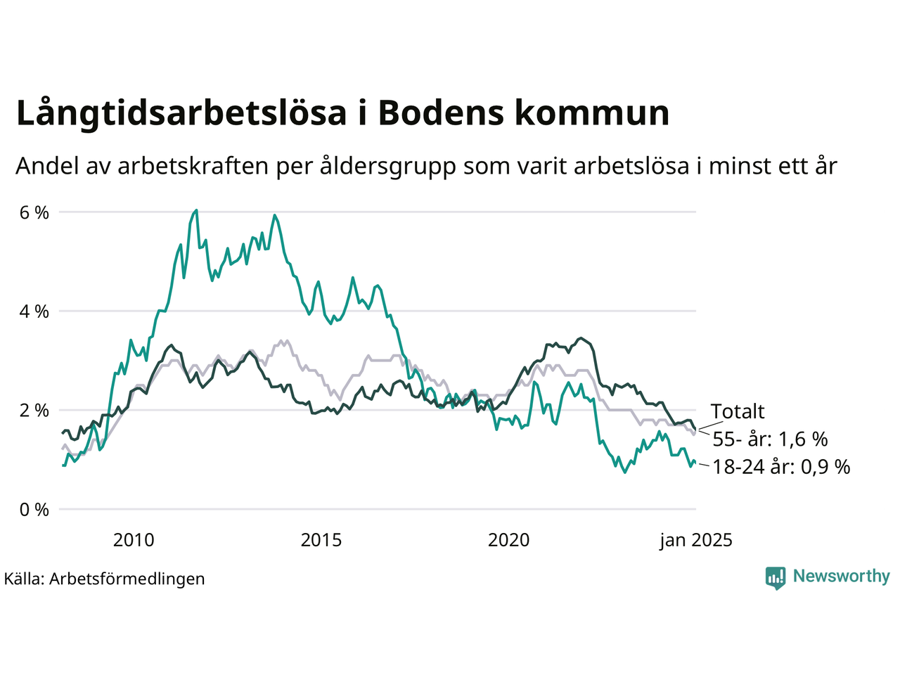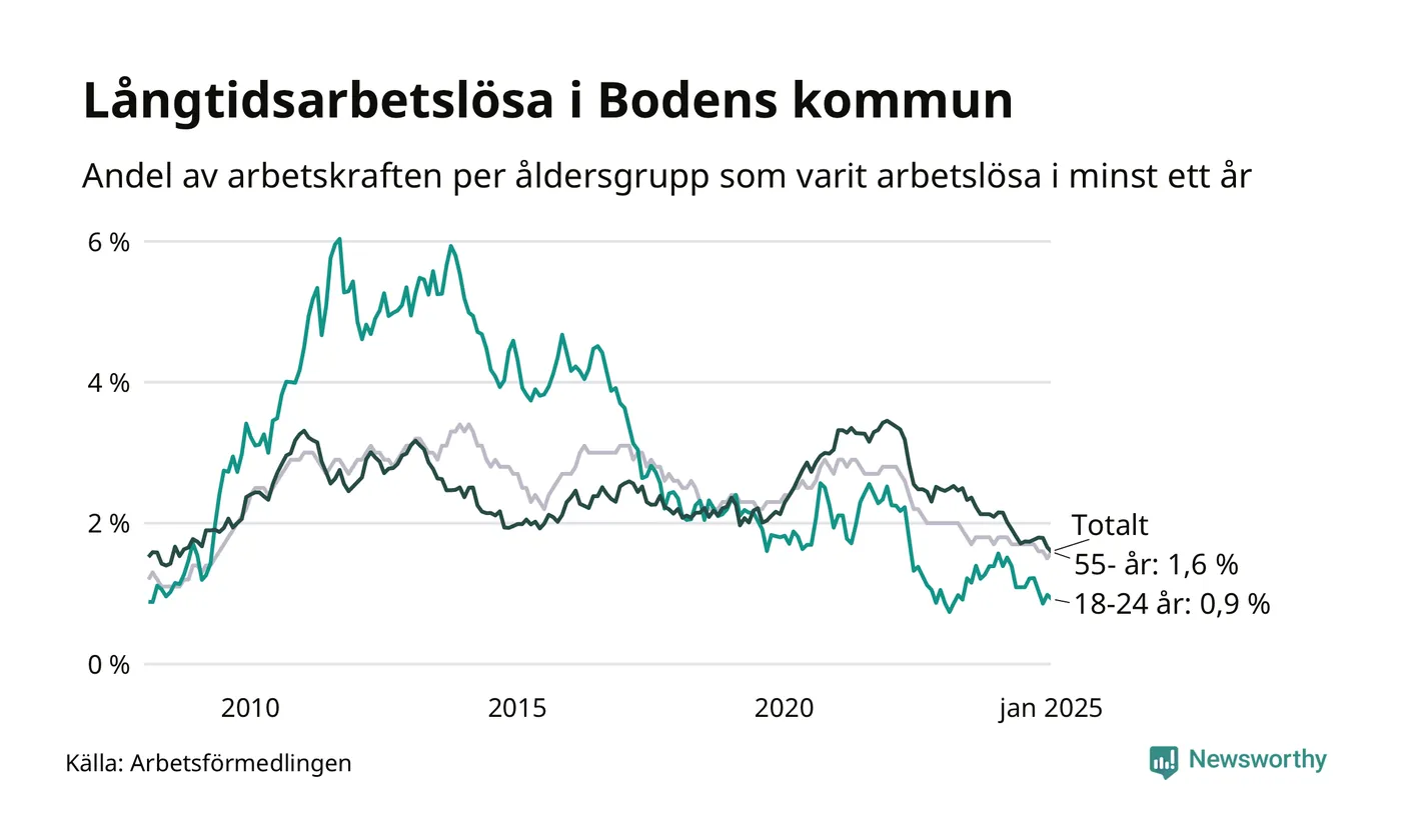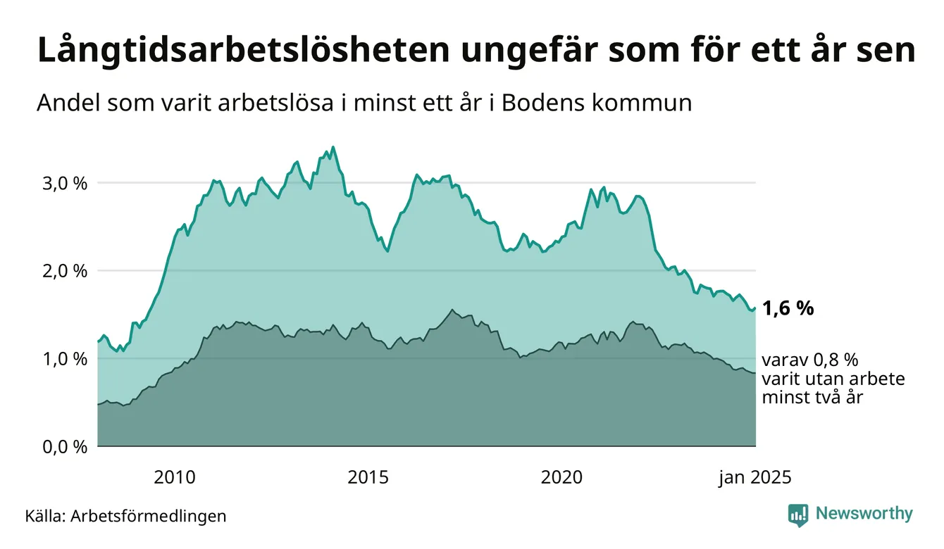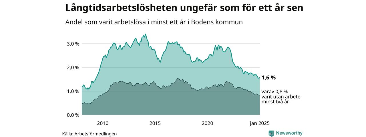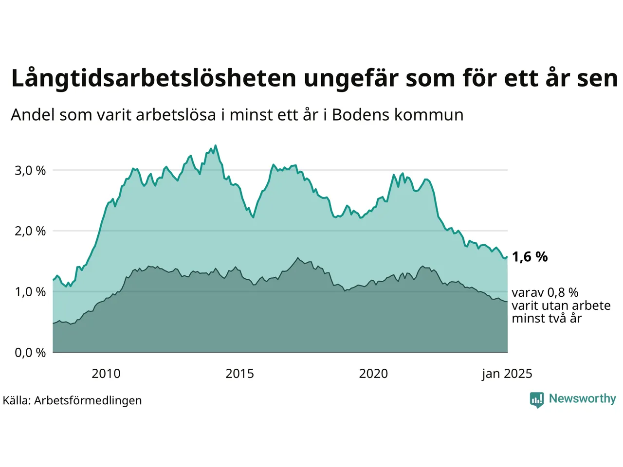 I januari hade 216 Bodenbor varit arbetslösa i minst ett år, vilket är fem fler än månaden innan. Det är den första månaden sedan augusti 2024 som antalet arbetslösa ökar. 216 personer motsvarar 1,6 procent av arbetskraften i kommunen – andelen långtidsarbetslösa är ungefär på samma nivå som för ett år sedan.