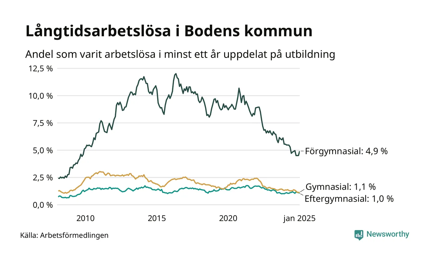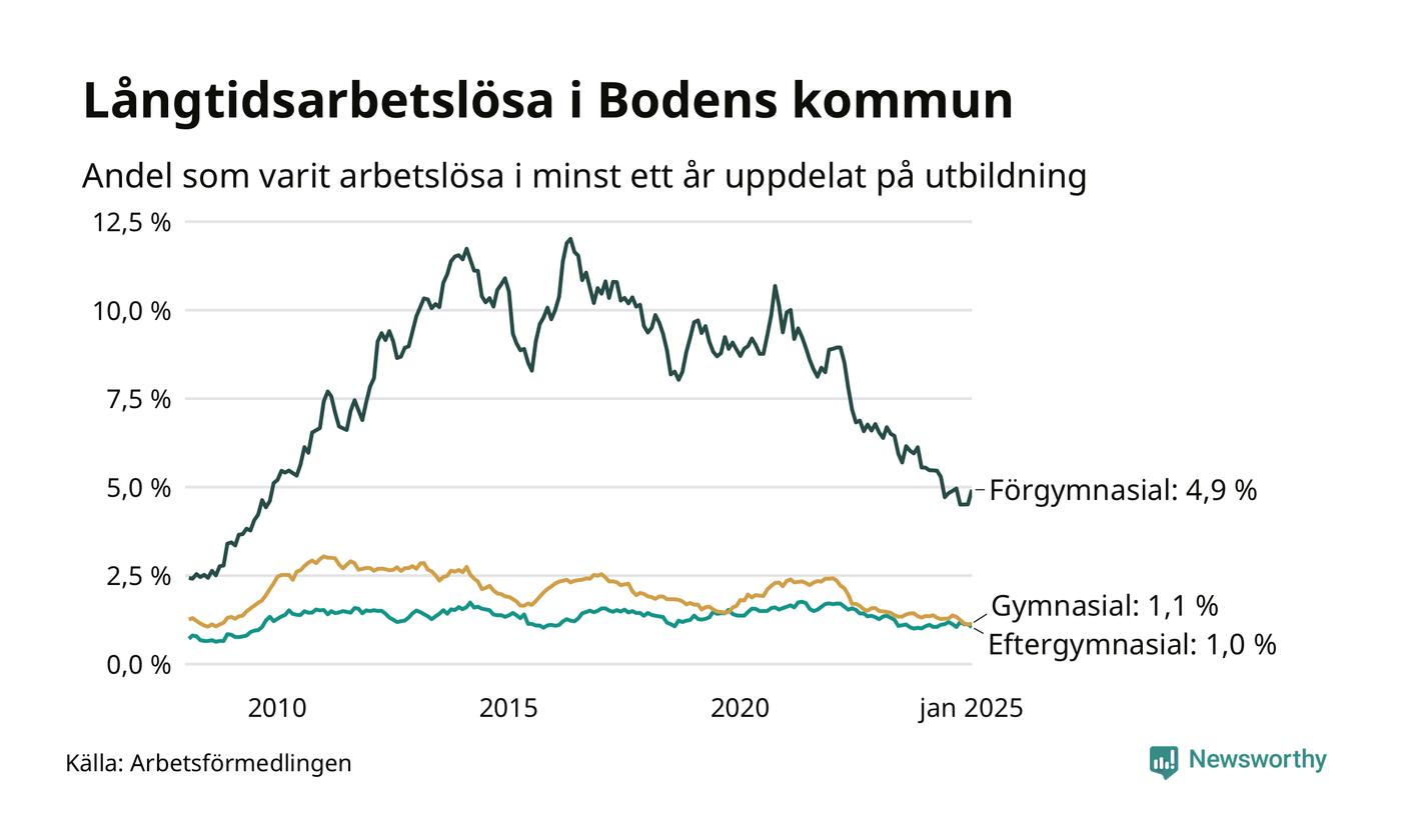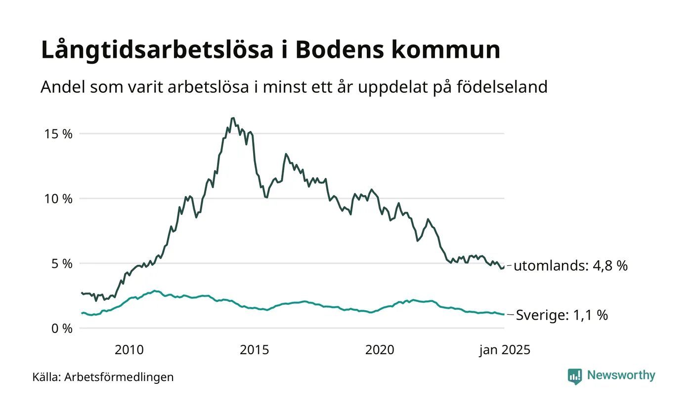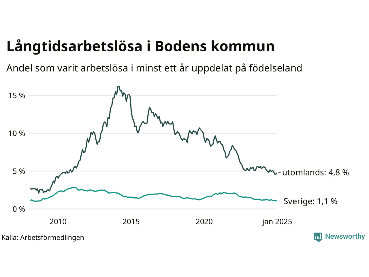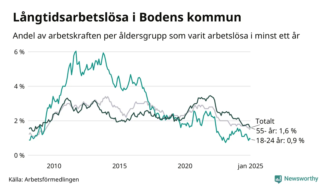 I januari hade 216 Bodenbor varit arbetslösa i minst ett år, vilket är fem fler än månaden innan. Det är den första månaden sedan augusti 2024 som antalet arbetslösa ökar. 216 personer motsvarar 1,6 procent av arbetskraften i kommunen – andelen långtidsarbetslösa är ungefär på samma nivå som för ett år sedan.