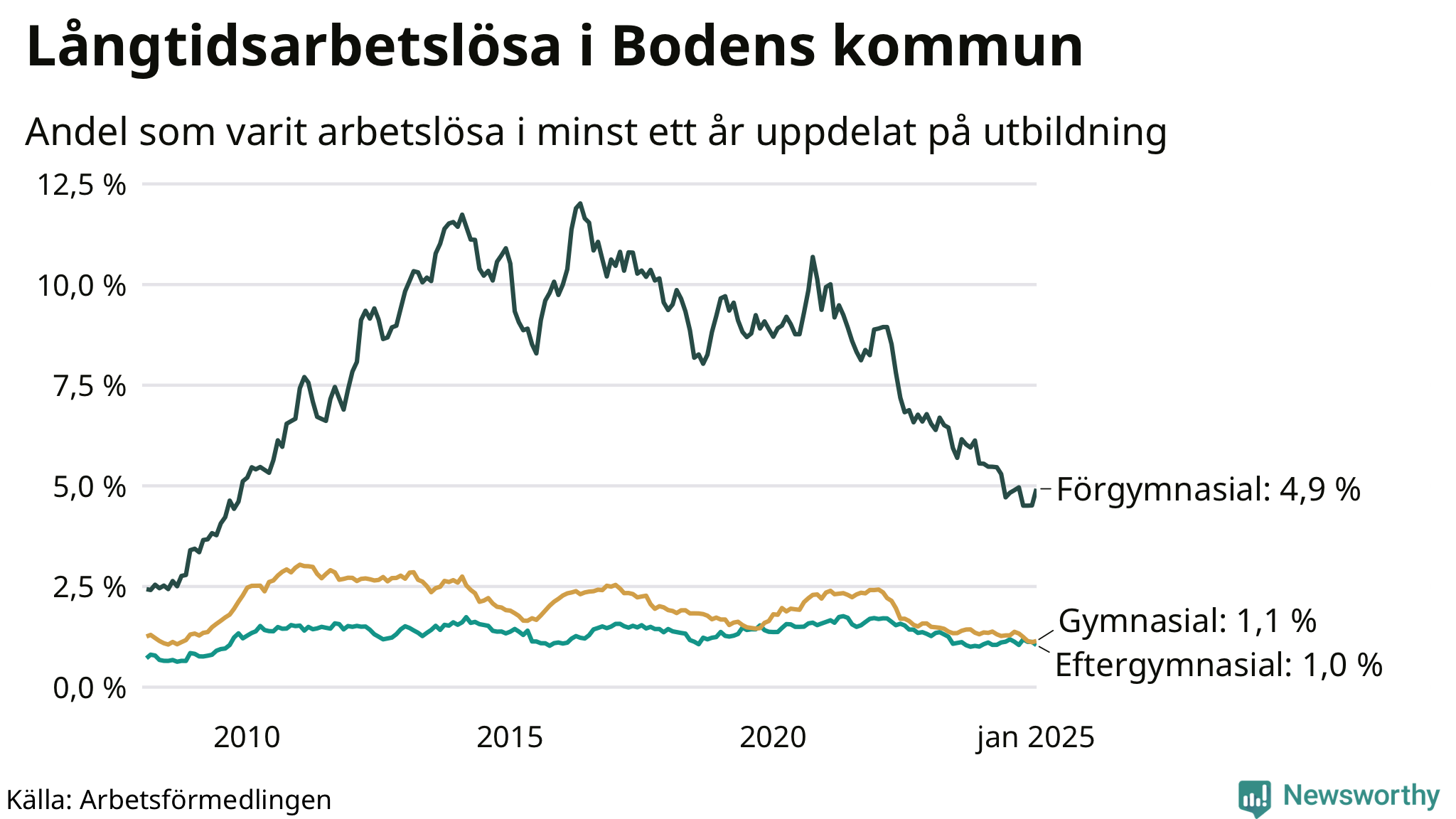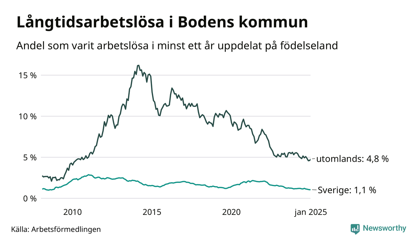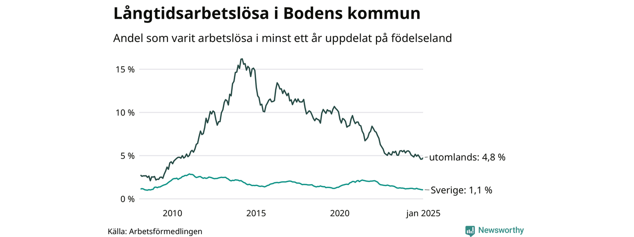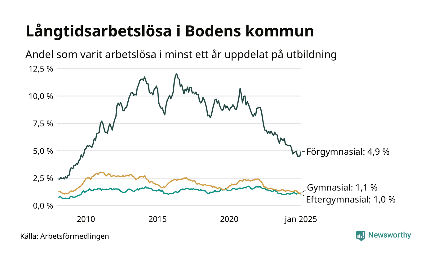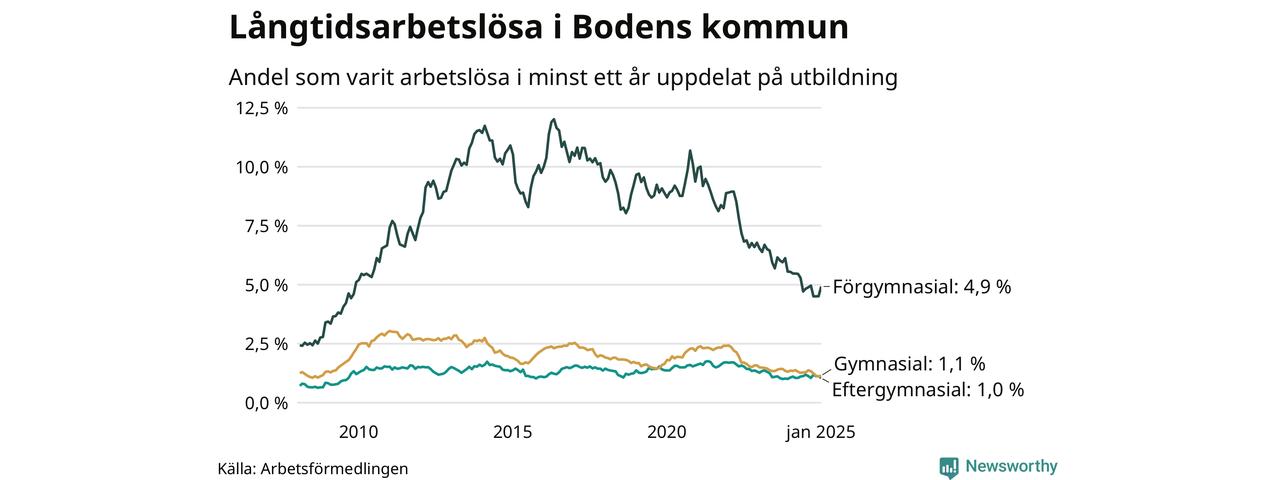I januari hade 216 Bodenbor varit arbetslösa i minst ett år, vilket är fem fler än månaden innan. Det är den första månaden sedan augusti 2024 som antalet arbetslösa ökar. 216 personer motsvarar 1,6 procent av arbetskraften i kommunen – andelen långtidsarbetslösa är ungefär på samma nivå som för ett år sedan.