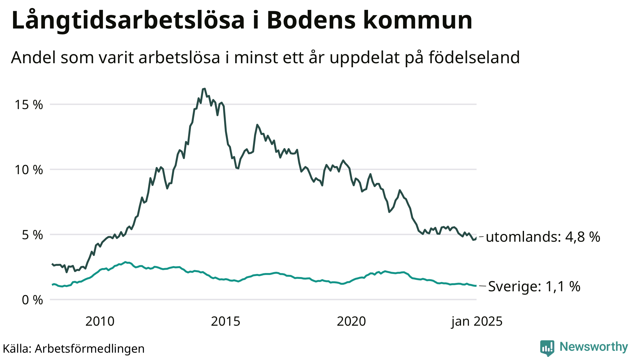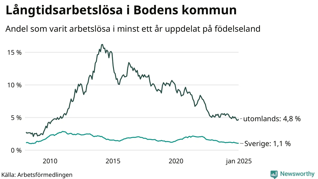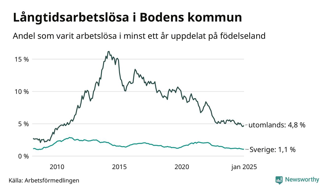 125 av de långtidsarbetslösa i Boden är födda i Sverige, medan 91 är födda utomlands. Det innebär att långtidsarbetslösheten bland Sverigefödda är 1,1 procent, medan den är fyra gånger så hög – 4,8 procent – bland födda utomlands. Även i riket som helhet är arbetslösheten högre bland utrikesfödda.