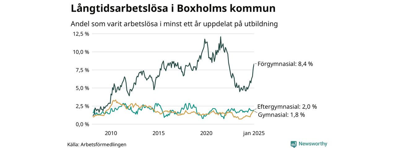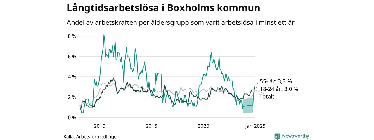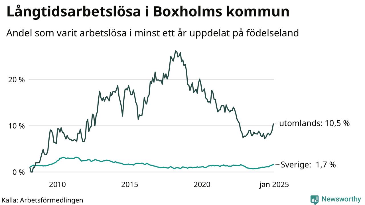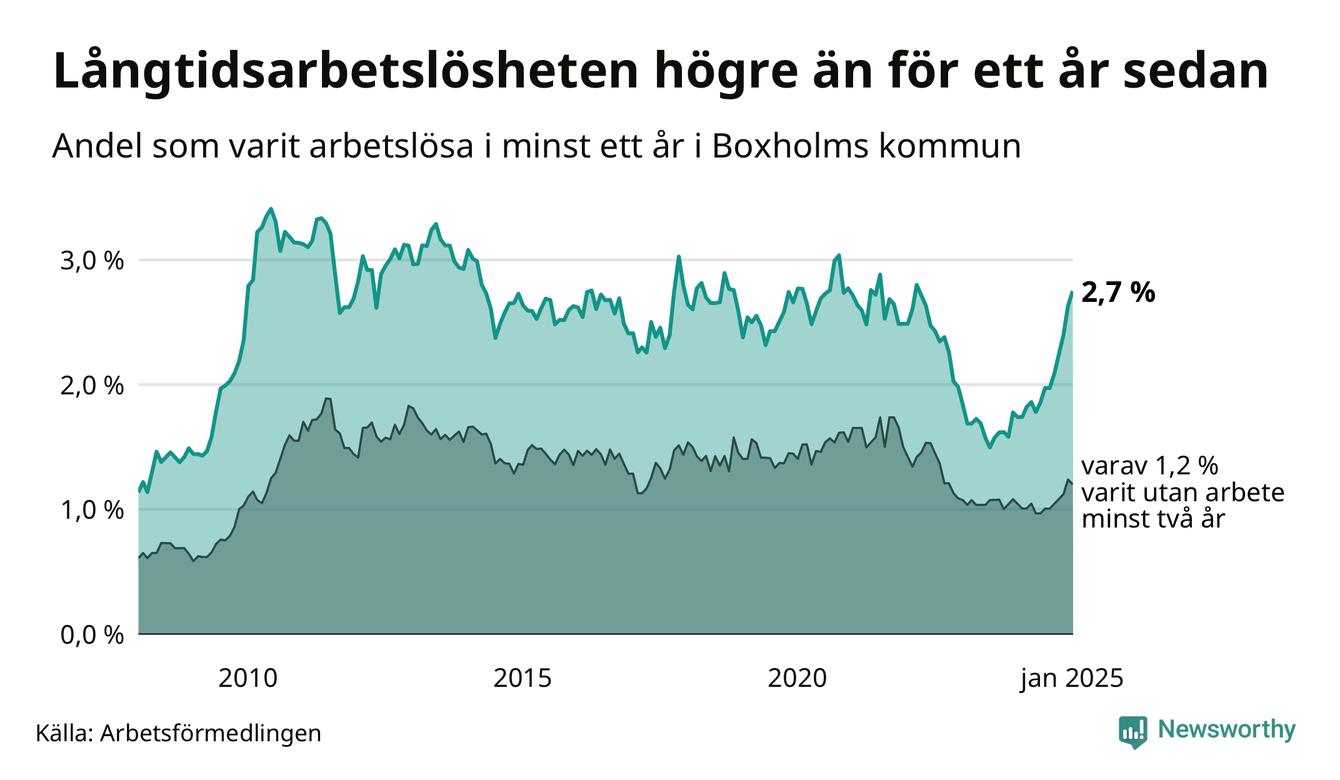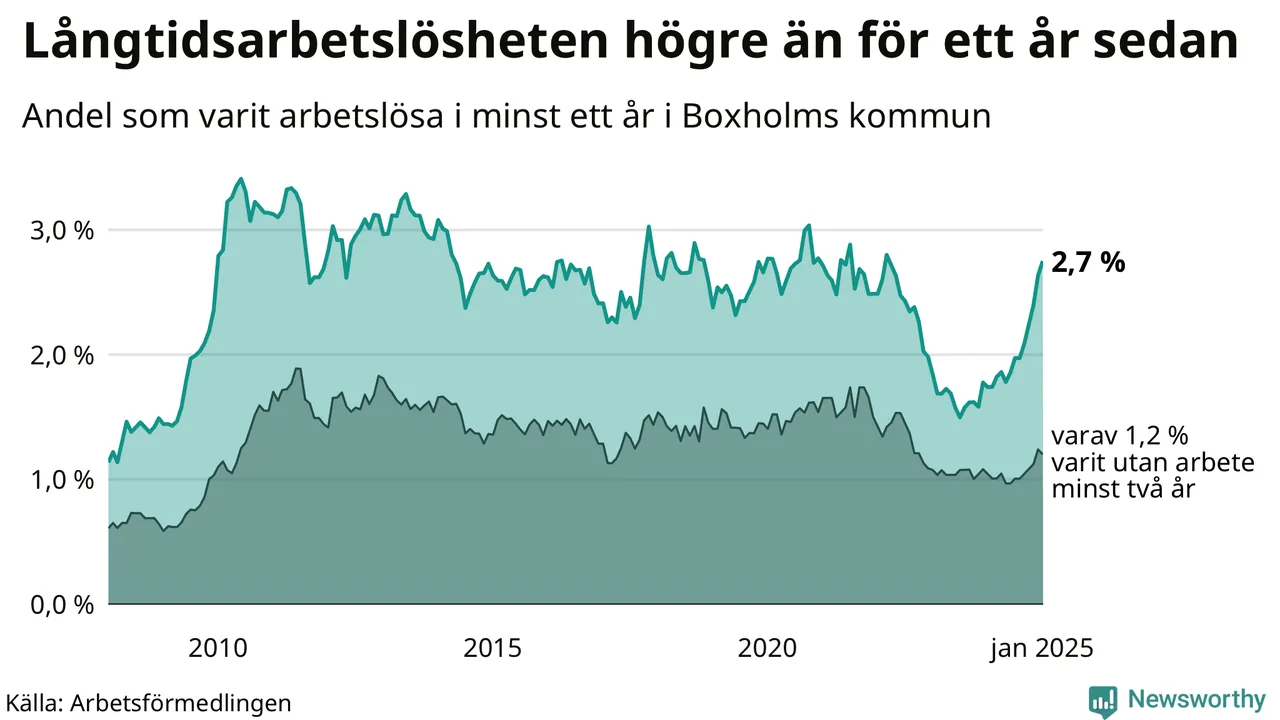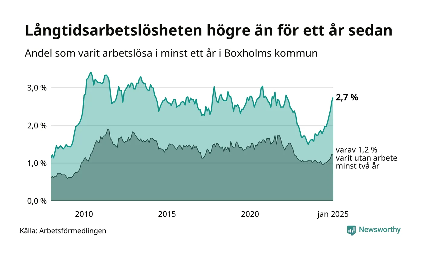 Inte sedan mars 2022 har andelen långtidsarbetslösa varit så hög i Boxholm. Det visar Arbetsförmedlingens senaste månadsstatistik.