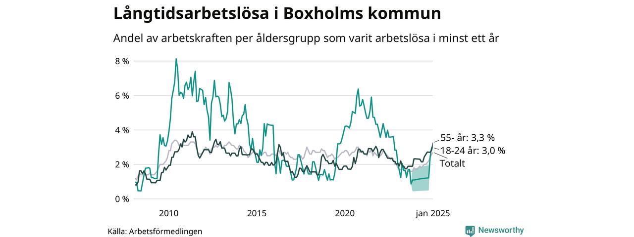 Av de 71 personerna som varit arbetslösa i mer än ett år i Boxholms kommun är 23 personer mellan 55 och 651 år och sex är mellan 18 och 24 år. För den äldre gruppen är andelen arbetslösa 3,3 procent medan den i den yngre gruppen är 3,0 procent. Även i riket som helhet är långtidsarbetslösheten högre i gruppen äldre.