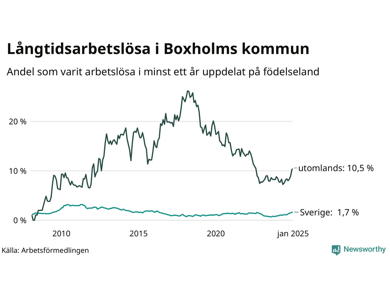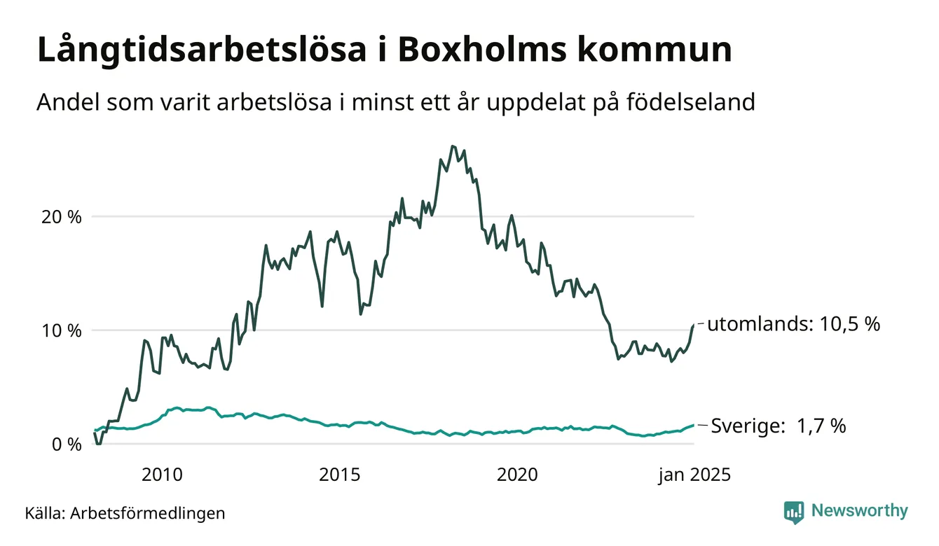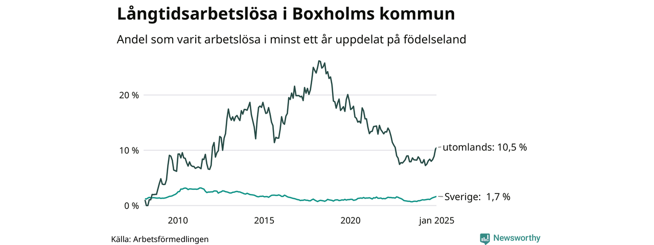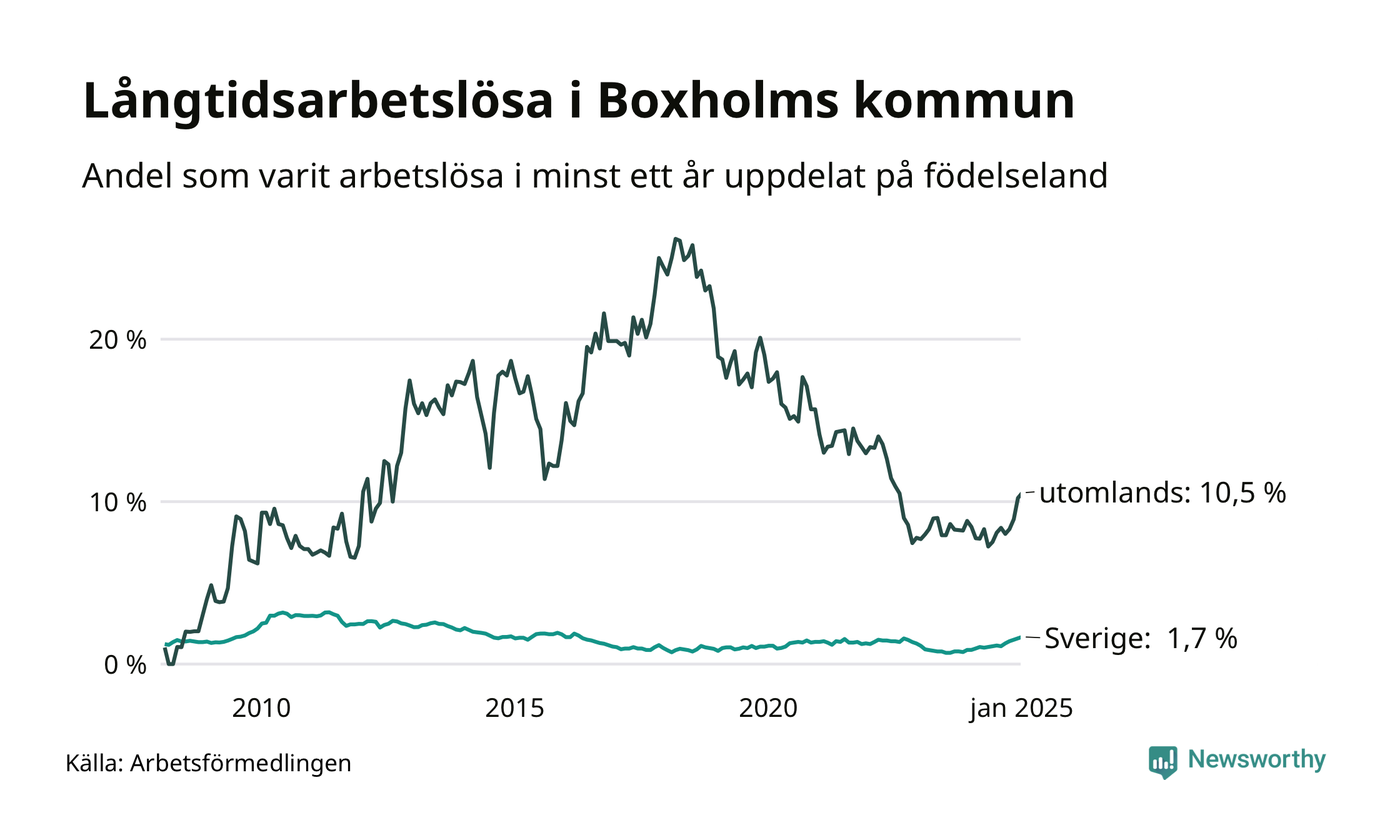 38 av de långtidsarbetslösa i Boxholm är födda i Sverige, medan 33 är födda utomlands. Det innebär att långtidsarbetslösheten bland Sverigefödda är 1,7 procent, medan den är sex gånger så hög – 10,5 procent – bland födda utomlands. Även i riket som helhet är arbetslösheten högre bland utrikesfödda.