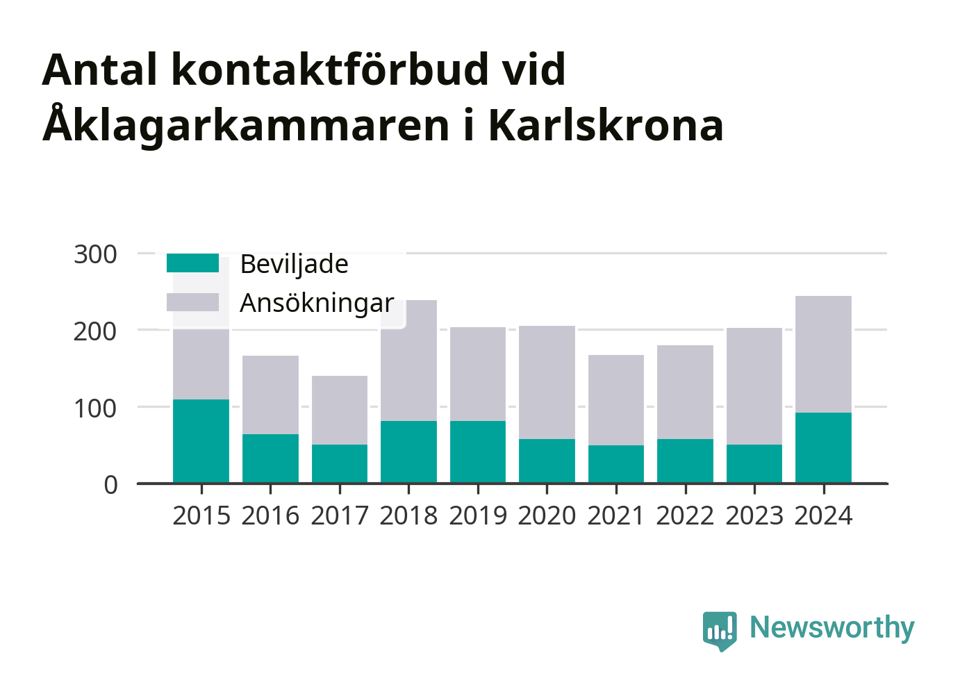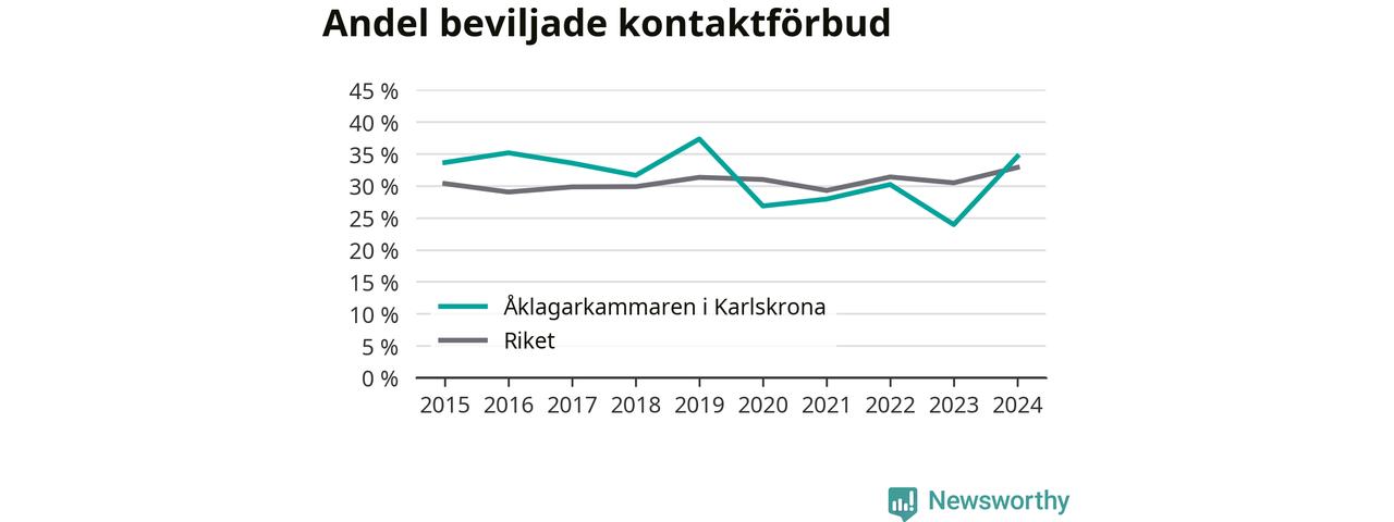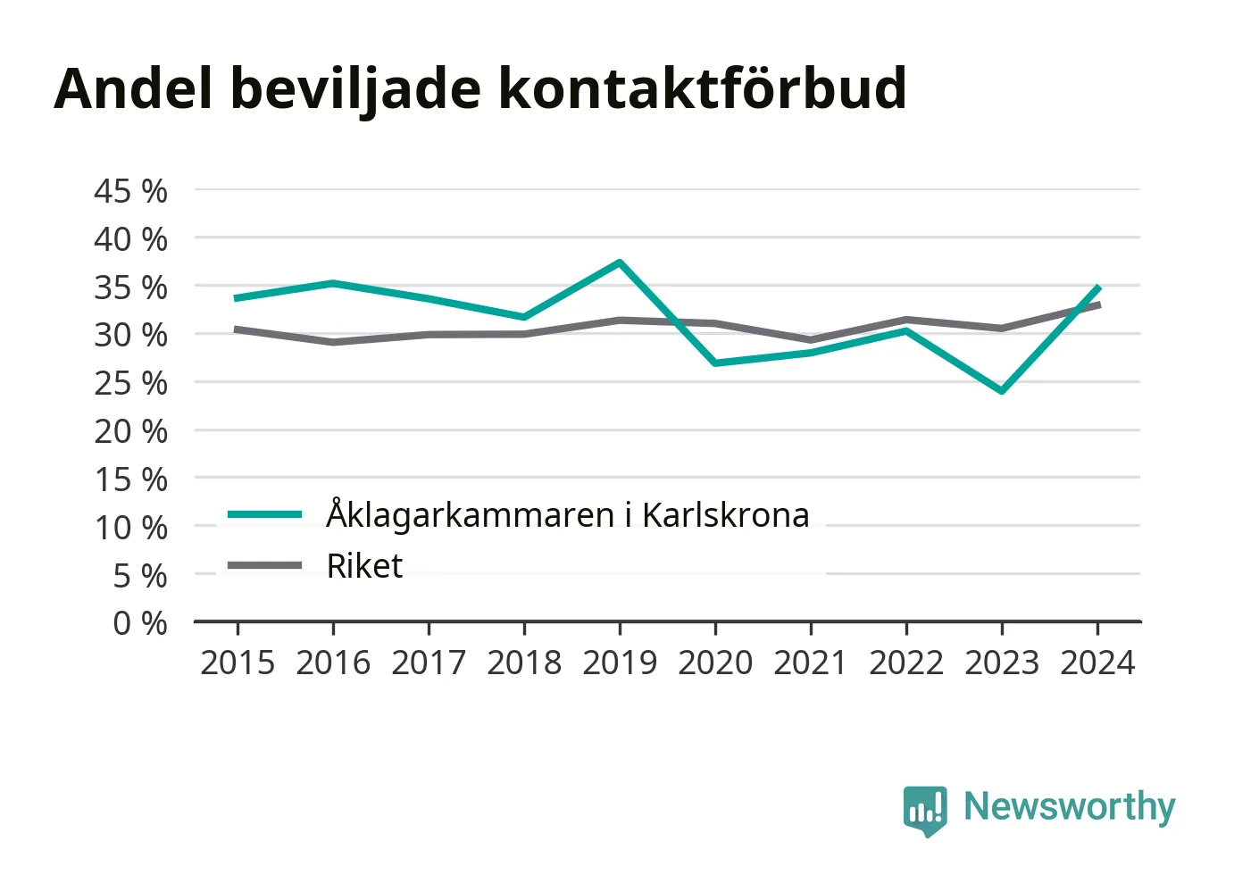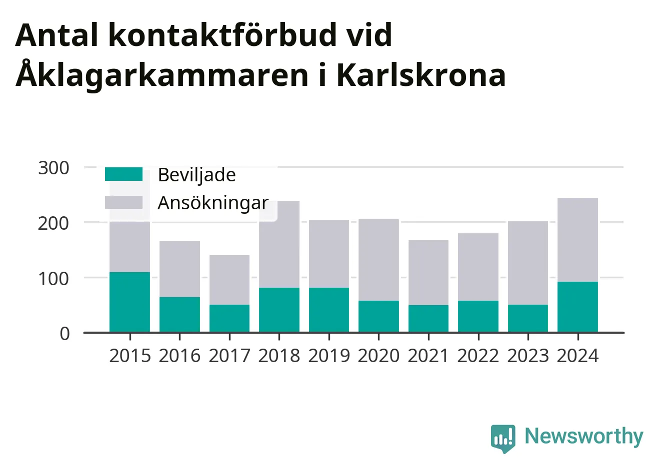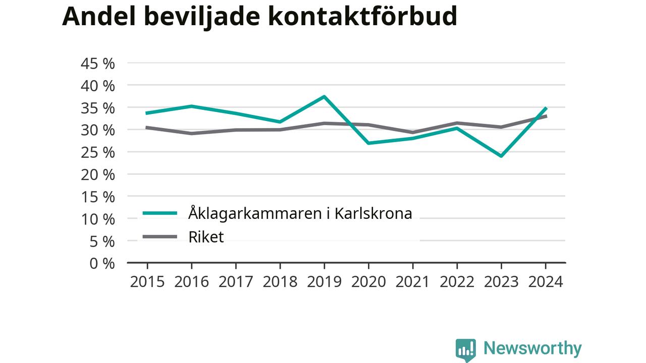 Av alla ansökningar om kontaktförbud har ungefär en tredjedel godkänts vid åklagarkammaren i Karlskrona, som täcker Blekinge län, de senaste tio åren. I fjol fick 35 procent av ansökningarna bifall. Det kan jämföras med 30 procent i hela landet.