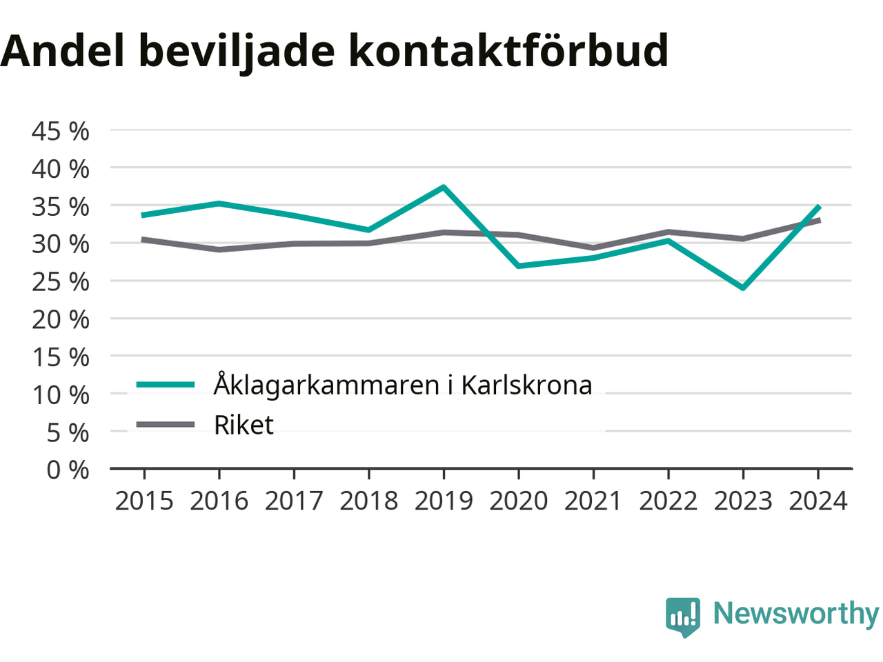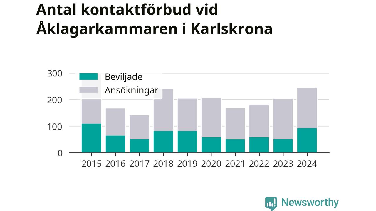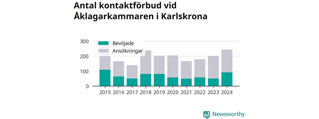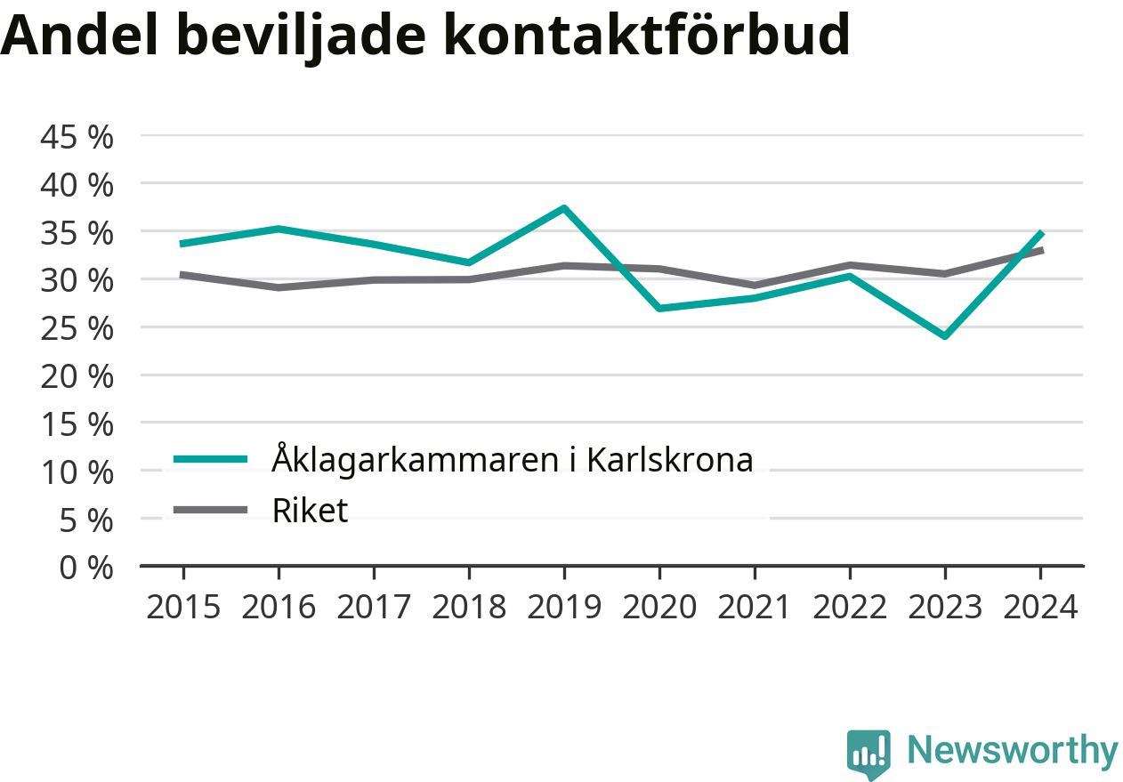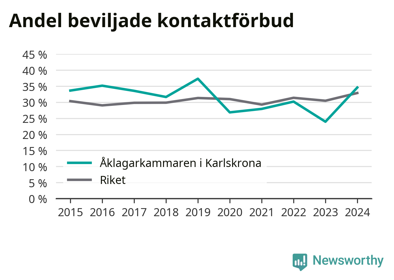 Av alla ansökningar om kontaktförbud har ungefär en tredjedel godkänts vid åklagarkammaren i Karlskrona, som täcker Blekinge län, de senaste tio åren. I fjol fick 35 procent av ansökningarna bifall. Det kan jämföras med 30 procent i hela landet.