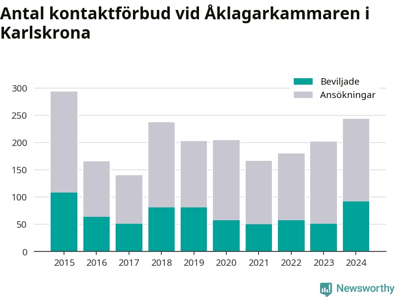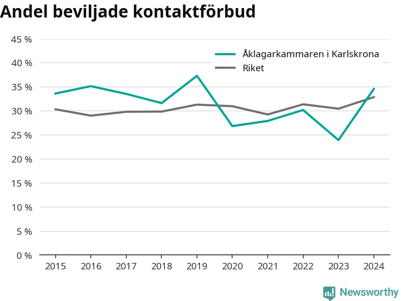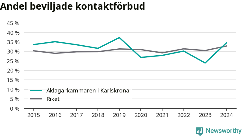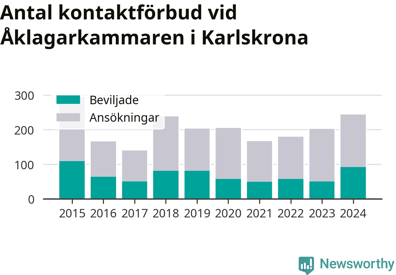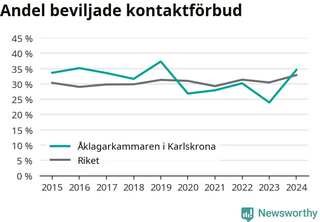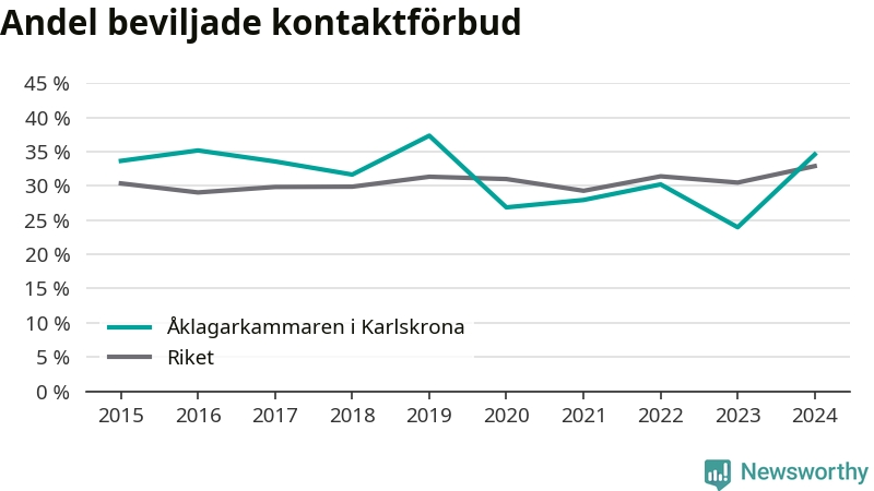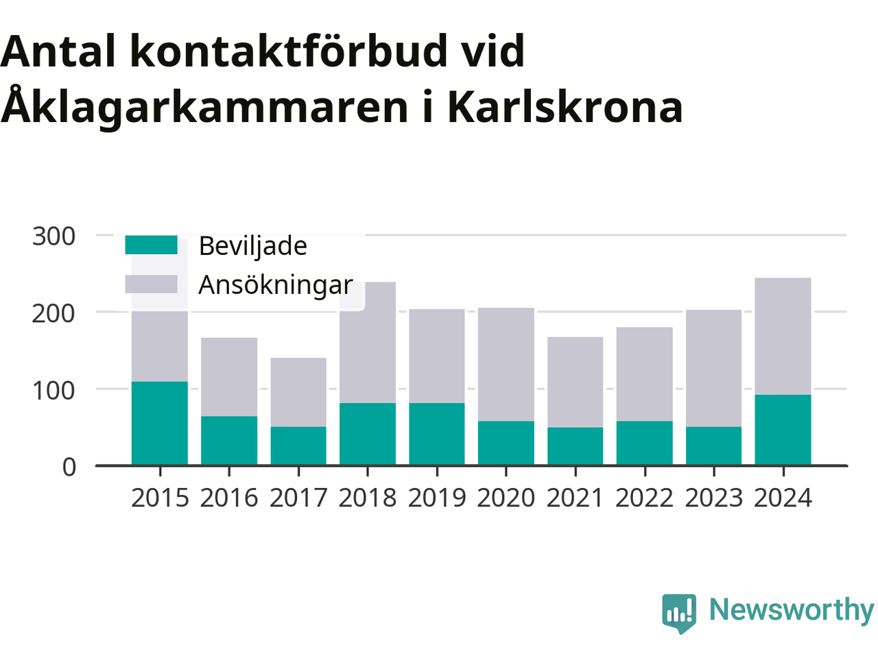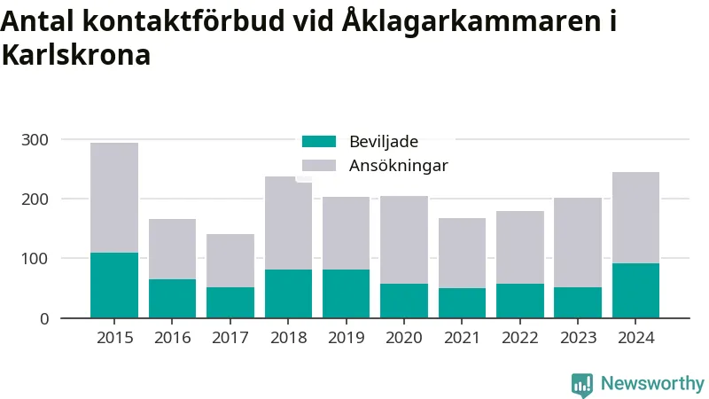 Av alla ansökningar om kontaktförbud har ungefär en tredjedel godkänts vid åklagarkammaren i Karlskrona, som täcker Blekinge län, de senaste tio åren. I fjol fick 35 procent av ansökningarna bifall. Det kan jämföras med 30 procent i hela landet.