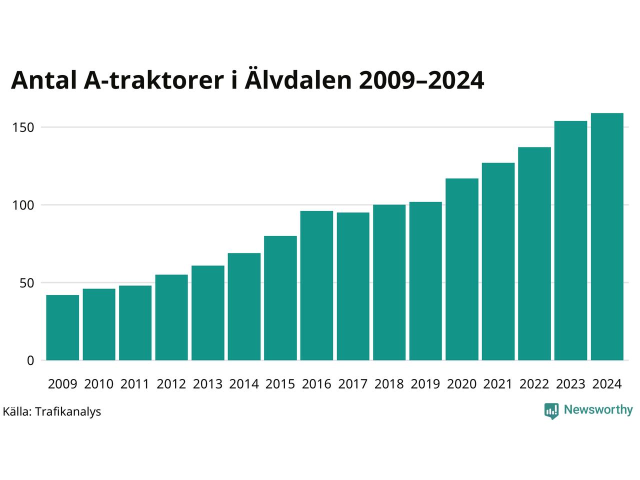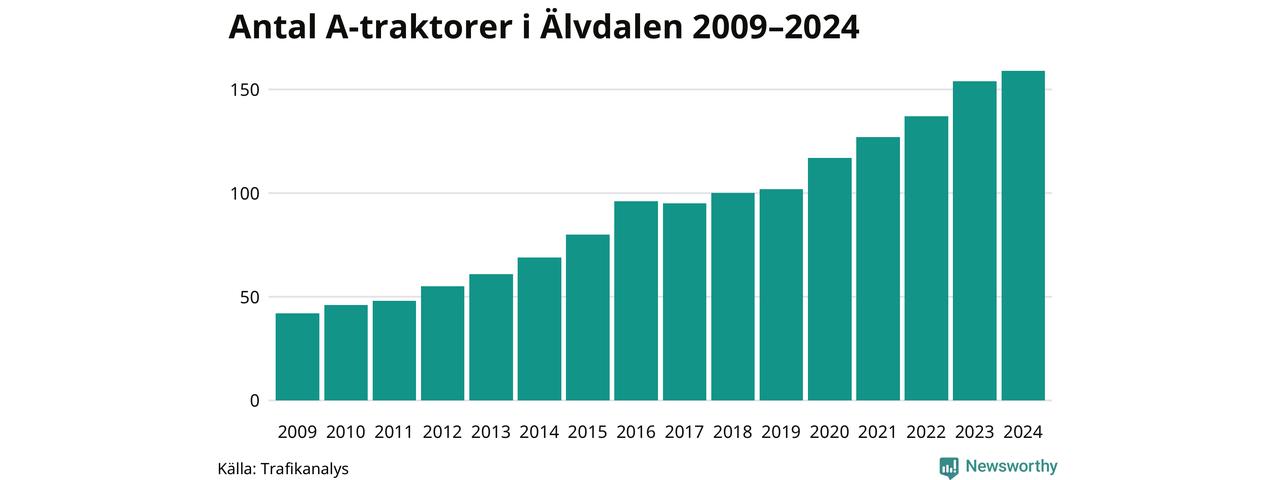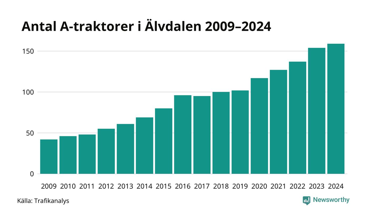 För sjunde året i rad ökar antalet A-traktorer i Älvdalens kommun, visar nya siffror från Trafikanalys. I slutet av 2024 fanns 159 A-traktorer registrerade i kommunen. Inte sedan åtminstone 2009, som är det första året vi har statistik för, har det funnits så många A-traktorer i kommunen.